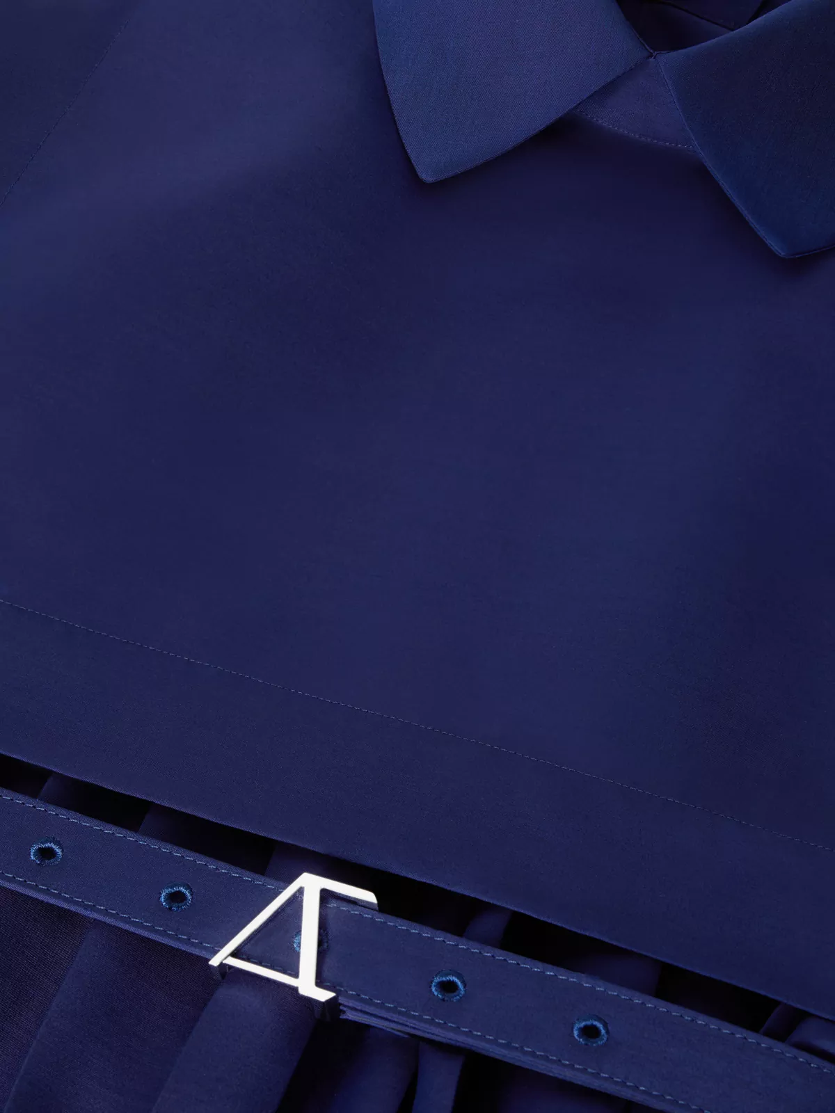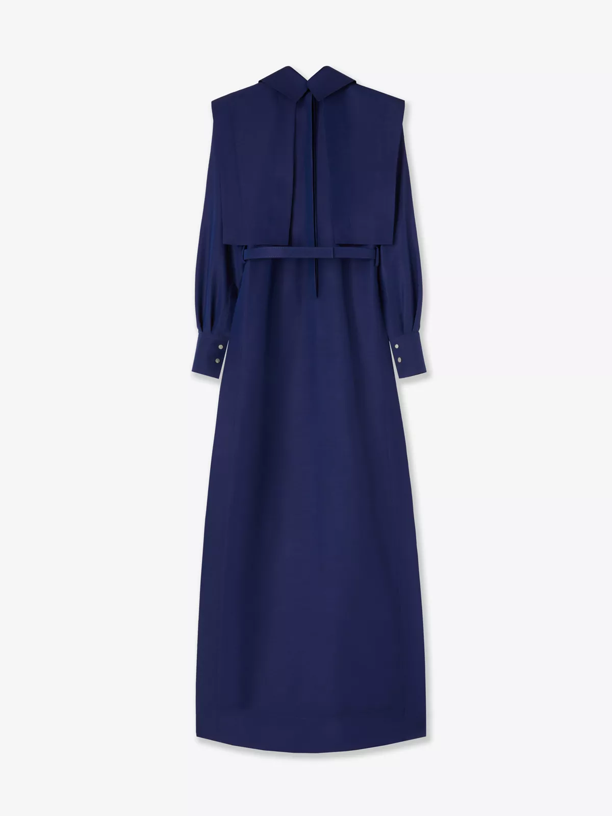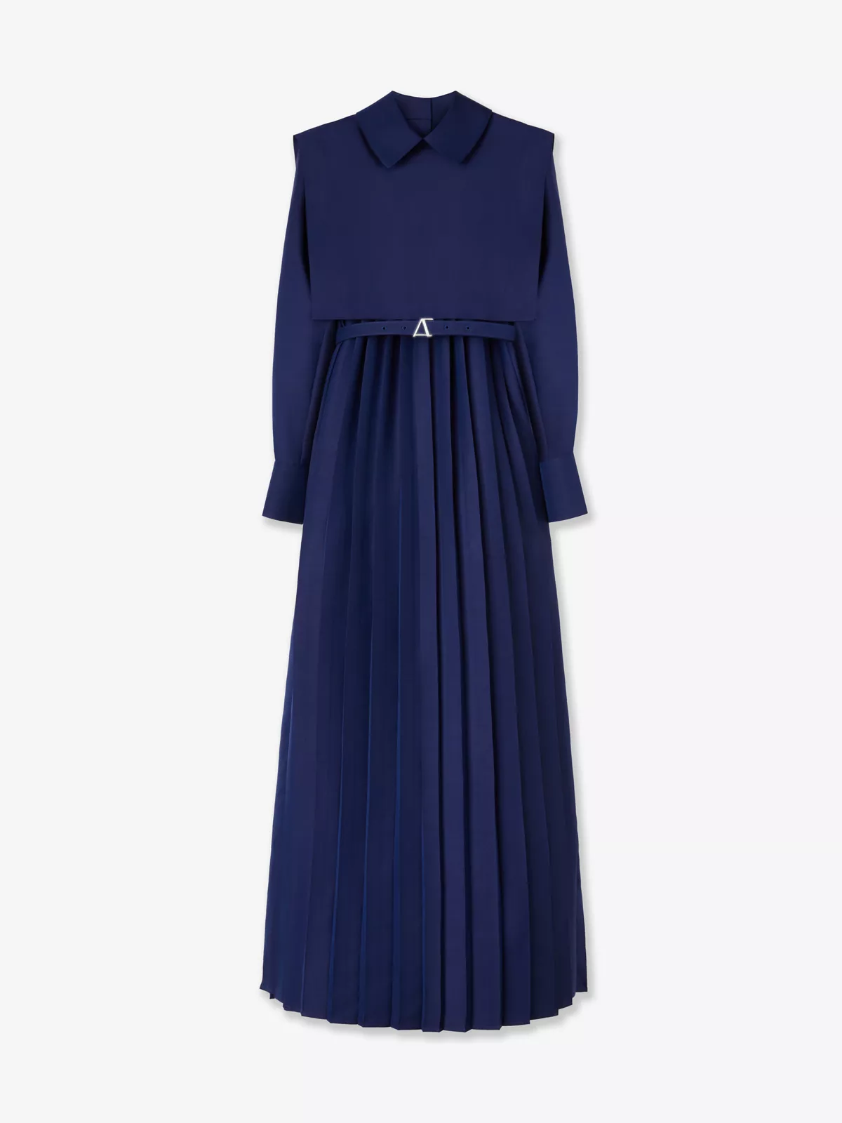 This elegant virgin-wool-blend long-sleeved dress has a long, flowing silhouette with a belted waist, a full pleated skirt, a shirt collar and plastron.
