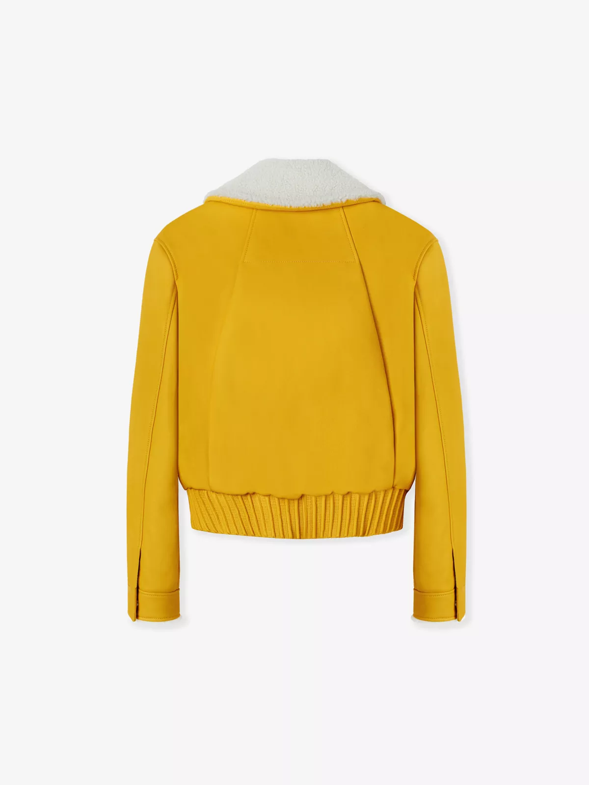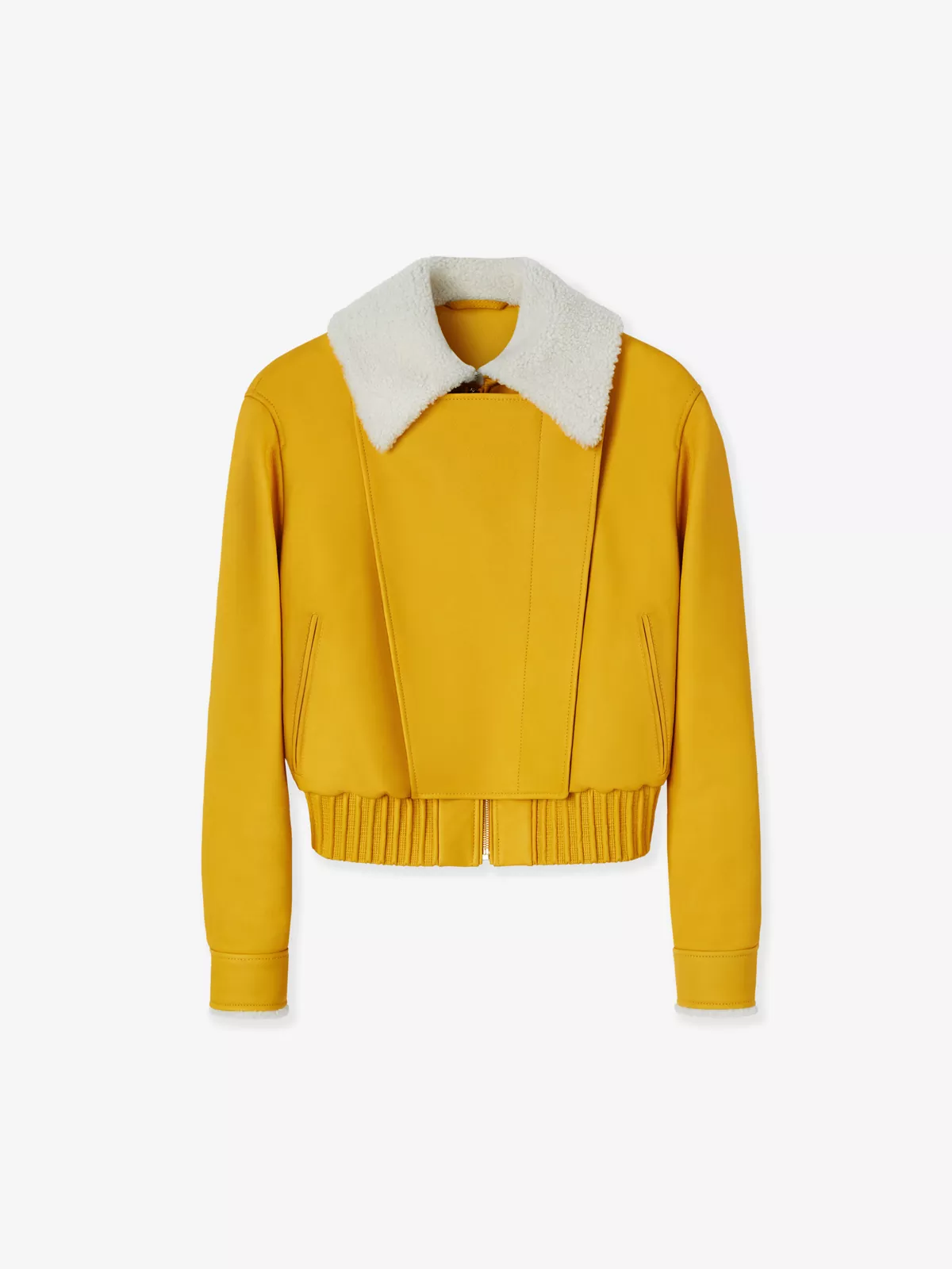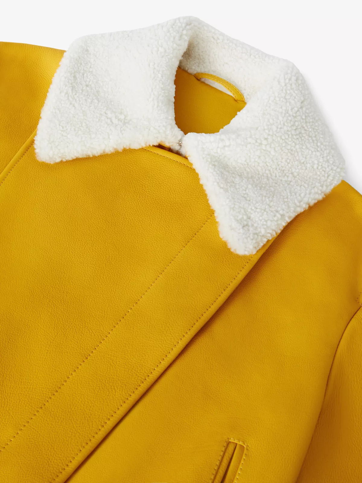Designed in a textured grainy leather with a contrasting shearling shirt-style collar, this standout cropped blouson has a concealed front zip closure and two side pockets.