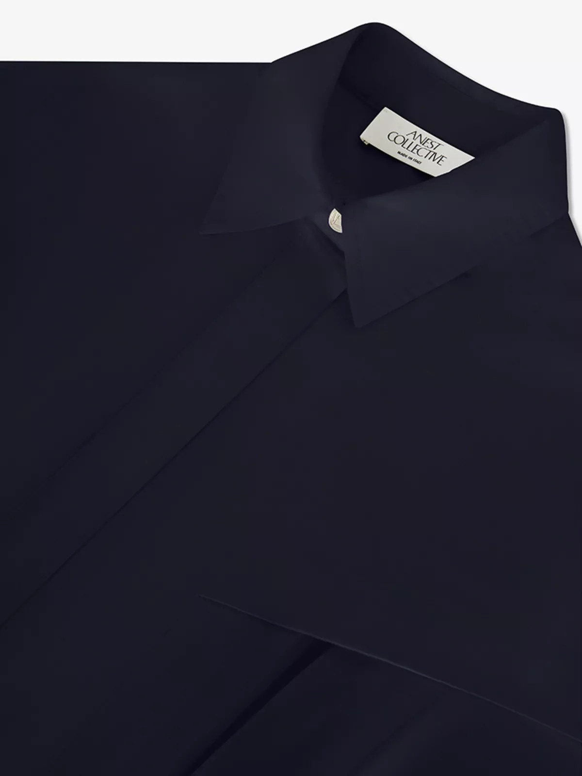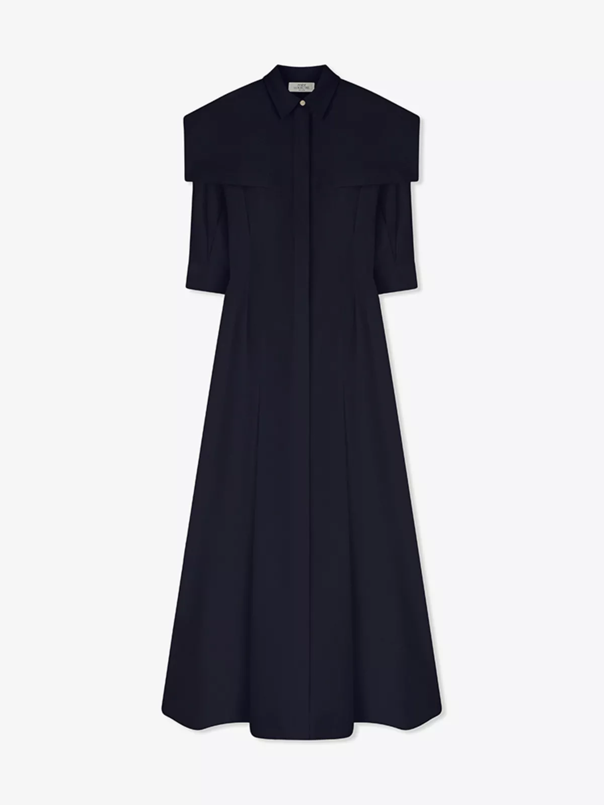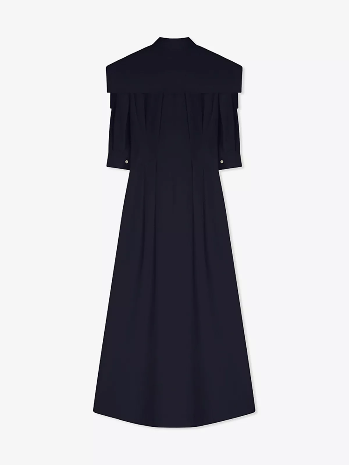 Floor-length chemisier dress in cotton-poplin with top-stitched pleats, a cape detail, and a concealed button fastening with a visible metal button on the collar.