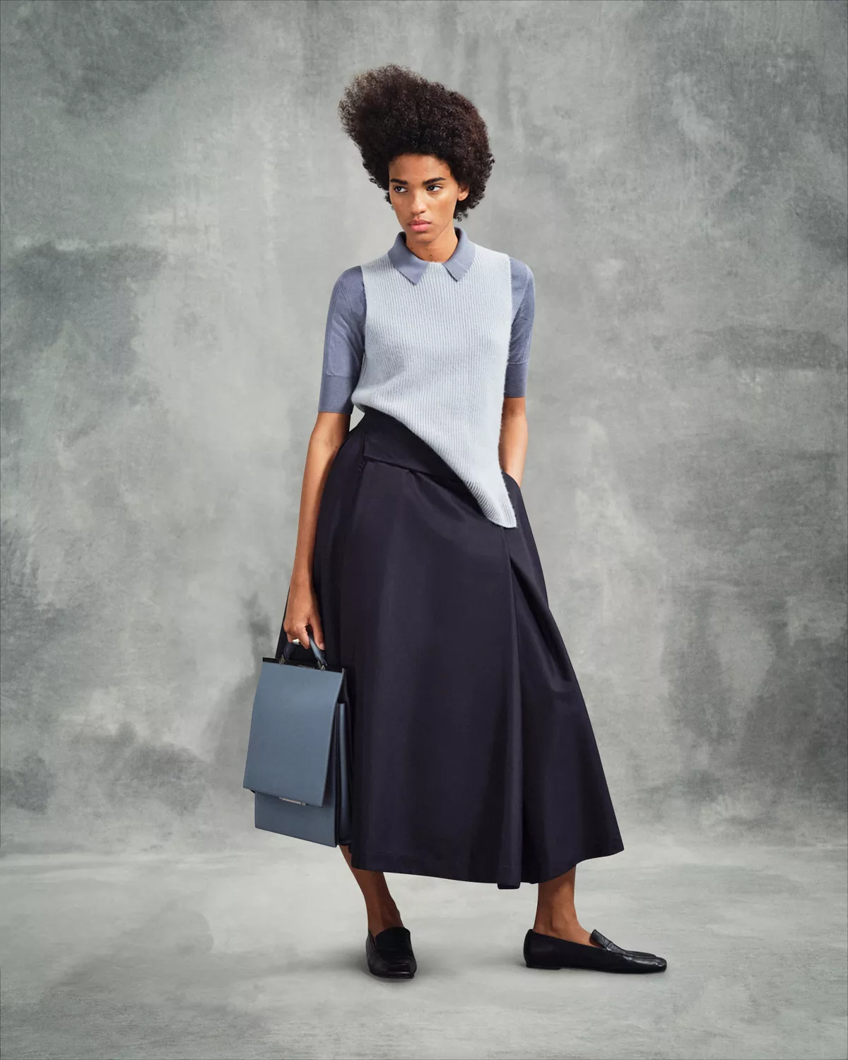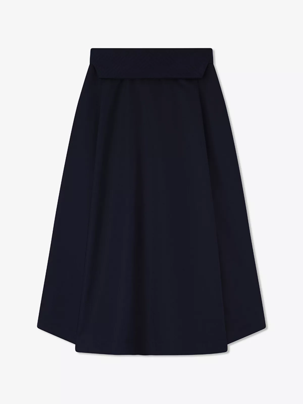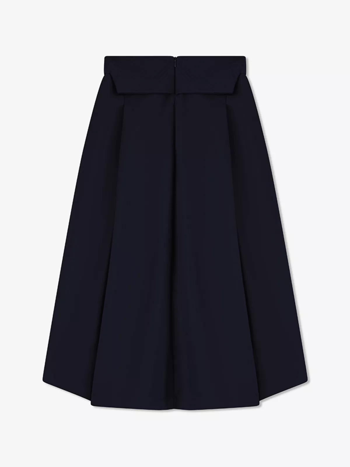 Nylon-wool flared midi skirt with quilted corsetry detail, layered pleat detailing and side pockets.