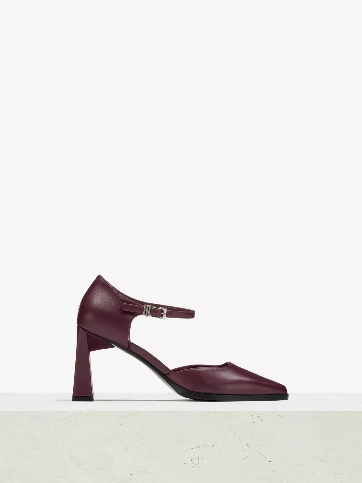 Designed in a soft brushed leather using the finest Italian craftsmanship, this high-heeled pump has a classic square-toed silhouette, an ankle strap and a jewel-polished buckle detail.