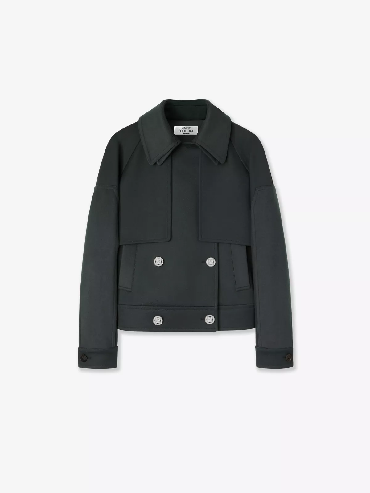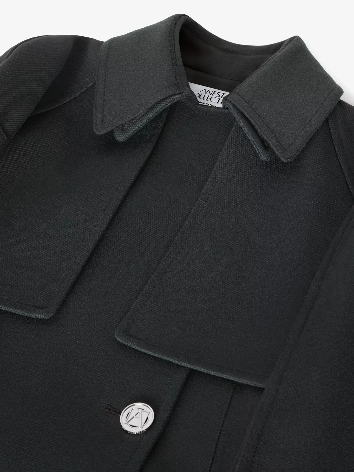 Soft-silver metal button closure with ANEST COLLECTIVE logo