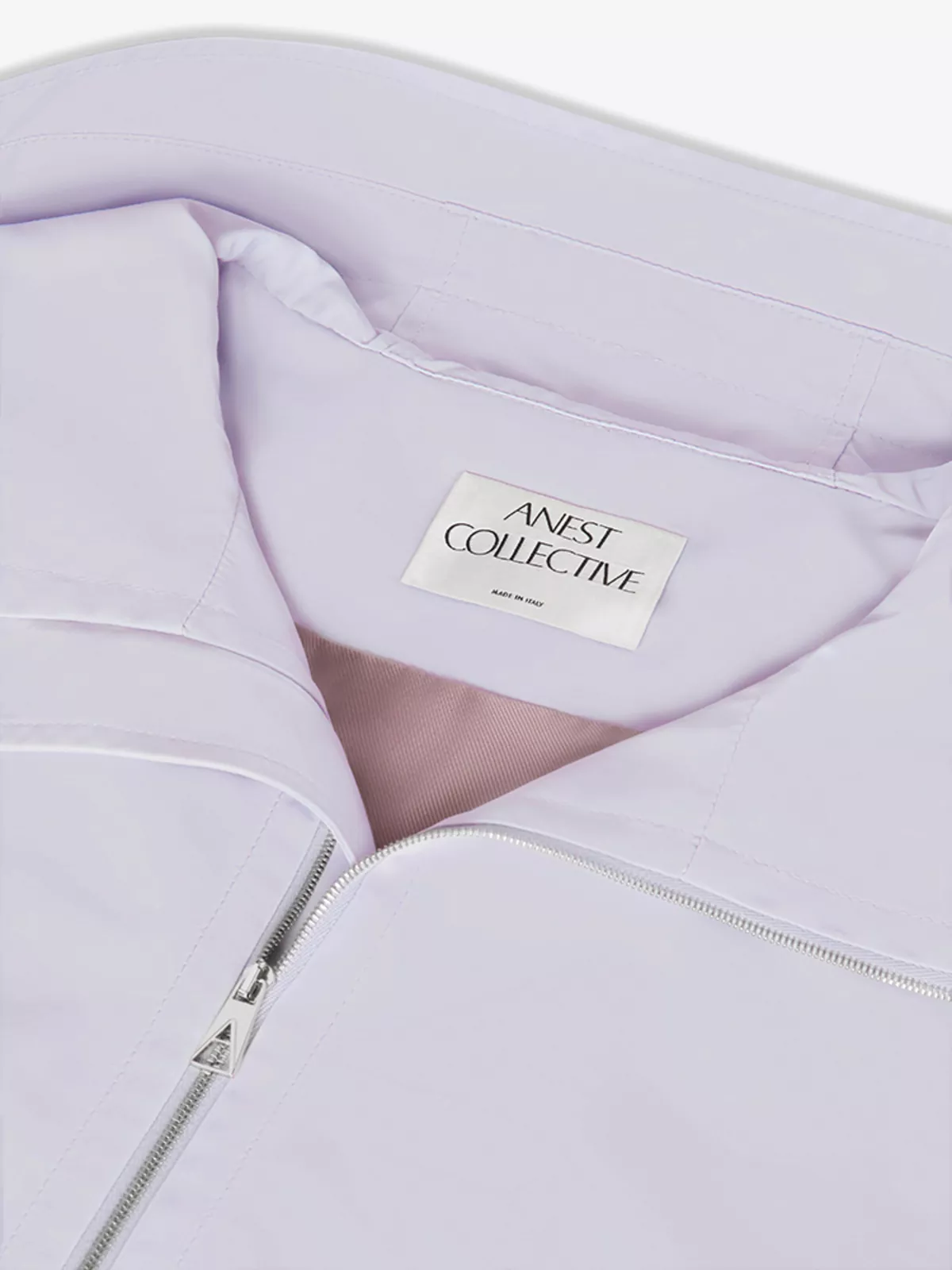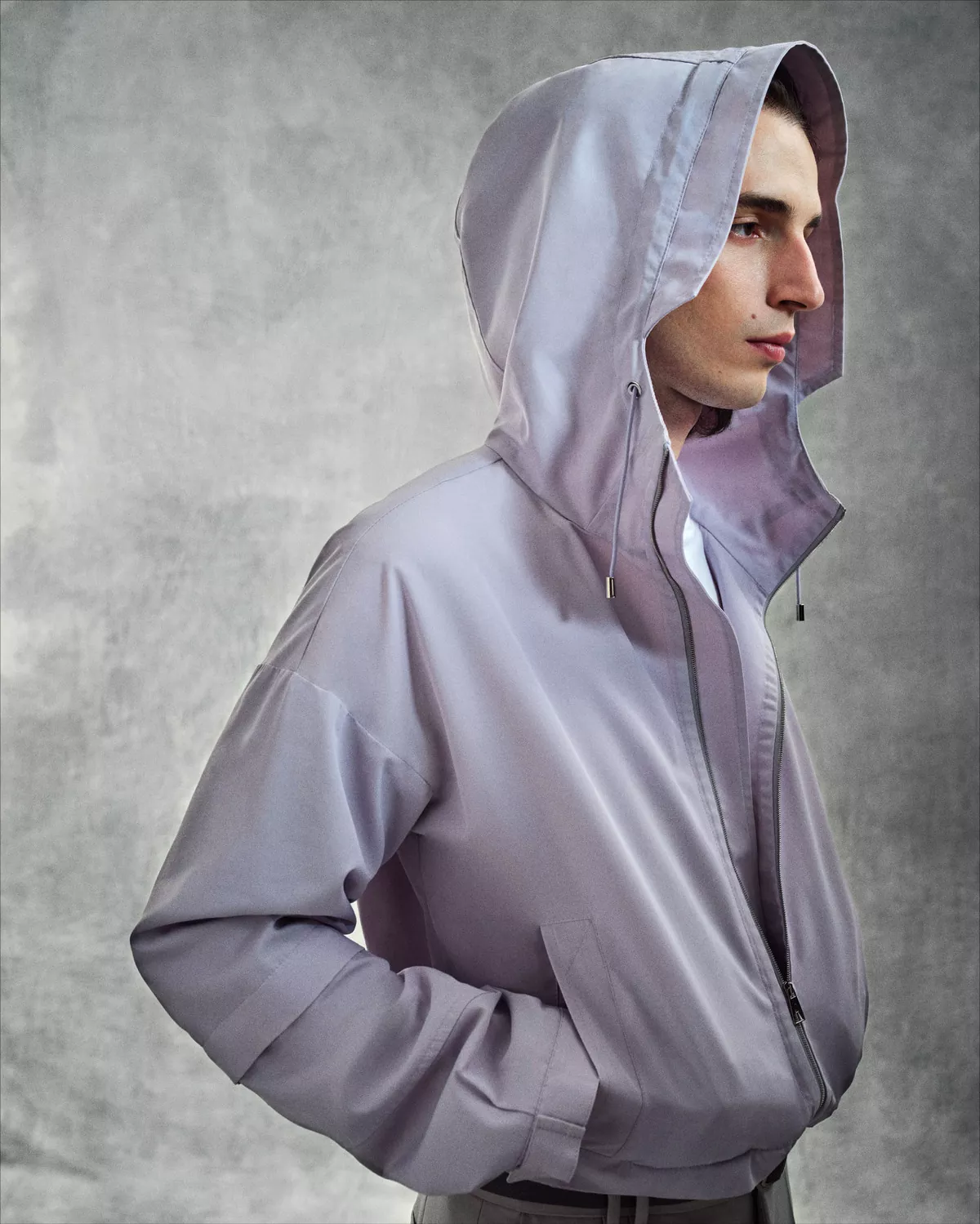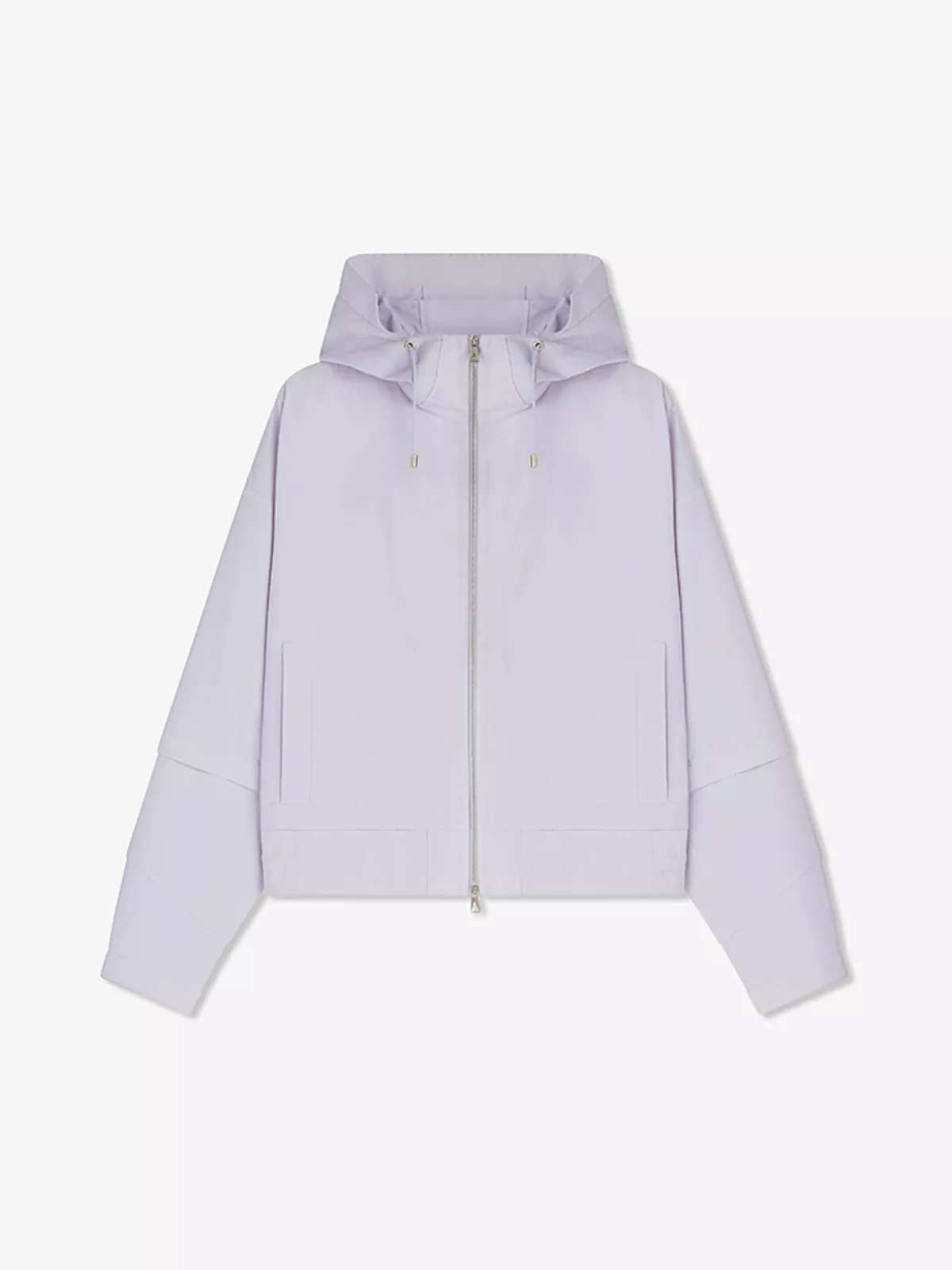 Hooded zip-through blouson in tight-weave nylon-wool that has a double-layer effect and detachable sleeves. It has an adjustable drawstring waist.