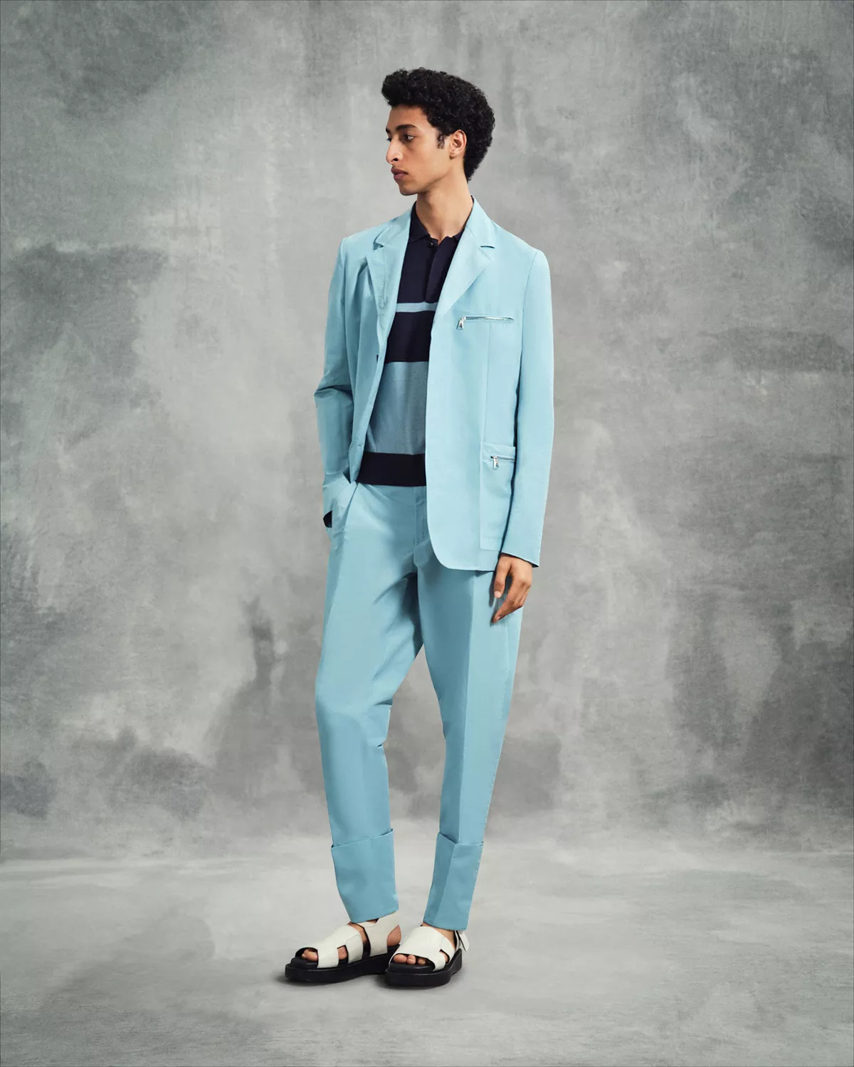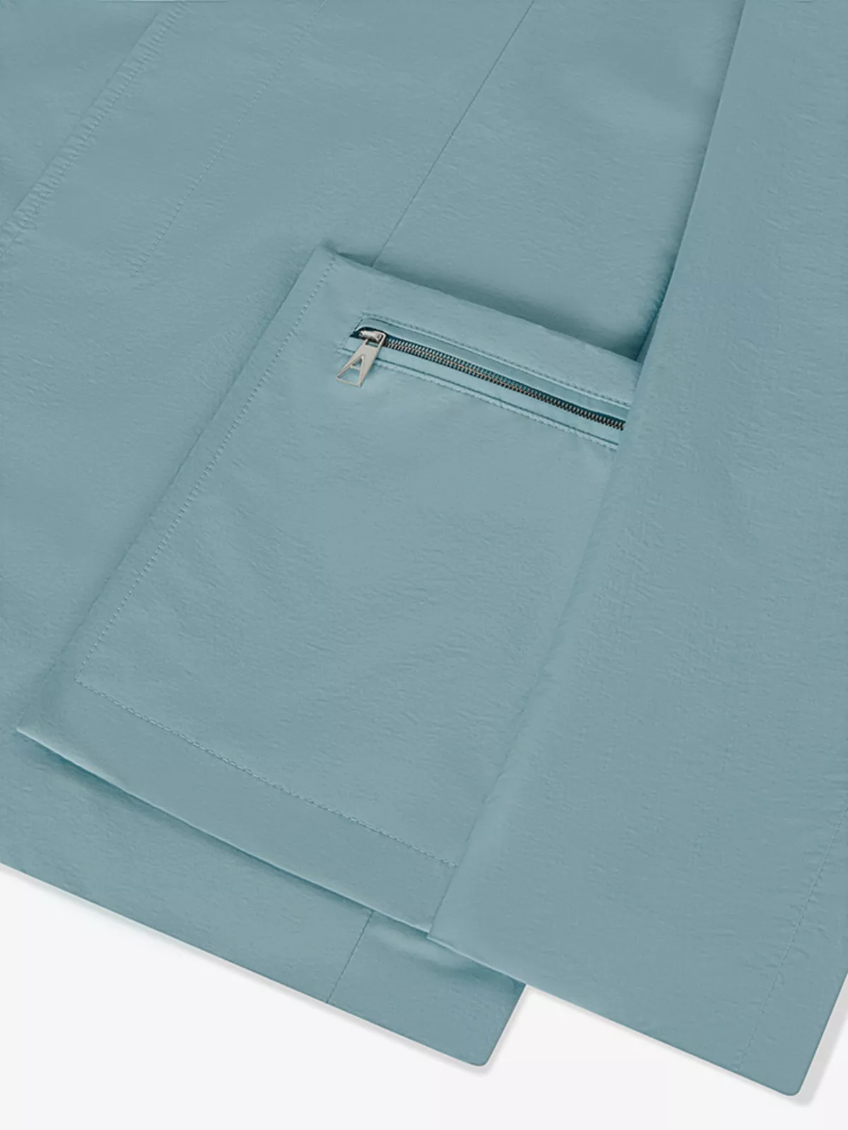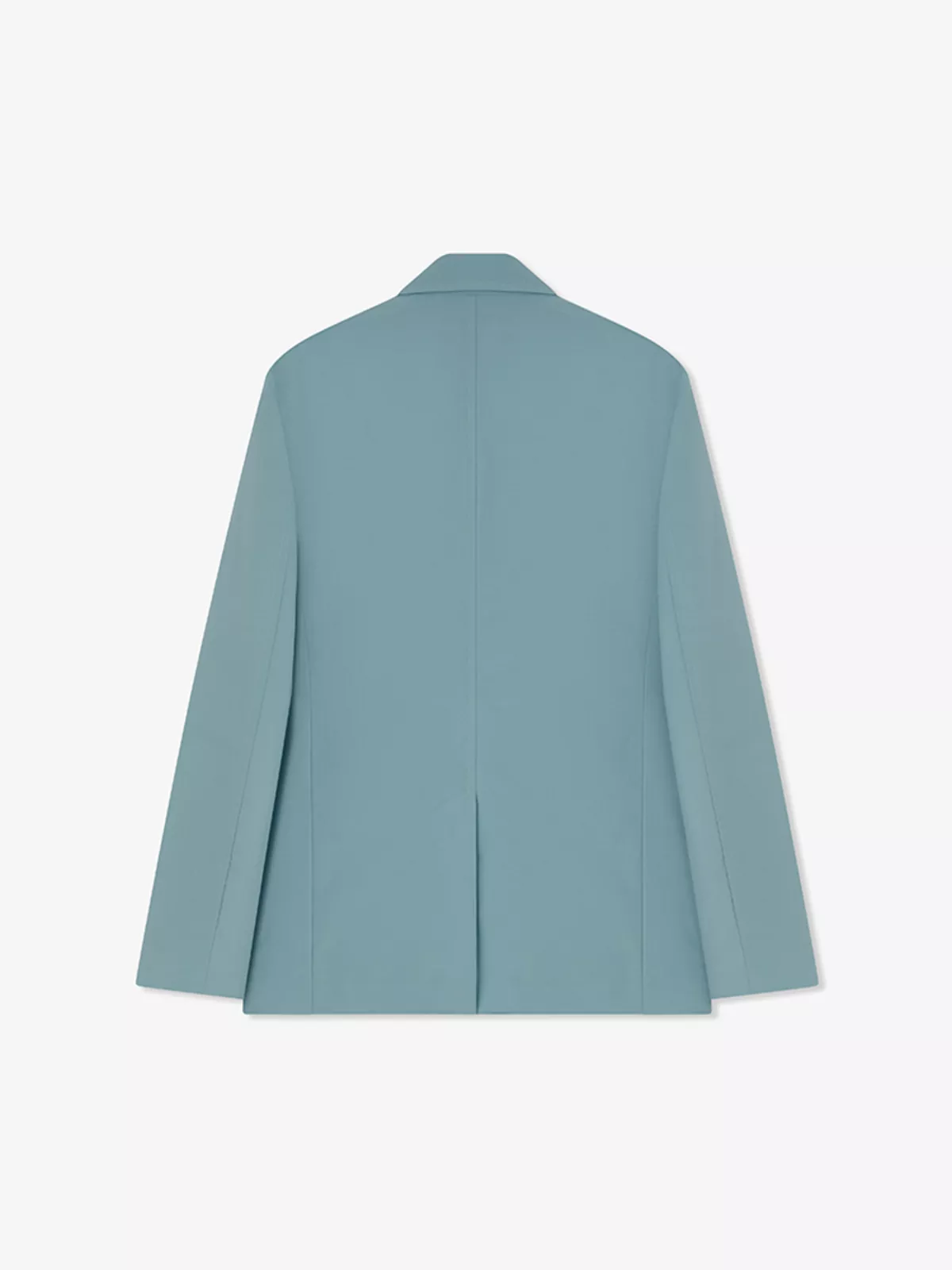 Single-breasted jacket in virgin wool with a pleated front panel with zig-zag top-stitching details. It also has top-stitching on the lapels, back and front hems.