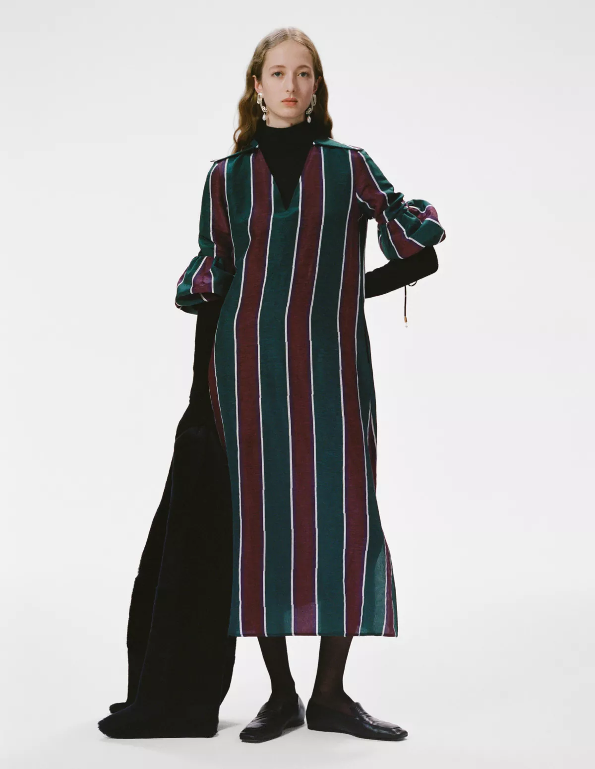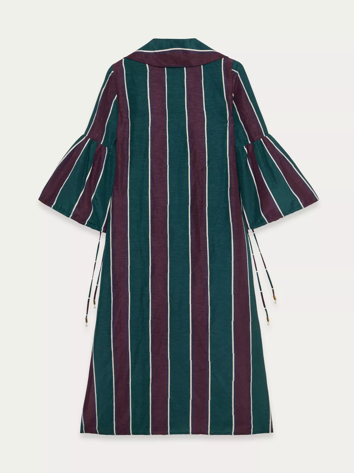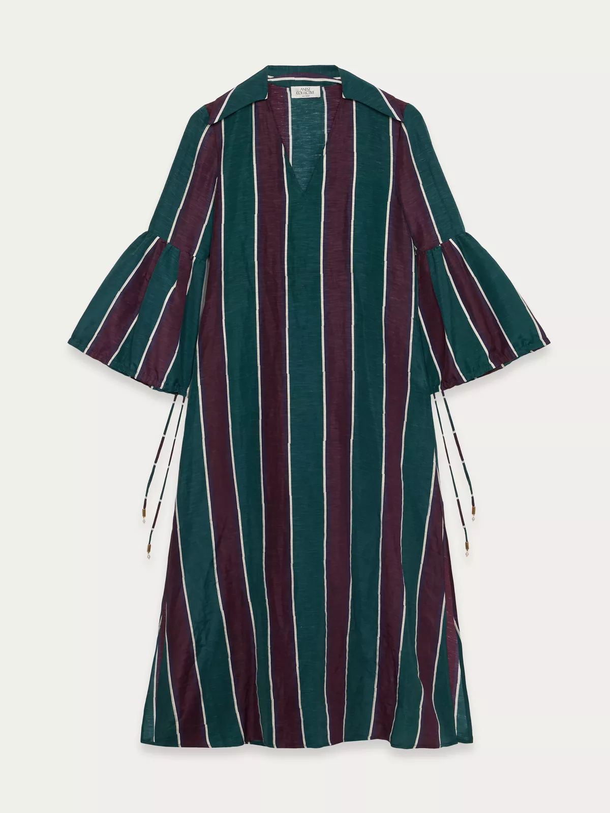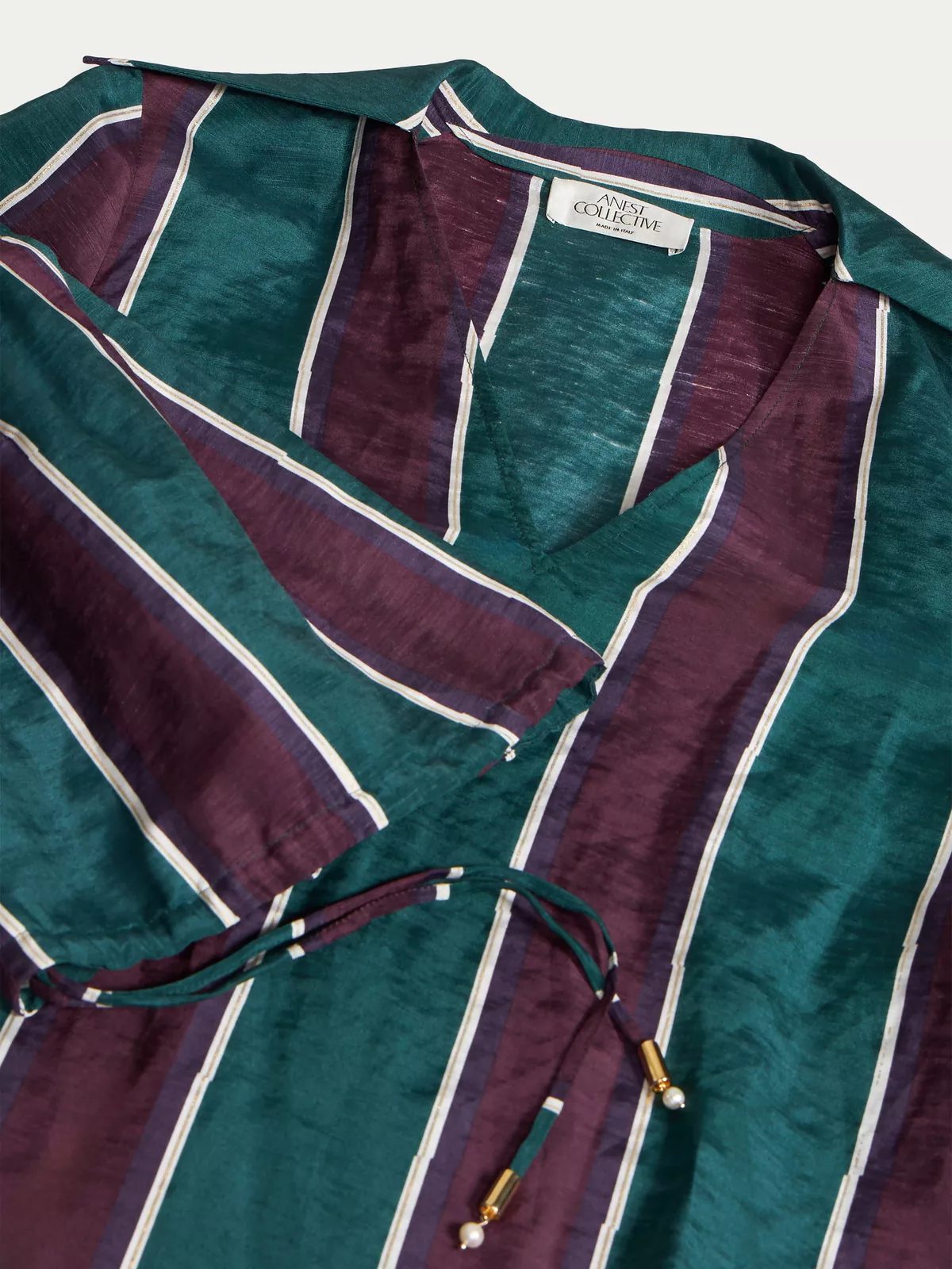 Crafted in a silk linen bicolour strips and gold pigment print with a regular shifting line. With a fluted sleeves with drawstring at hem, gold and pearl detail. Asymmetrical slit at side.