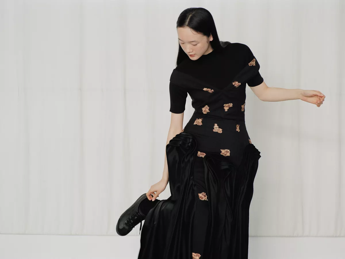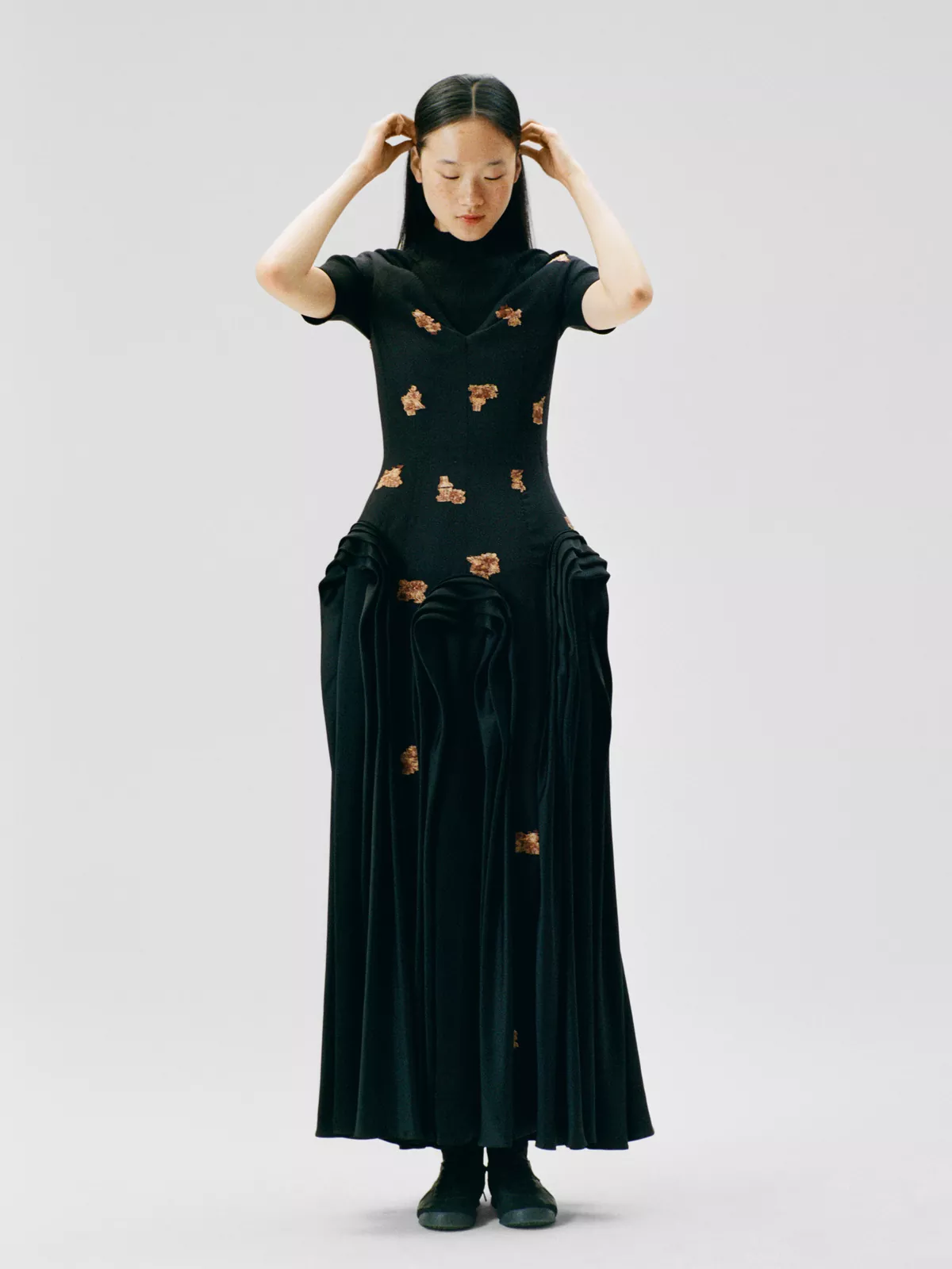 cascading skirt flows with striking fluidity. Beneath its refined