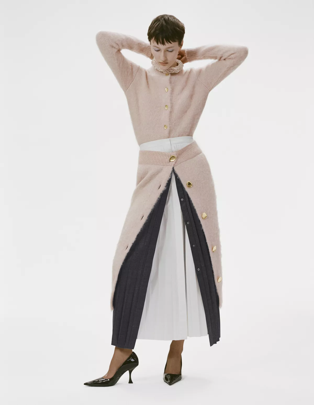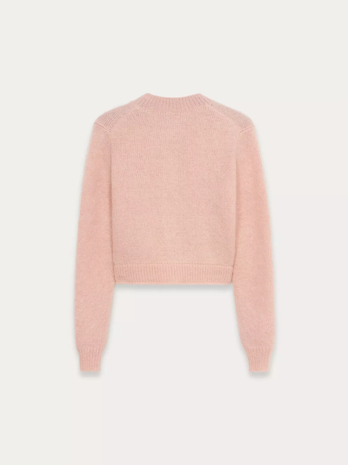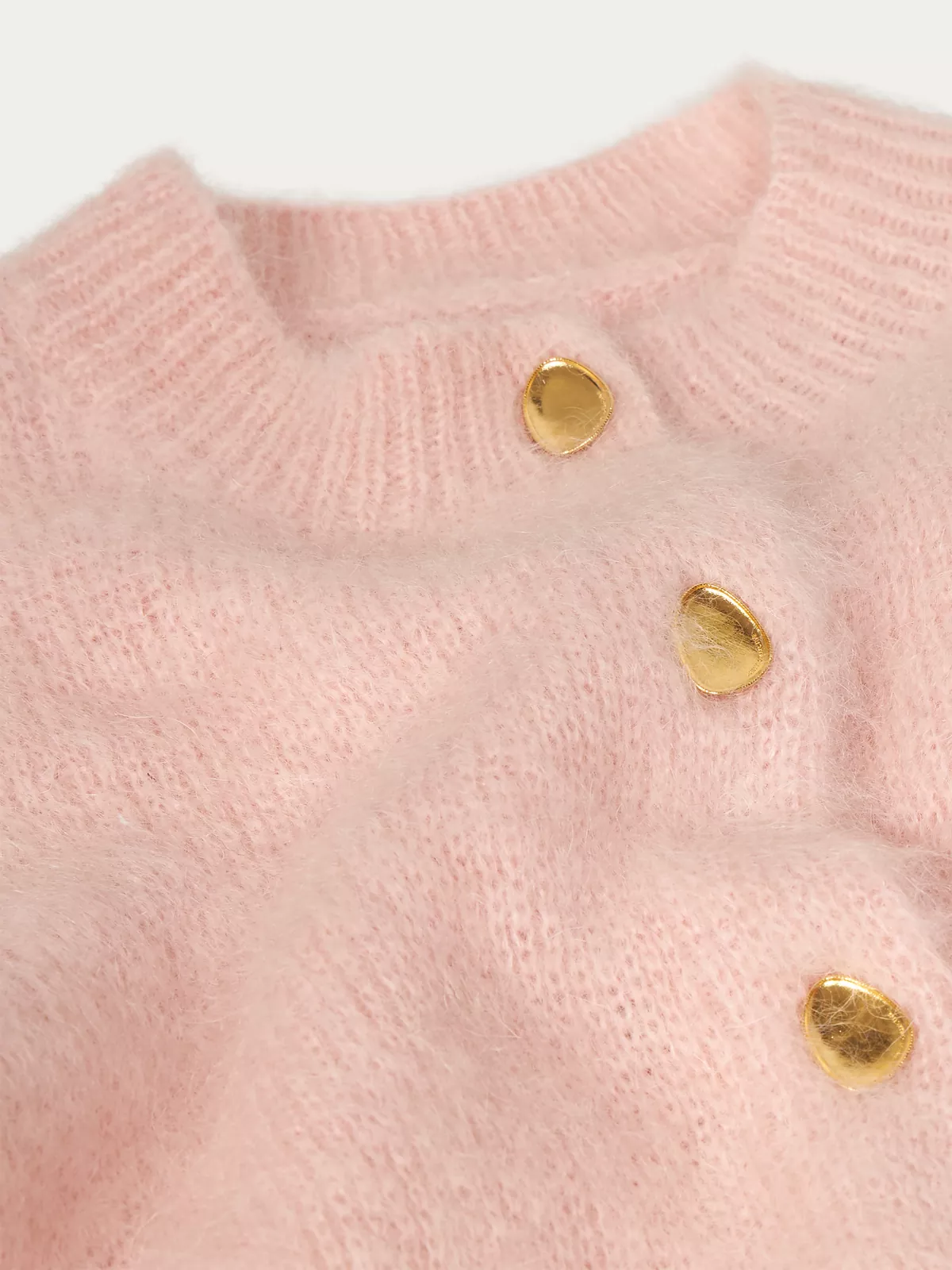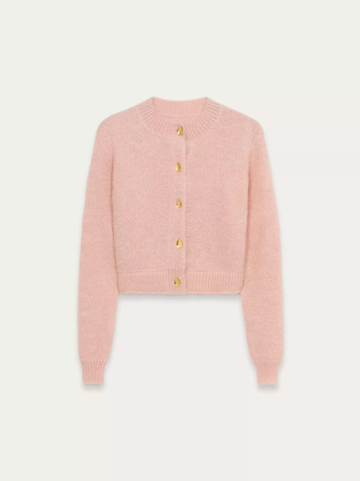 Kid mohair cardigan with brushed jacquard stitch. Jewel gold buttons with Anest engraved logo. Inner waist band with grosgrain trim.
