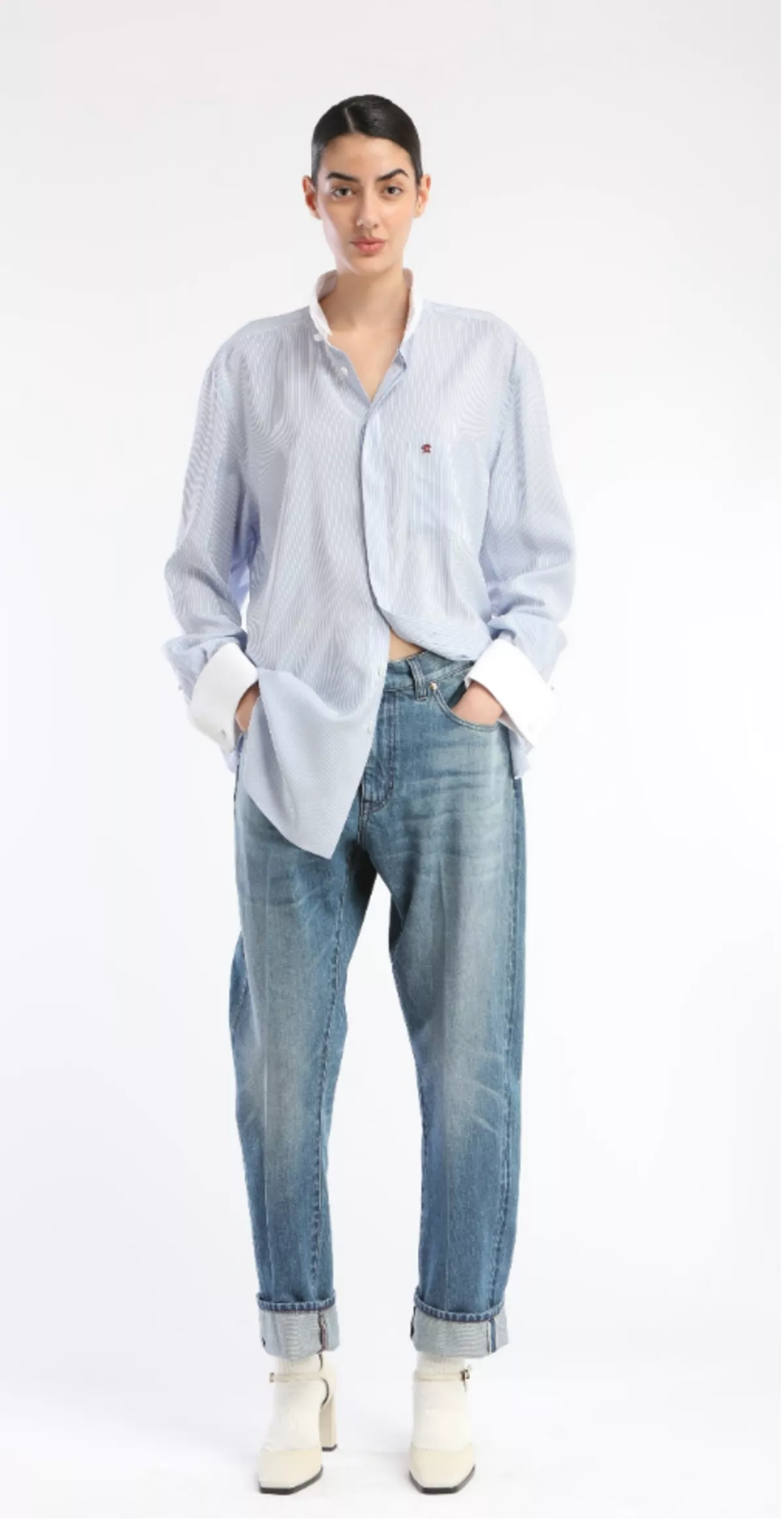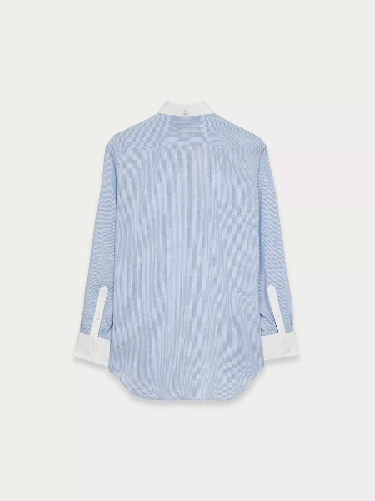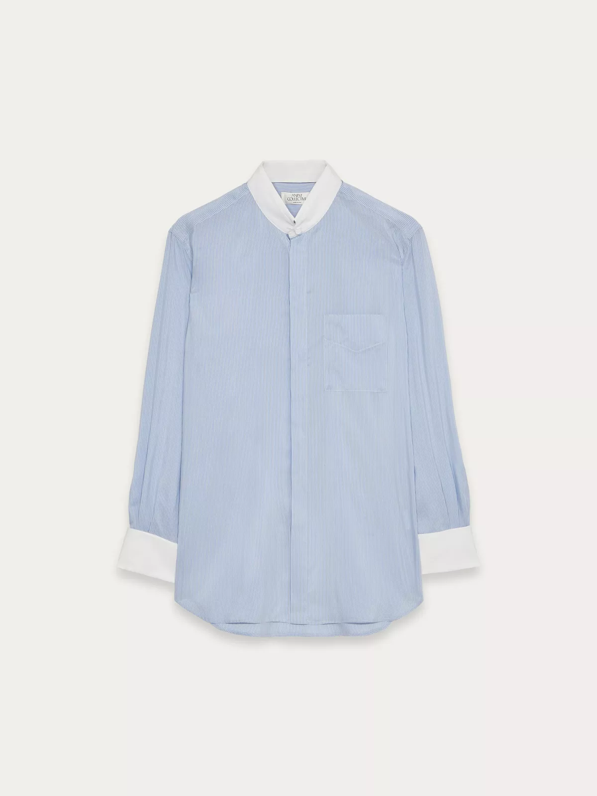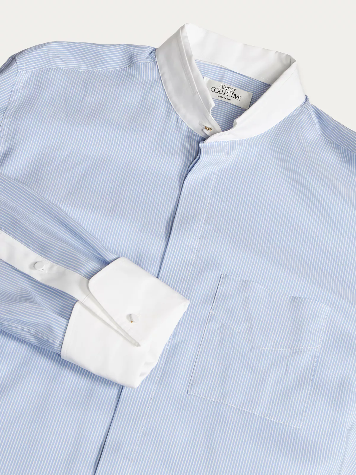 Yarn dyed silk stripe shirt with collar and cuffs in white poplin. Anest embroidered logo with white color thread on the front panel. Relaxed fit. Hidden mother of pearl buttons and poplin covered buttons on collar and cuffs.