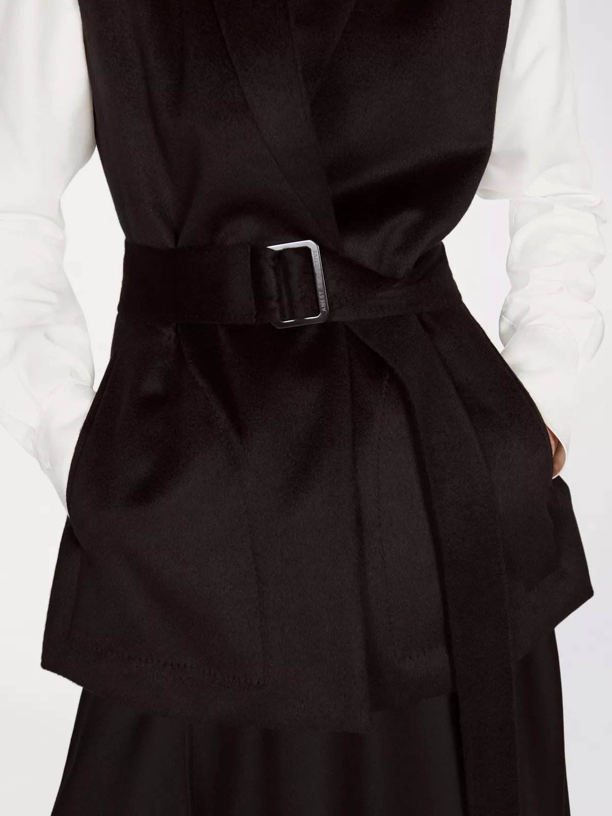 This sleeveless jacket is made from a double-face wool-and-cashmere blend with a contrasting reverse and cut to a slim-fitting silhouette, with a detachable waist-cinching belt with a horn buckle fastening and handcrafted saddle-stitch side pockets.