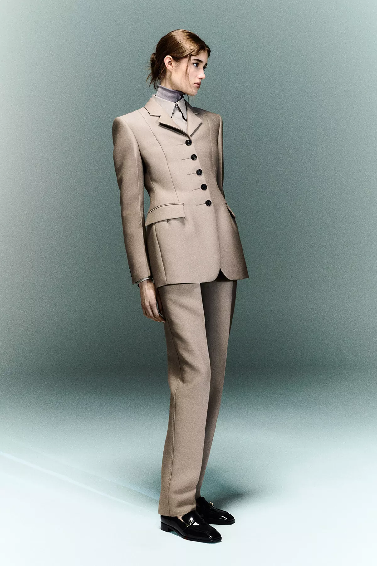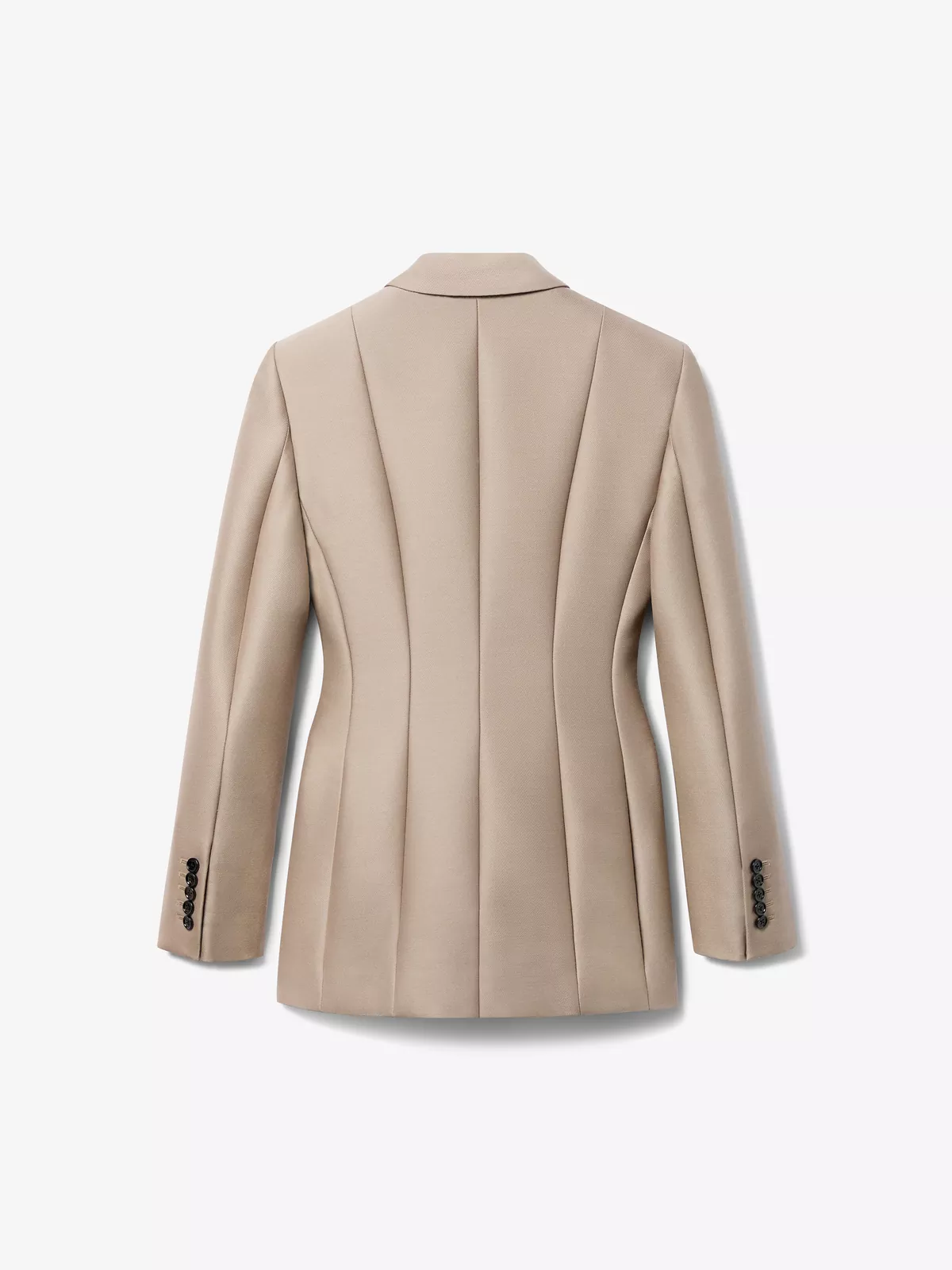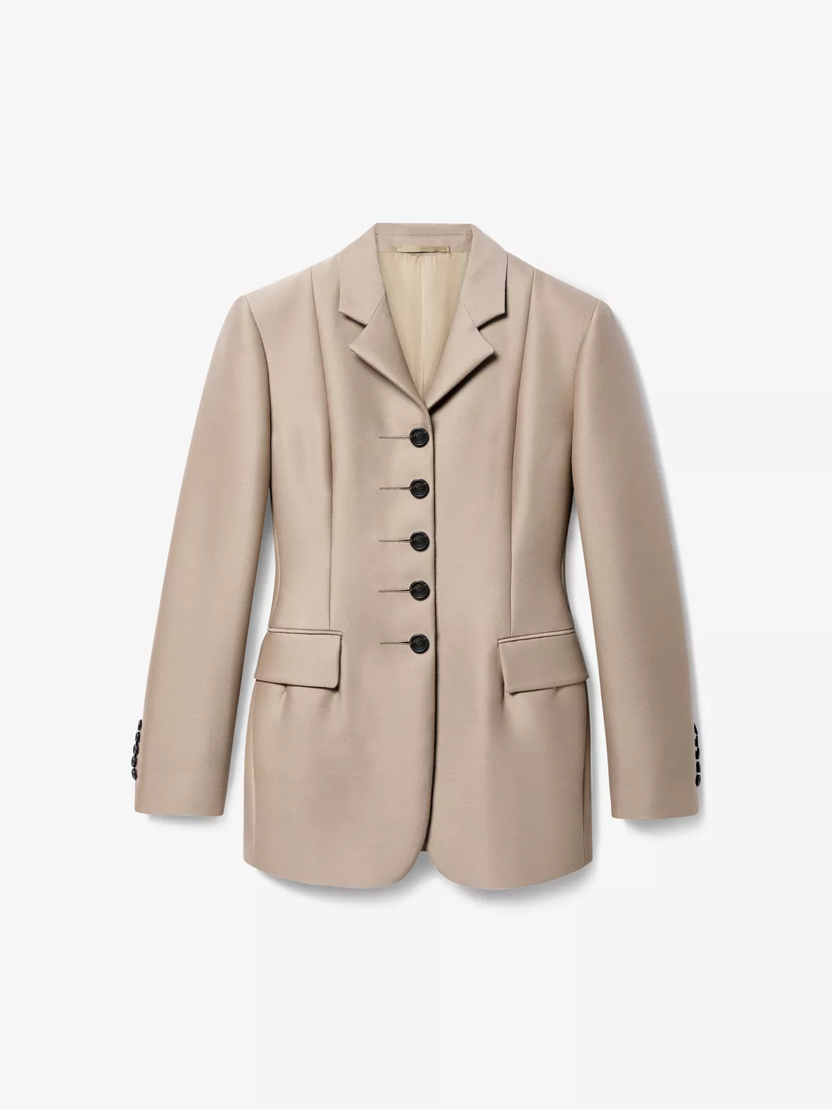 Crafted from a soft wool blend, this elegant single-breasted jacket has an exaggerated shoulder roll, a figure-flattering nipped-in waist and a smart five-button closure.