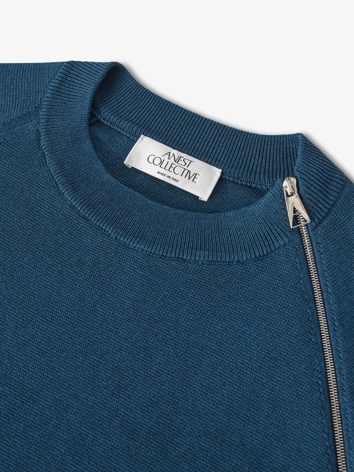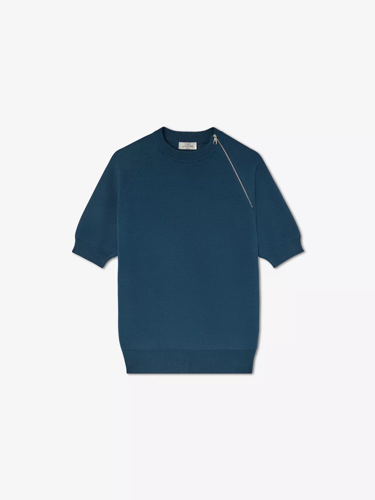This top is made in a fine silk cotton yarn. It has a boxy fit, raglan sleeves and mix of stitchecs techniques with an important metal zip detail on shoulders.