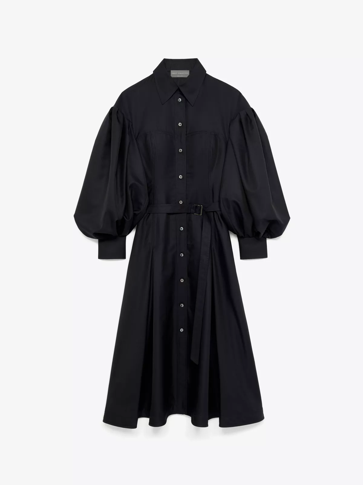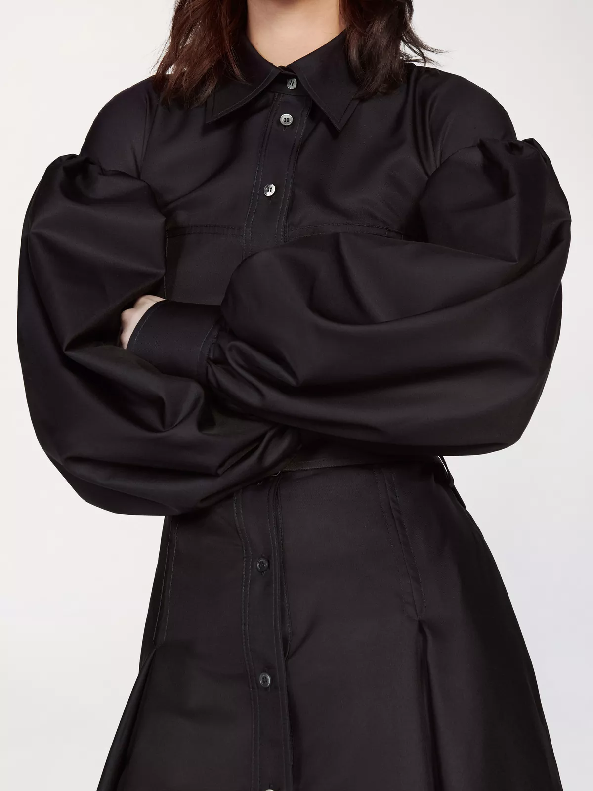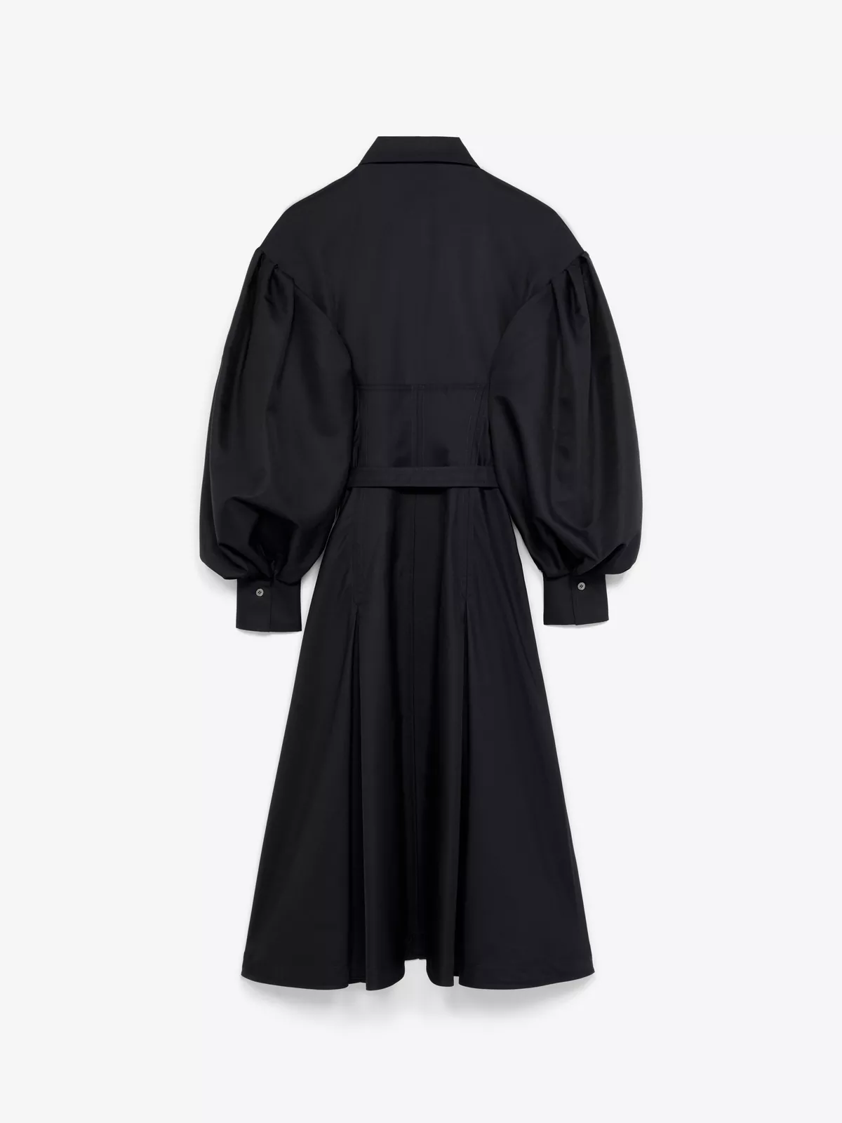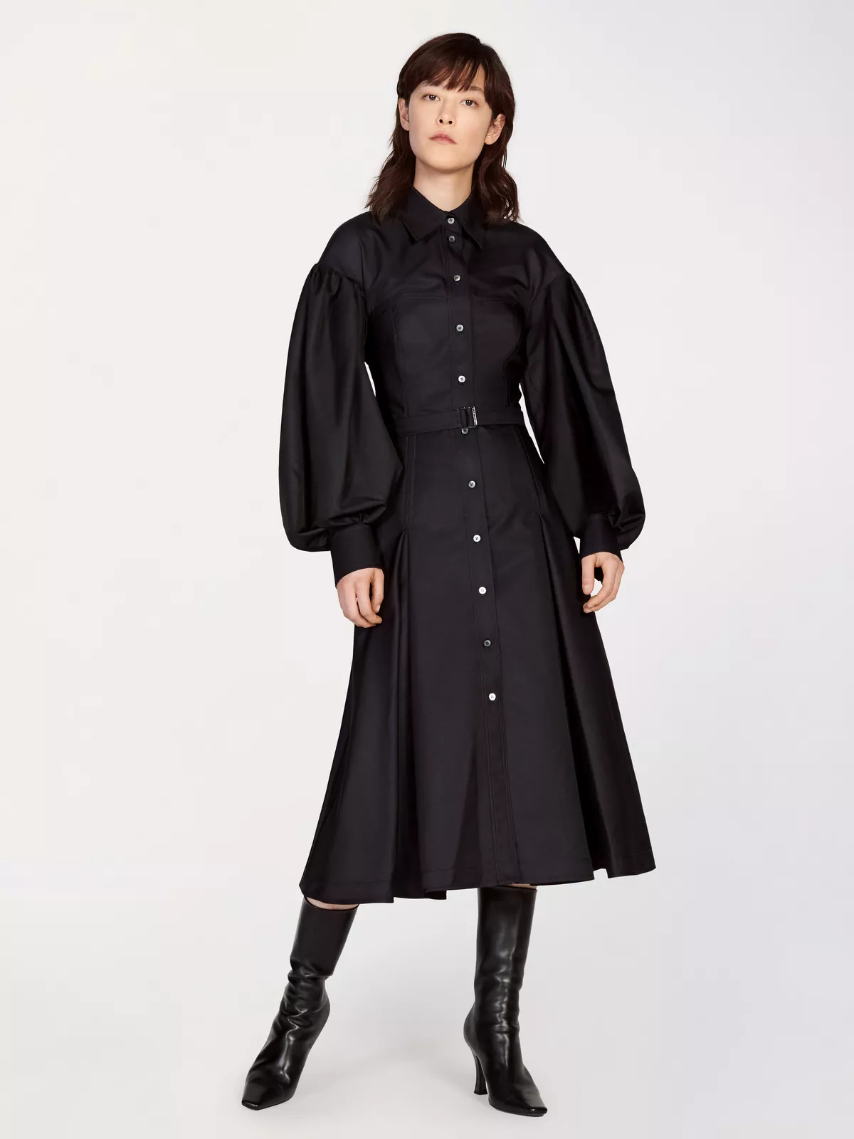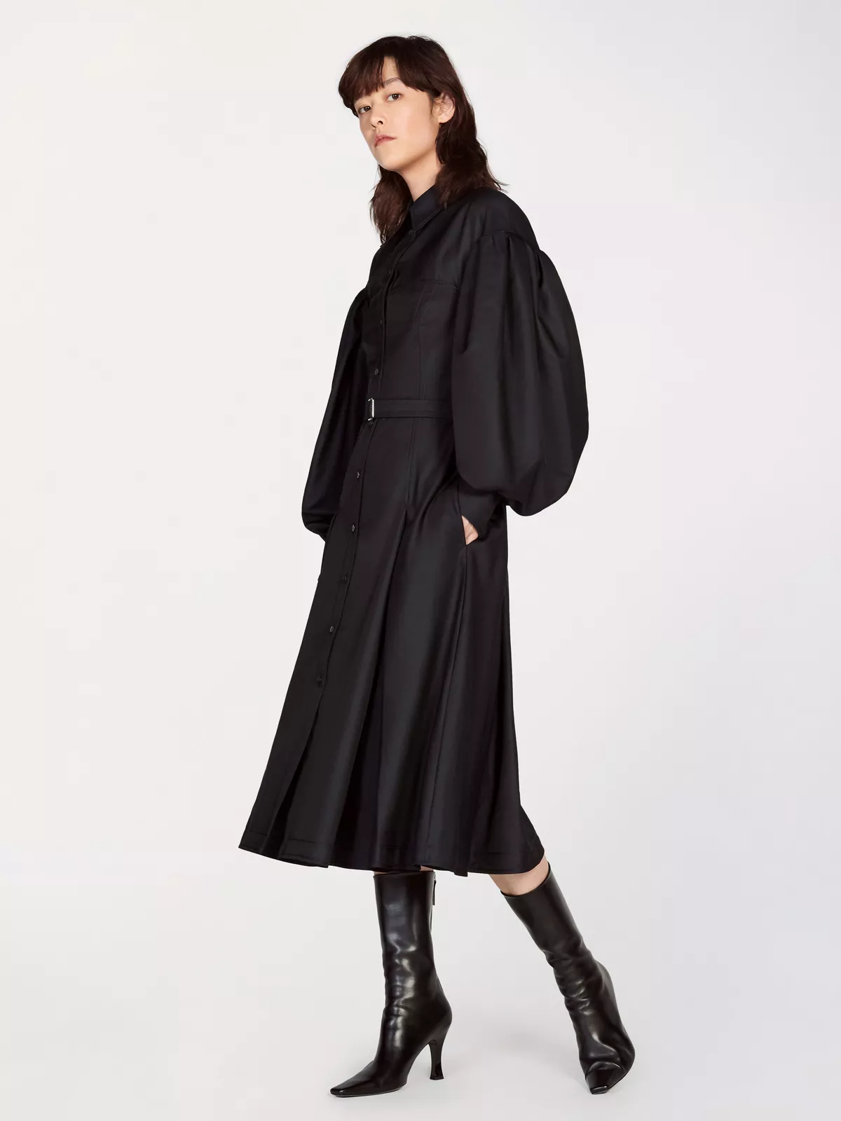 This shirt dress is cut from a fine wool-blend twill, with puffed sleeves, bodice-cinching seam detailing, a slim buttoned placket and a matching belt with buckle closure.