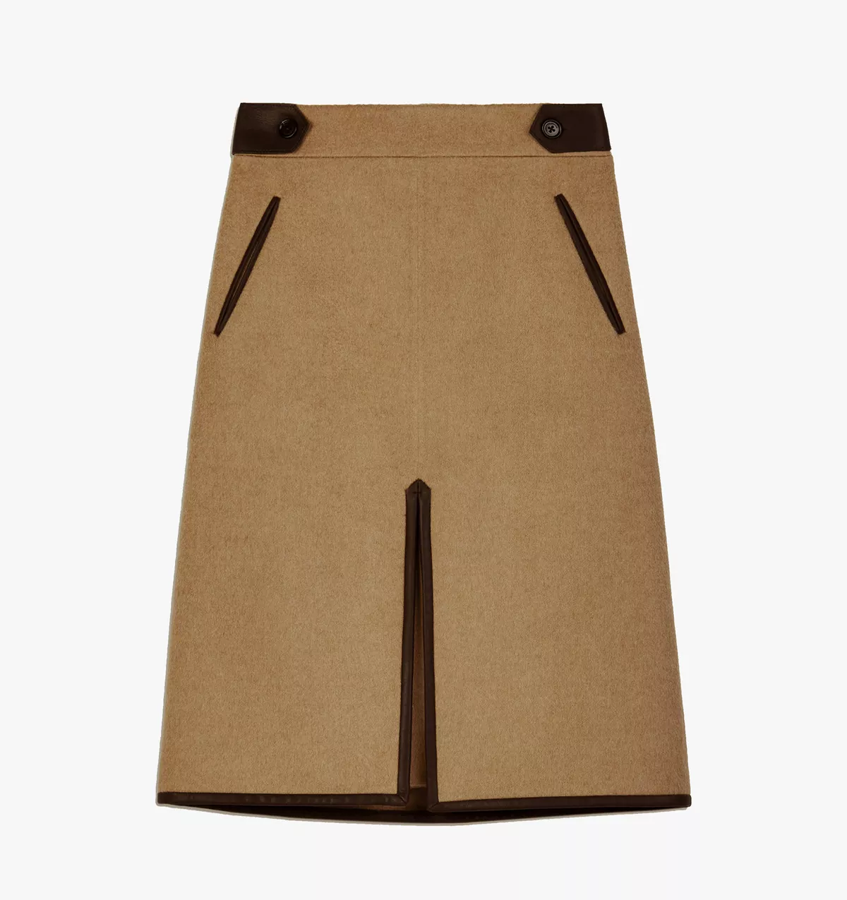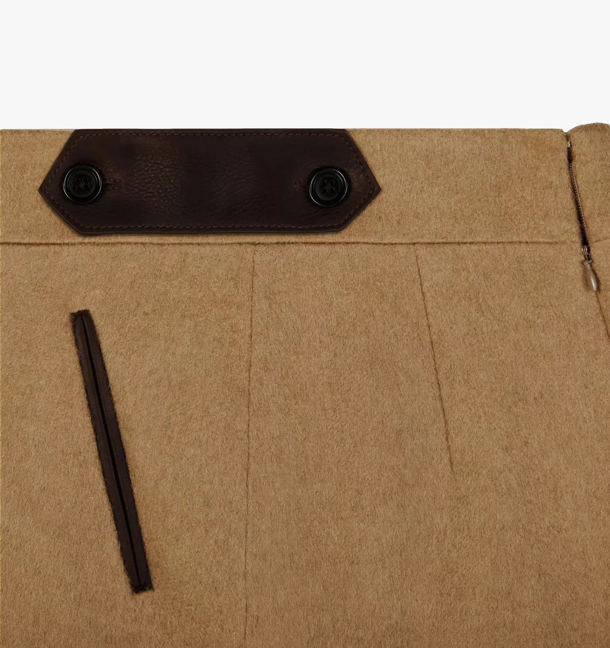 A pencil skirt with high-raise waist, body-hugging fit and luxurious leather details. Crafted in Italy from 100% Baby Camel Wool it is a versatile wardrobe staple season after season. Perfectly matching with the twin double coat.