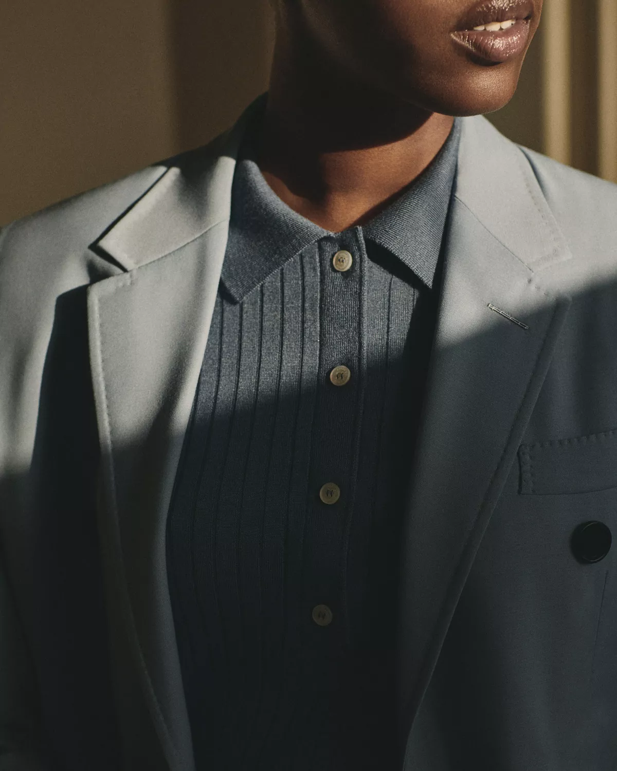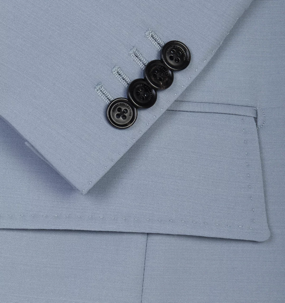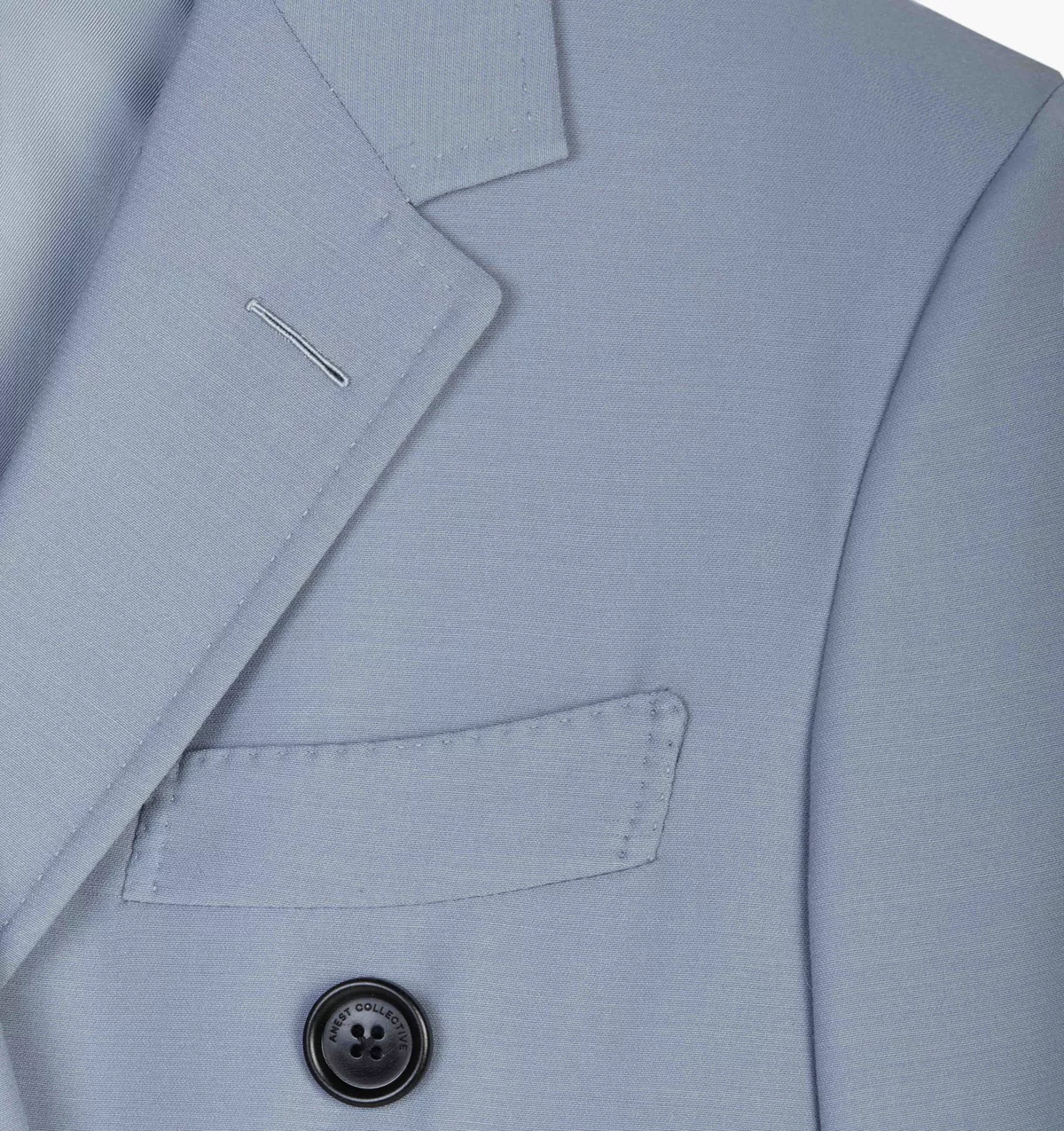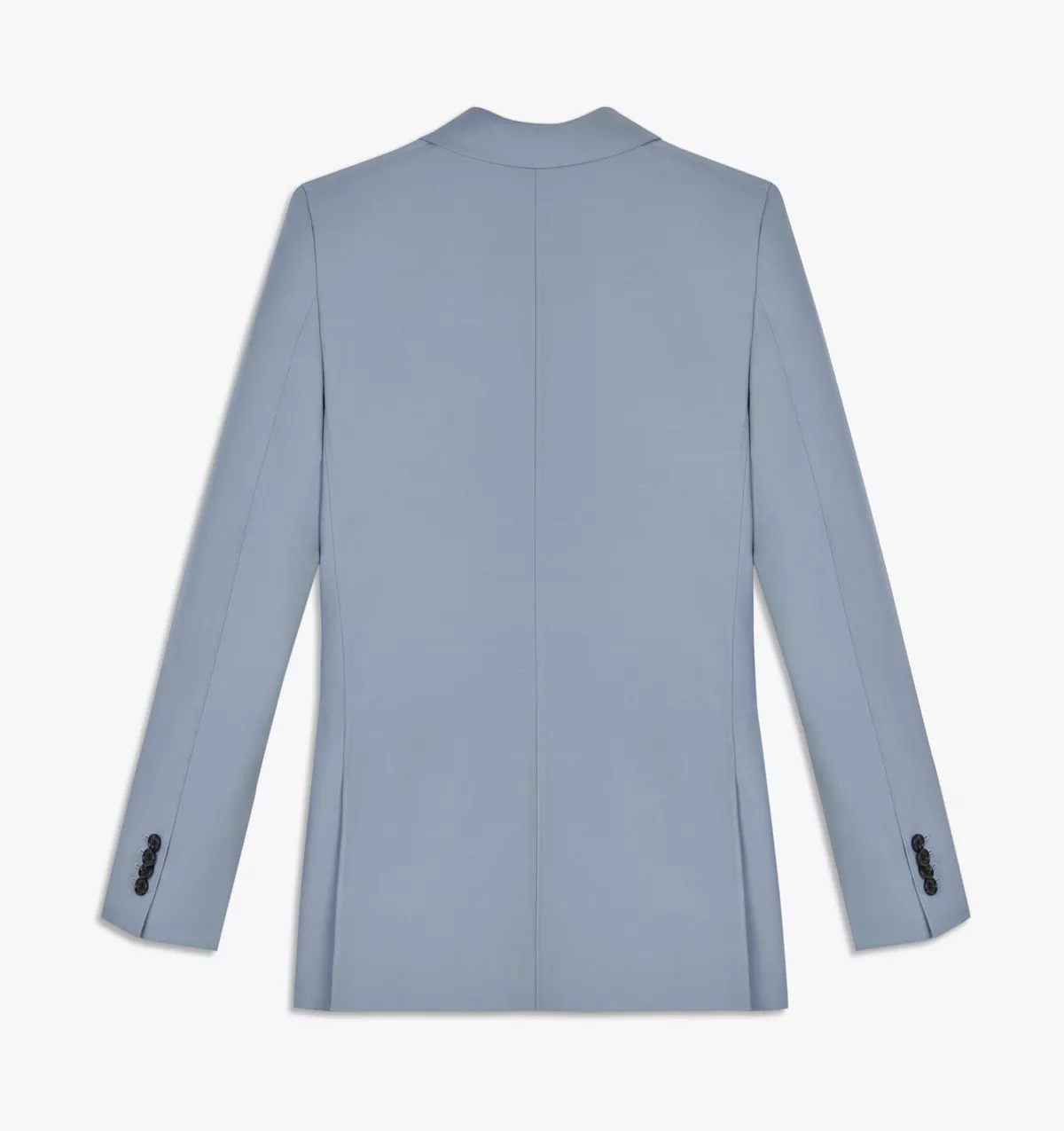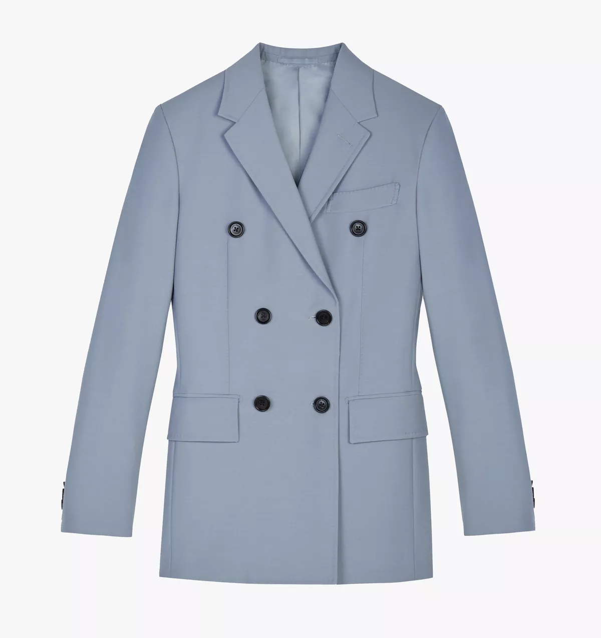 The design is crafted in Italy from a lightweight feminine blue color way wool given a sharp shape with padded shoulders, notched lapels, full canvass front and a double-breasted fastening. Black Logo buttons gives this jacket a modern vibe.