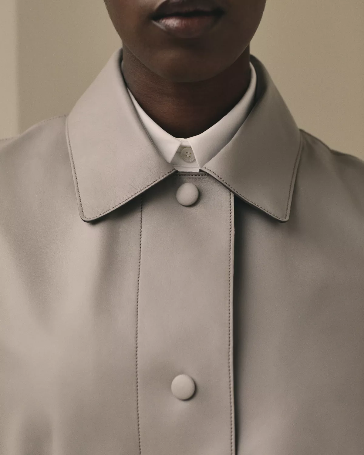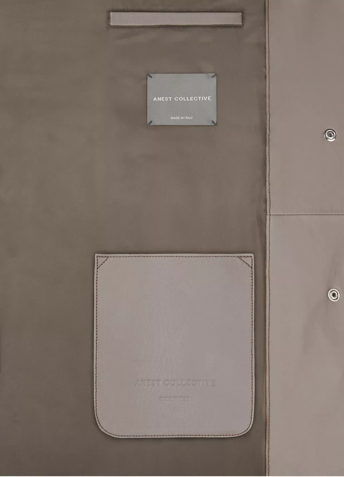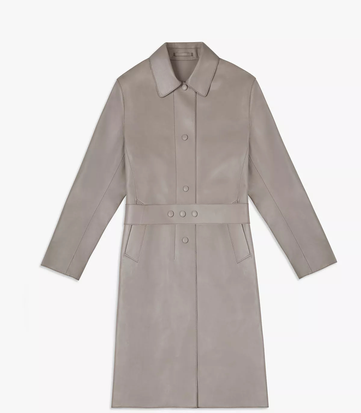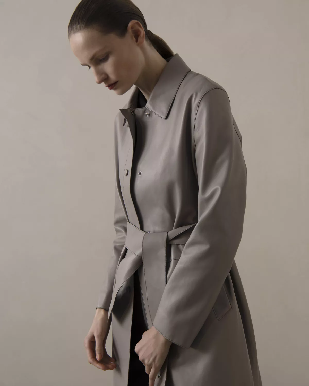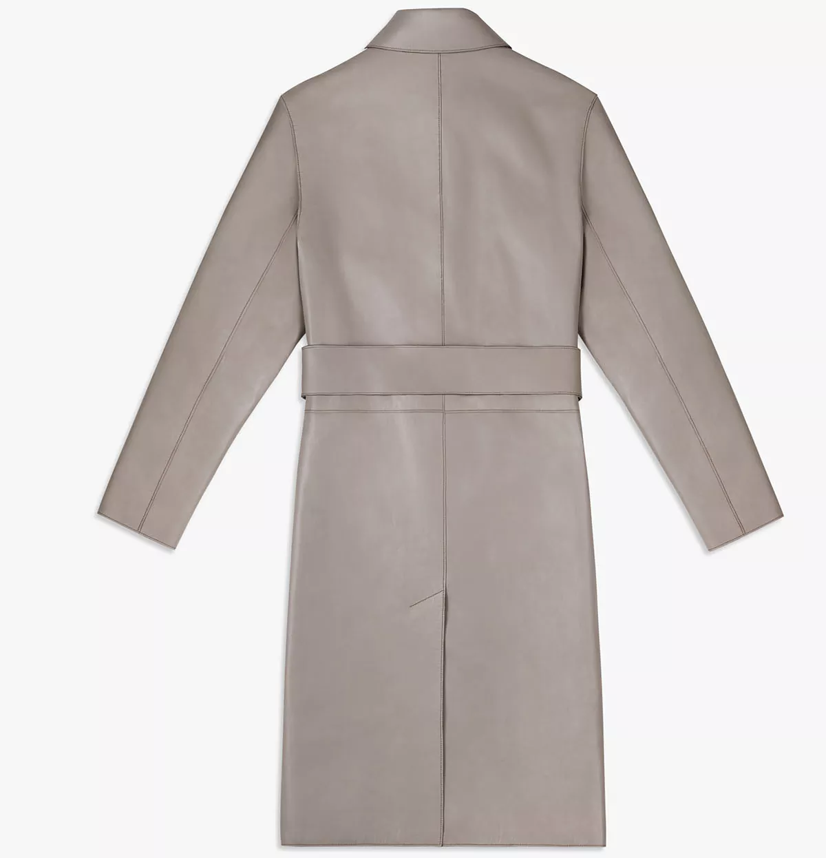 Urban edge meets Italian craftsmanship in this beige leather coat. A practical yet polished long Trench Coat crafted in Italy from supple Lambskin Leather.