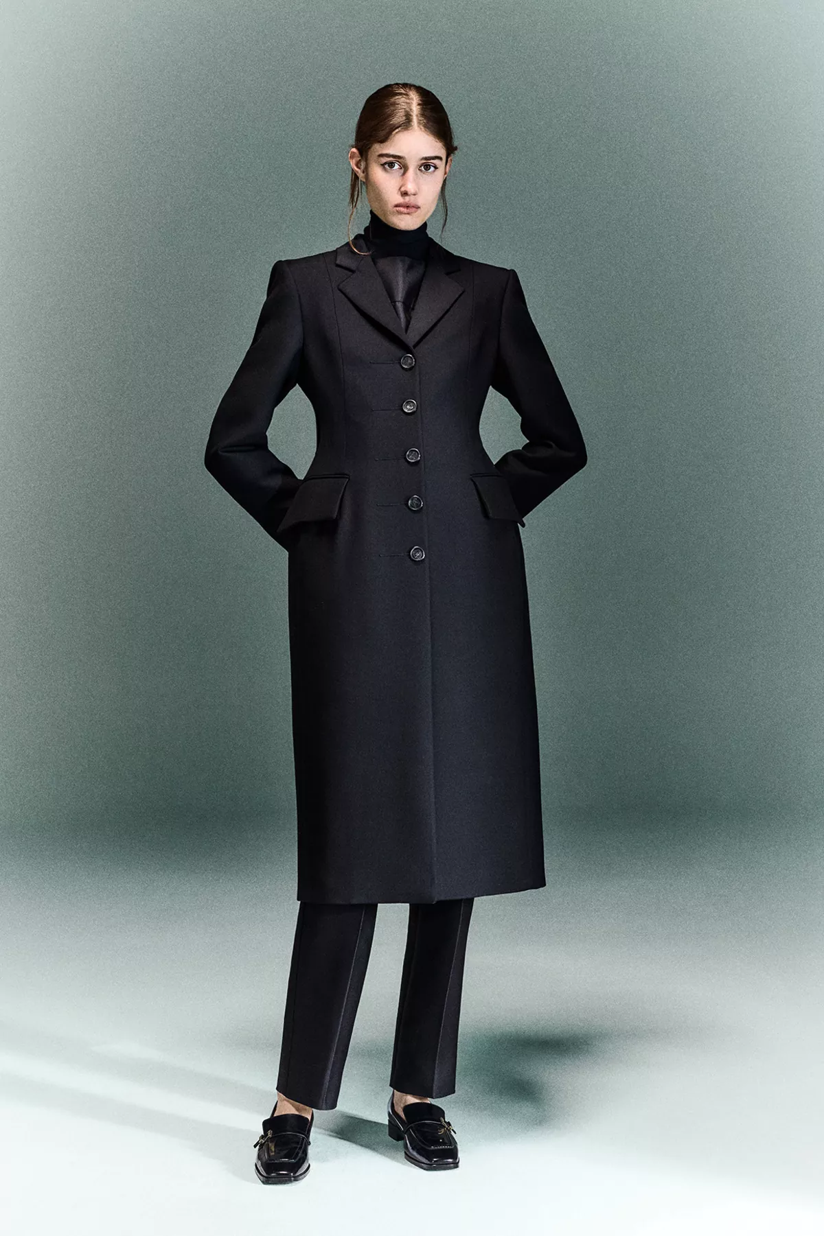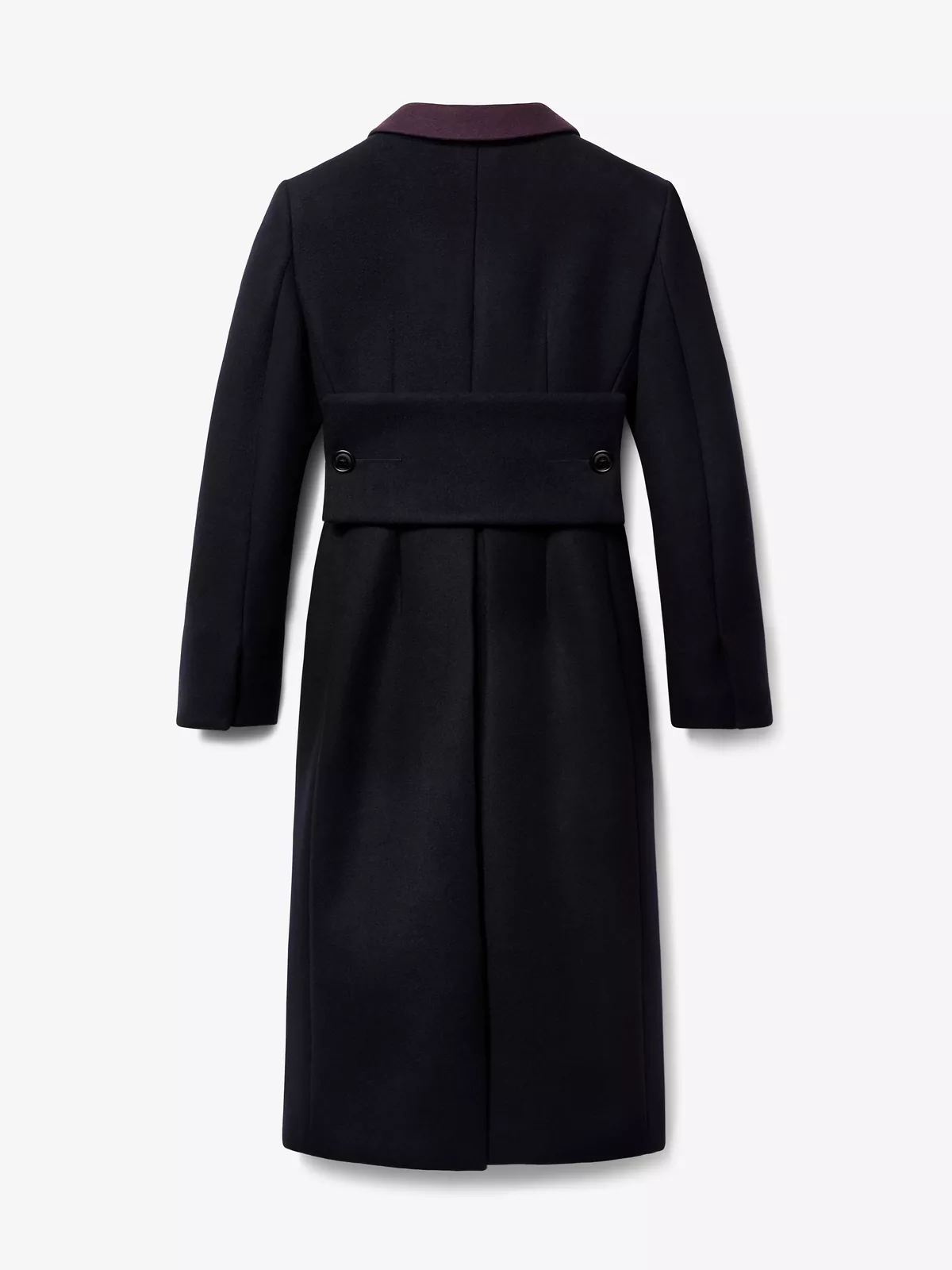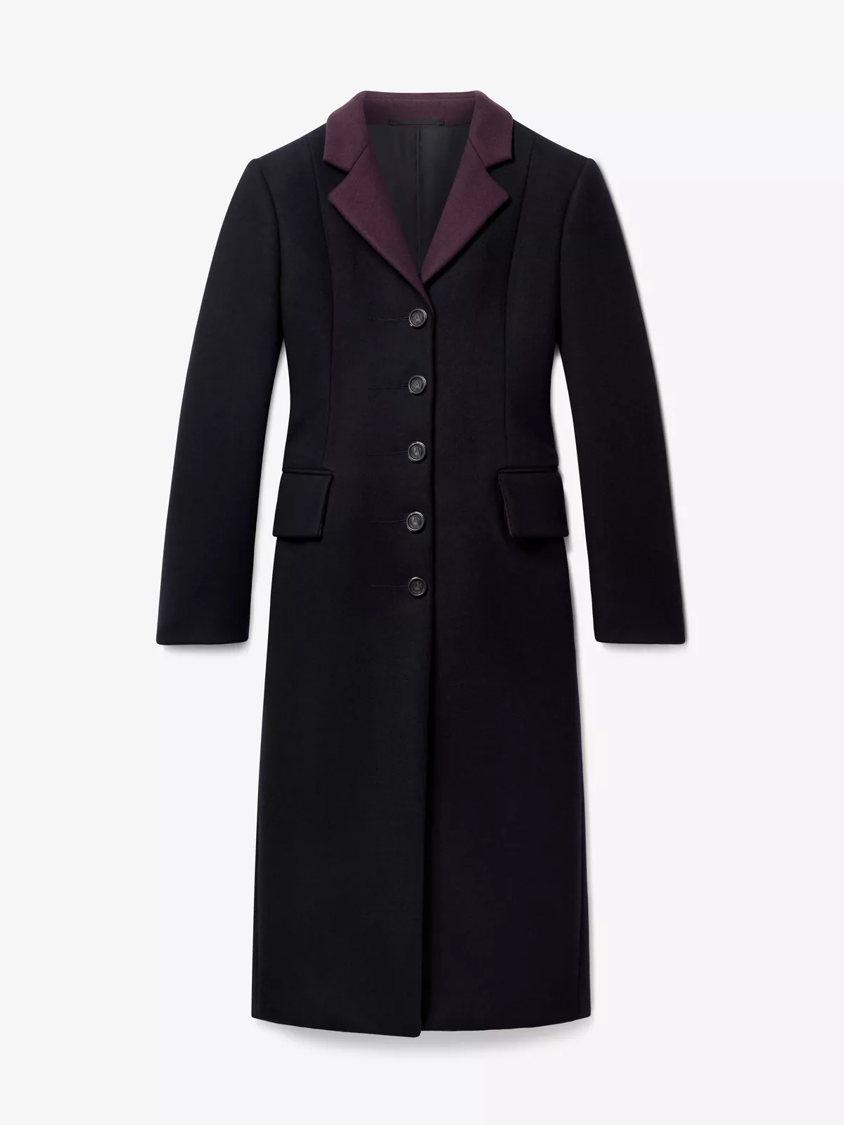 Crafted from a virgin-wool twill and cut to a slim fit with a flattering nipped-in waist and martingale on the reverse, this single-breasted coat has classic peak lapels, front horn button fastenings and side flap pockets.