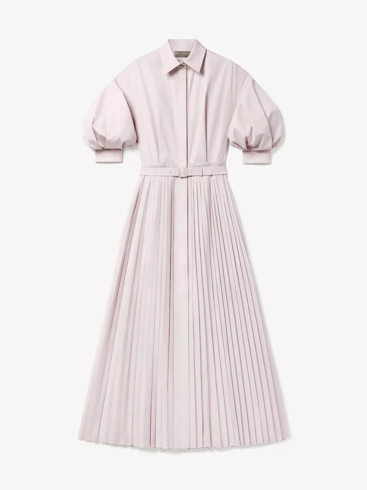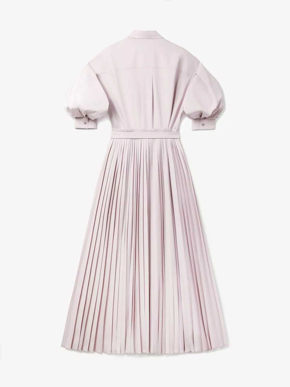 This shirt dress is cut from a cotton-poplin and has a full pleated skirt, puffed elbow-length sleeves, concealed button placket and a matching belt with a buckle closure.