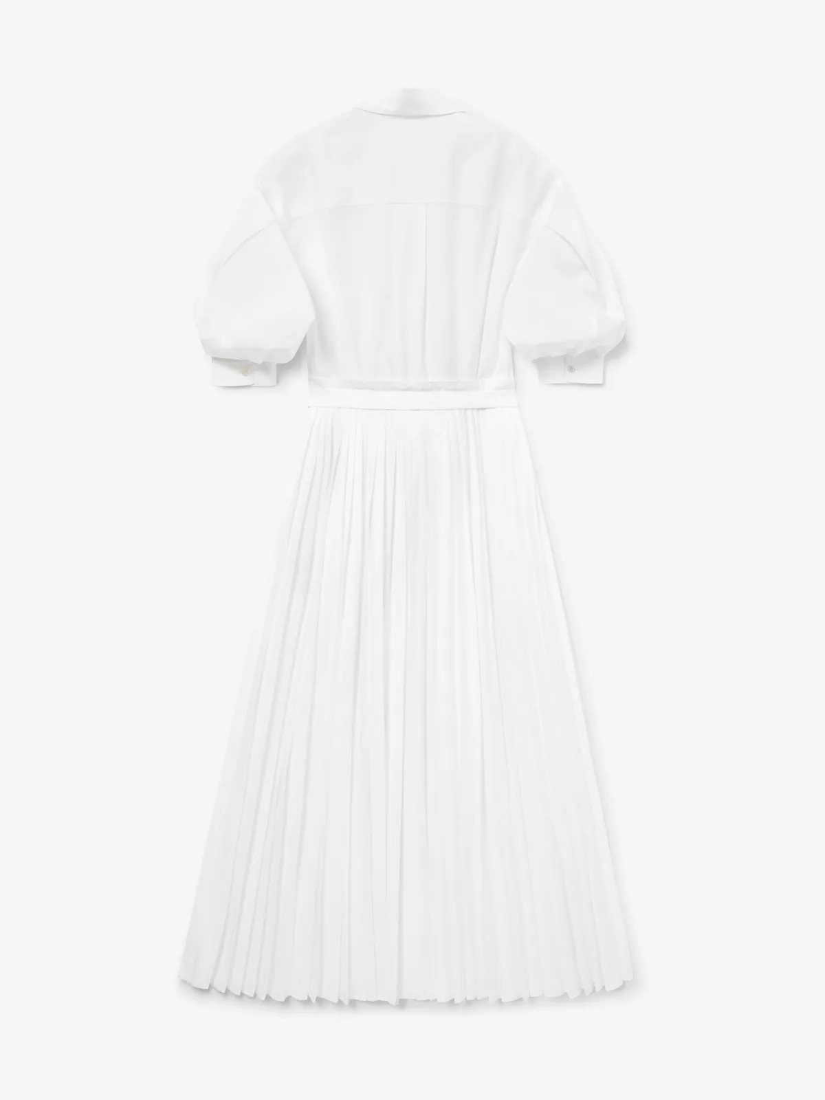 This shirt dress is cut from a cotton-poplin and has a full pleated skirt, puffed elbow-length sleeves, concealed button placket and a matching belt with a buckle closure.