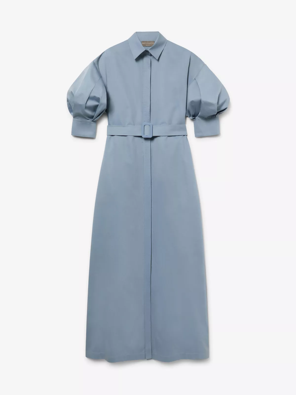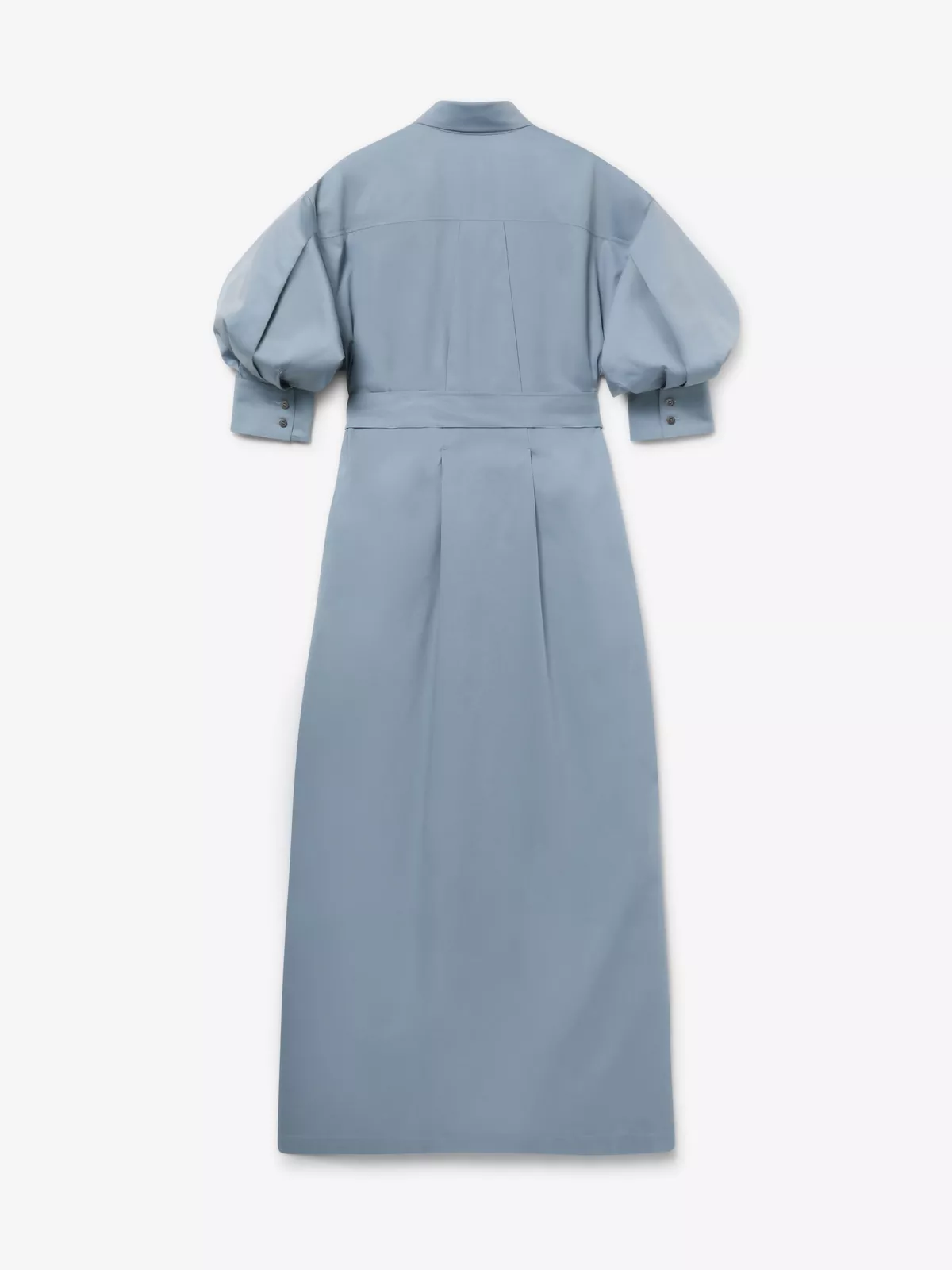 Crafted from a luxurious cotton blend, this midi shirt dress has leg-of-mutton sleeves, a mother-of-pearl-buttoned front, a matching belt with buckle closure, and saddle-point stitch detailing on the front and hem.