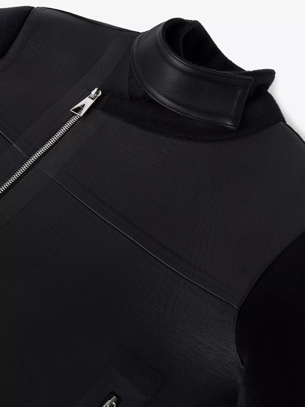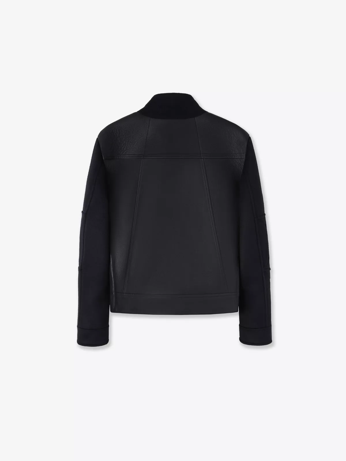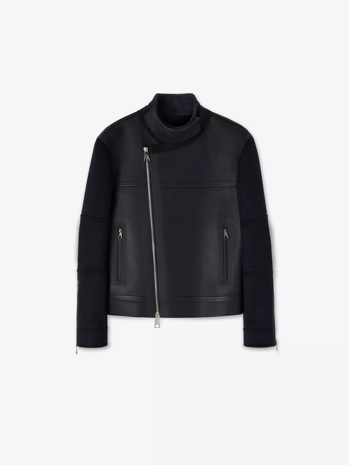 Made from a grainy calfskin and wool-and-cashmere blend in contrasting colourways, this biker-inspired blouson has a buttoned collar and a double zip closure.