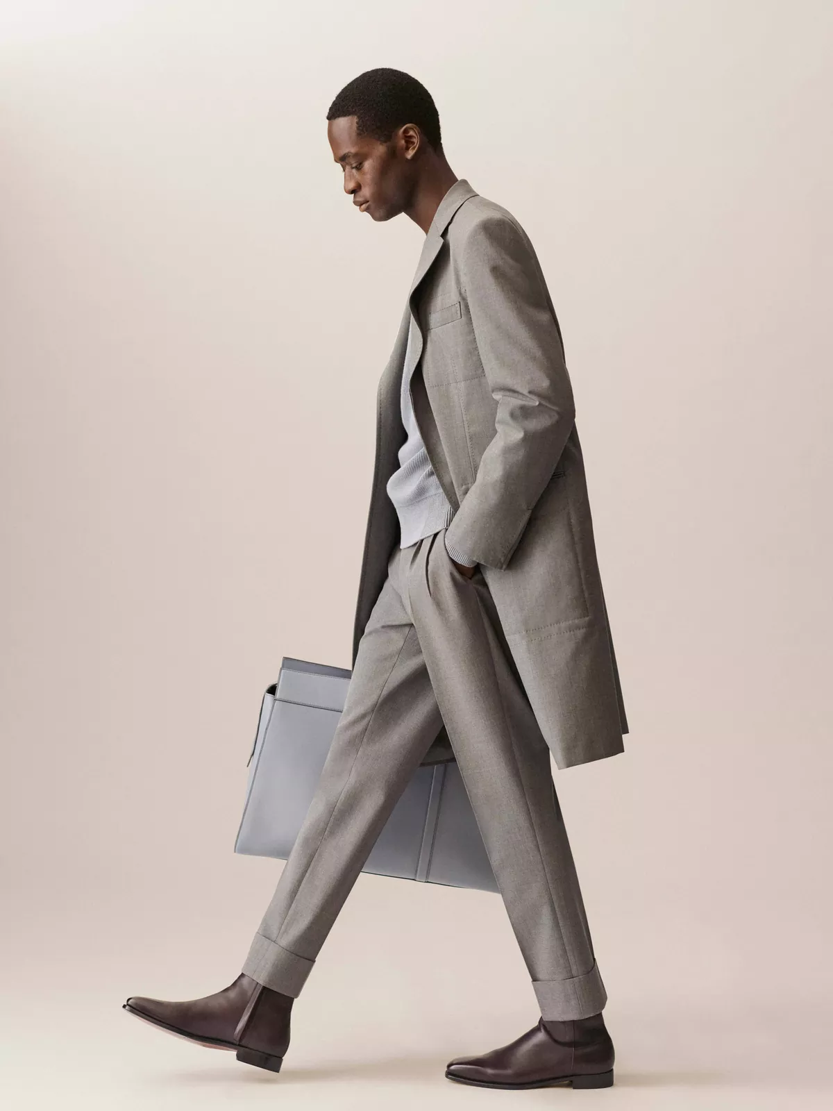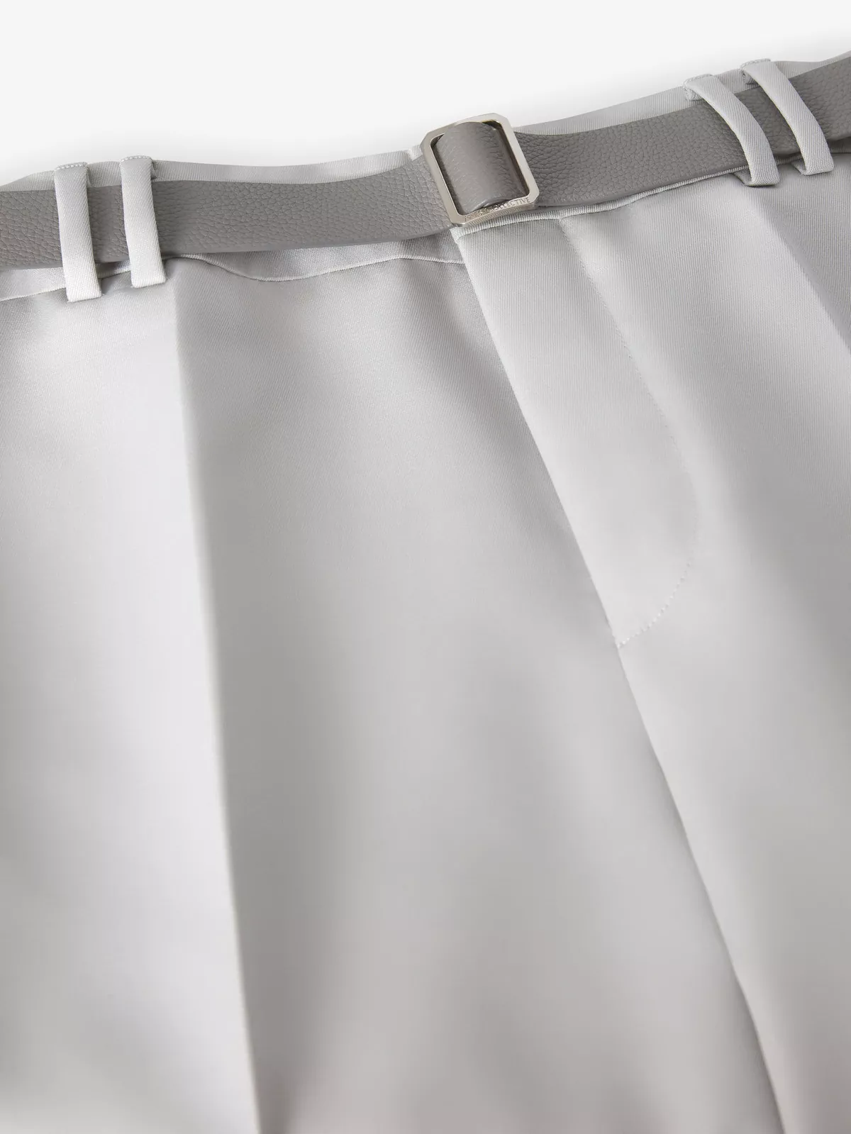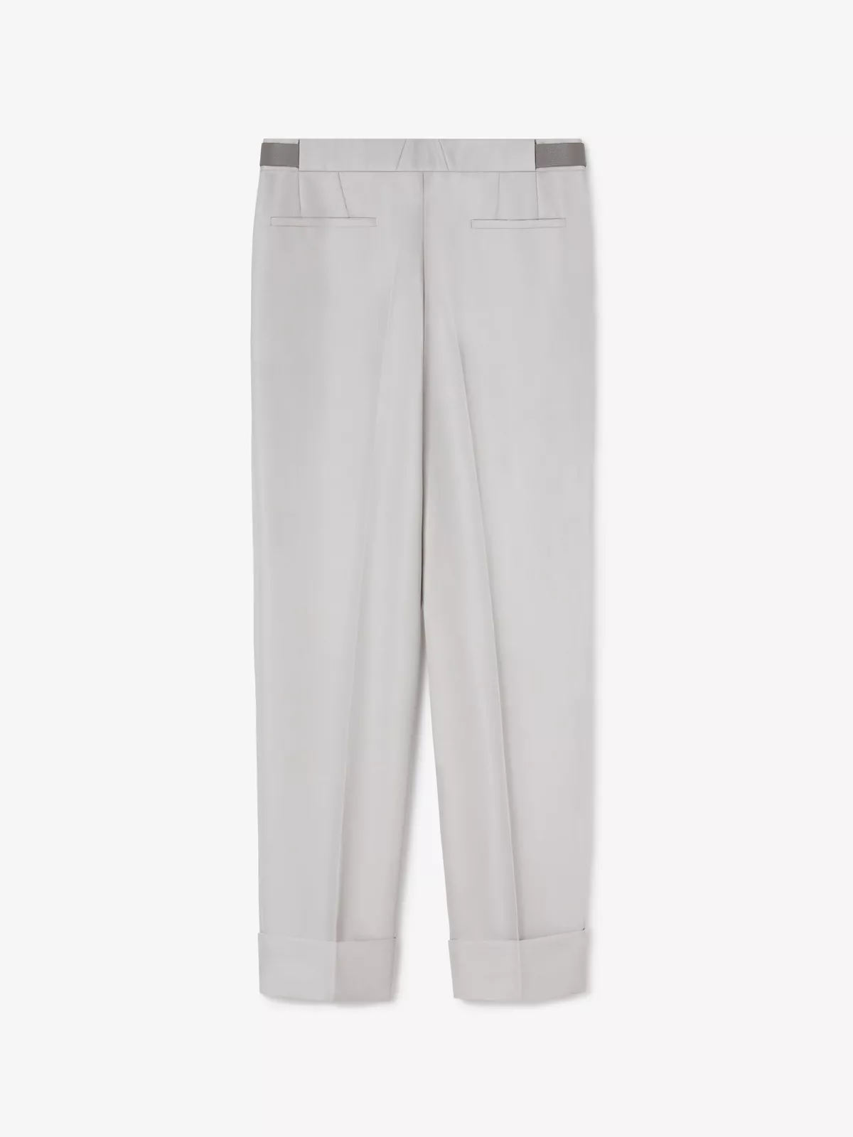 These wide-legged trousers are designed in a wool-and-mohair blend, with a contrasting adjustable belt, front double pleats, turn-up cuffs, and are unhemmed for ease of styling.