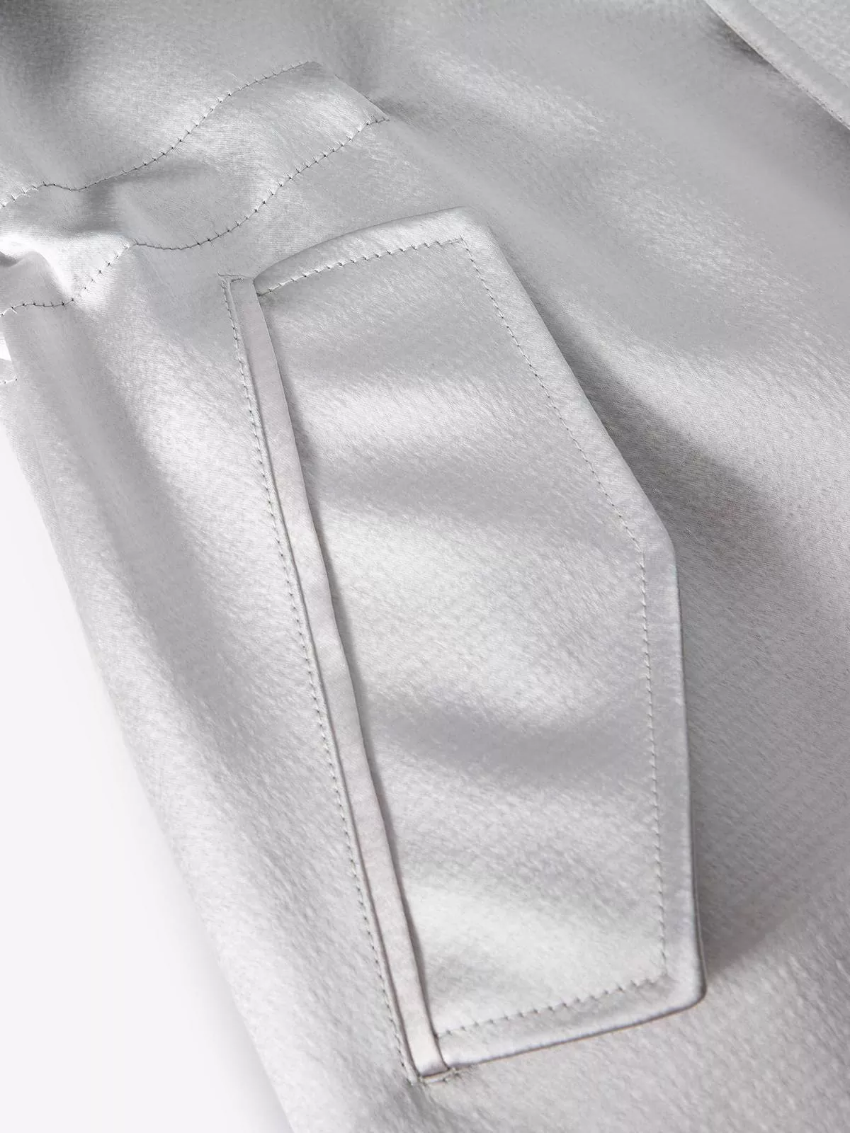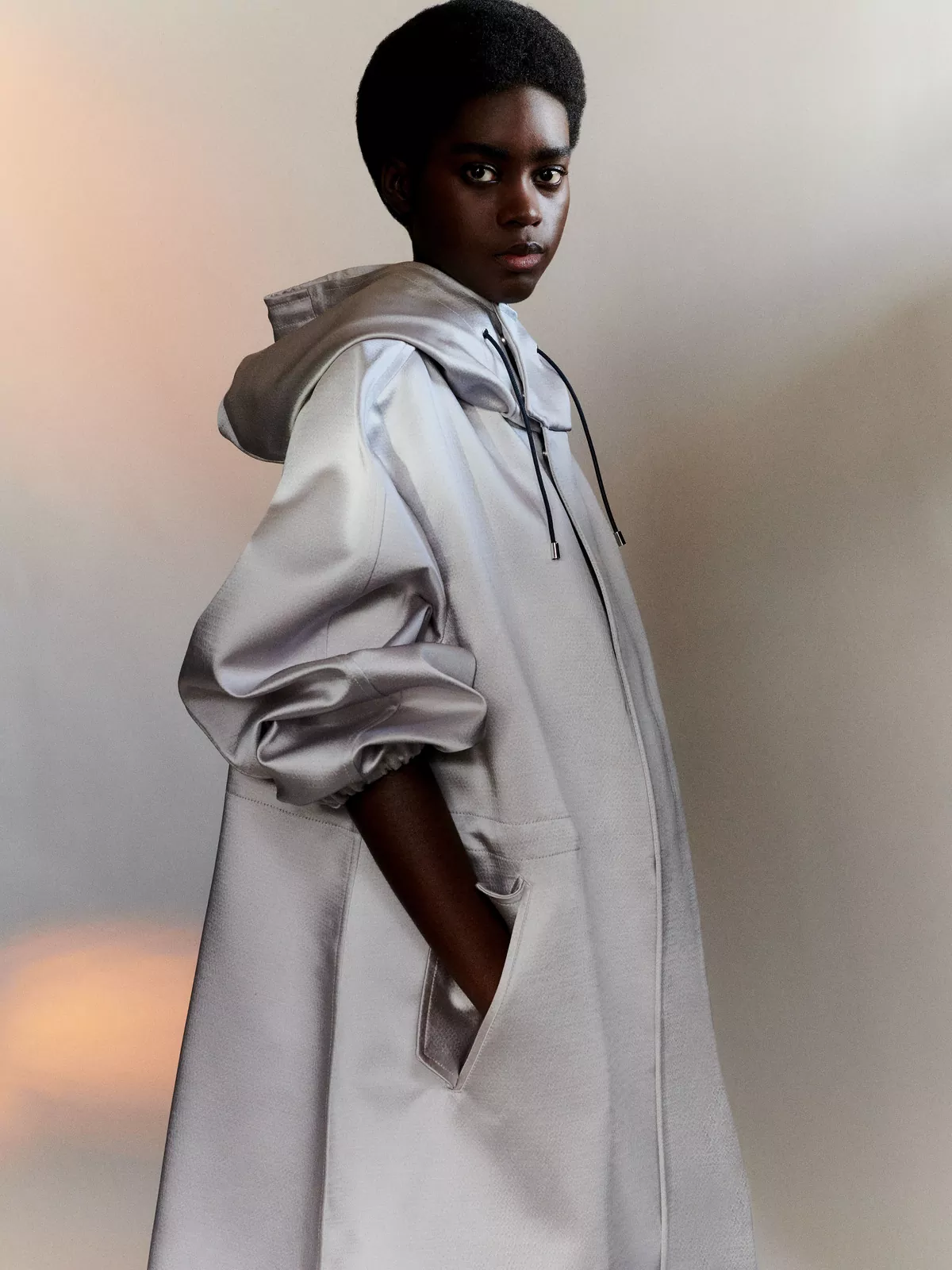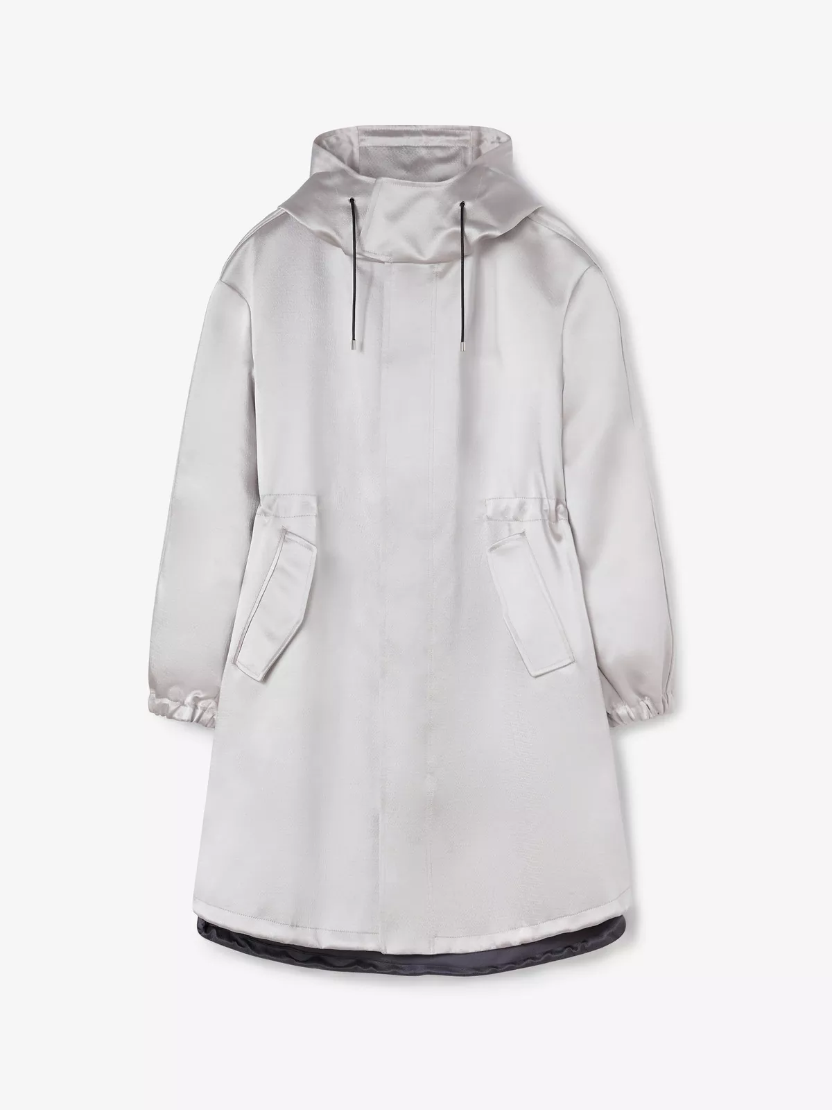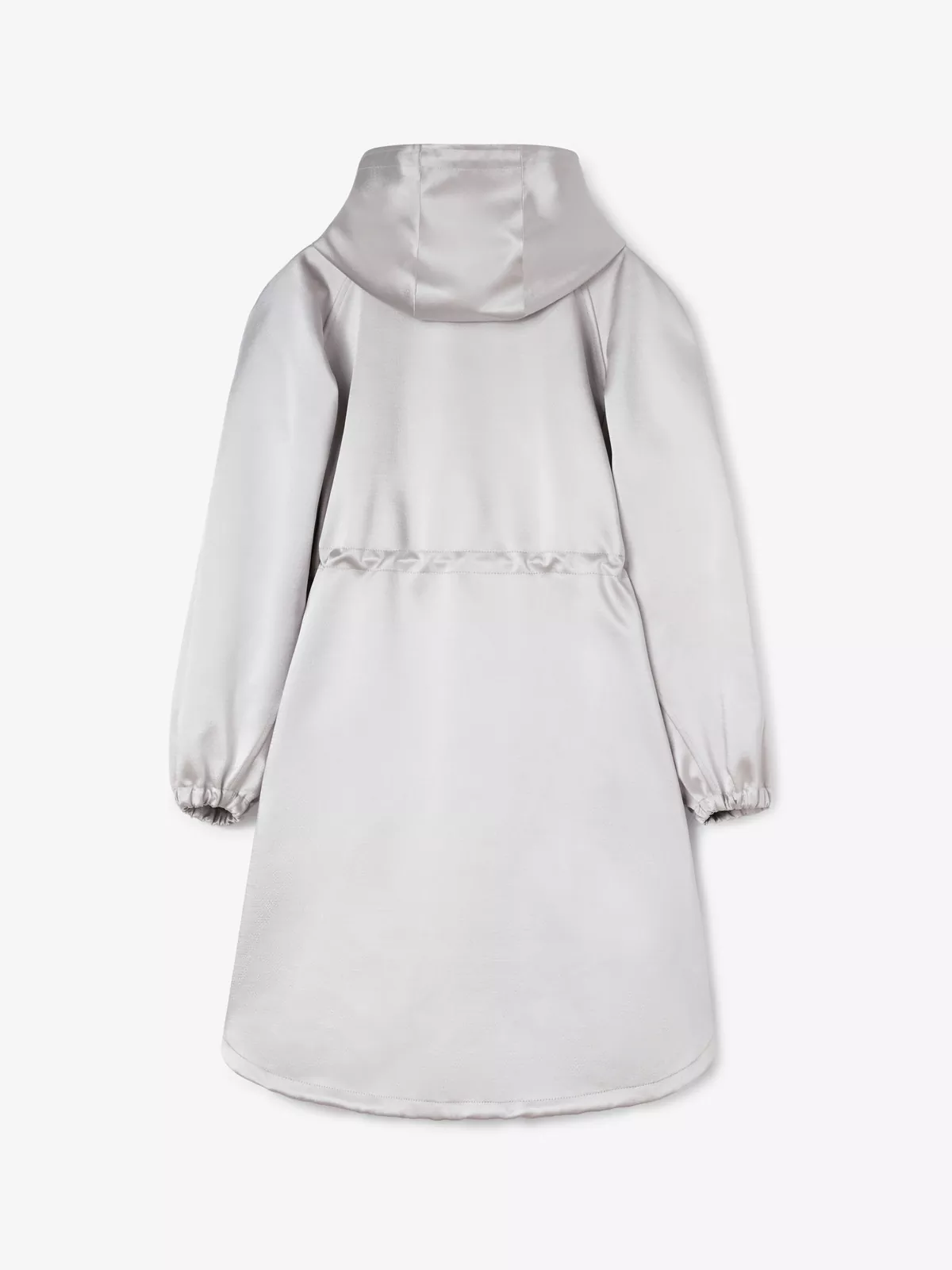 Designed in a luminescent silk blend, this parka-style coat has been shaped to a softly oversized silhouette, with adjustable internal drawstrings to enhance the shape, raglan sleeves, a circle hemline, and angled side pockets.