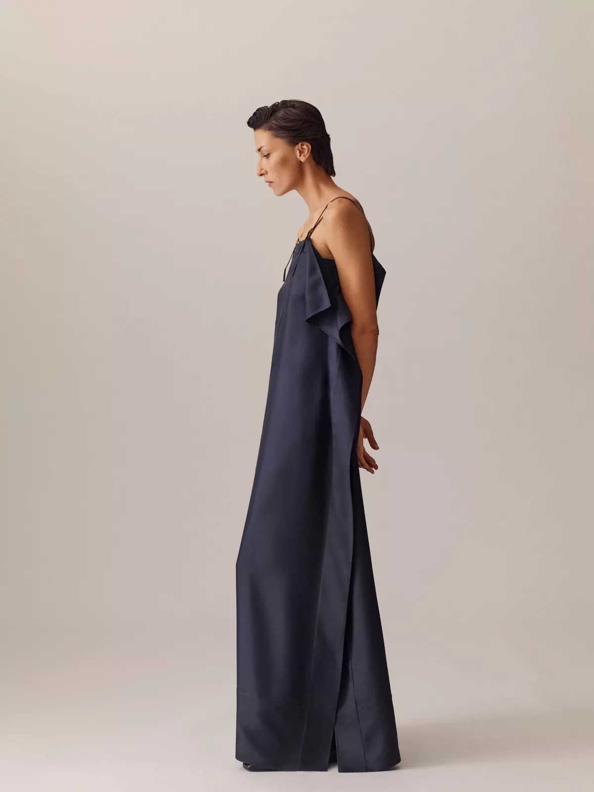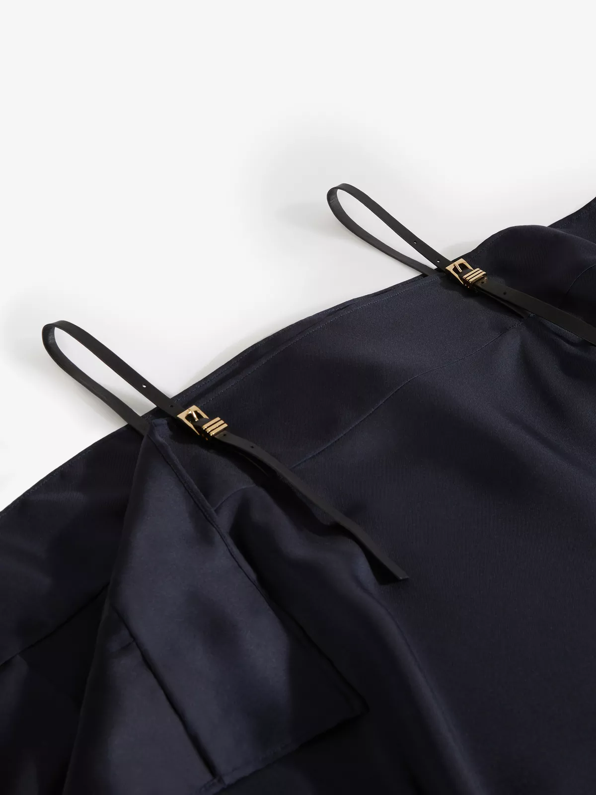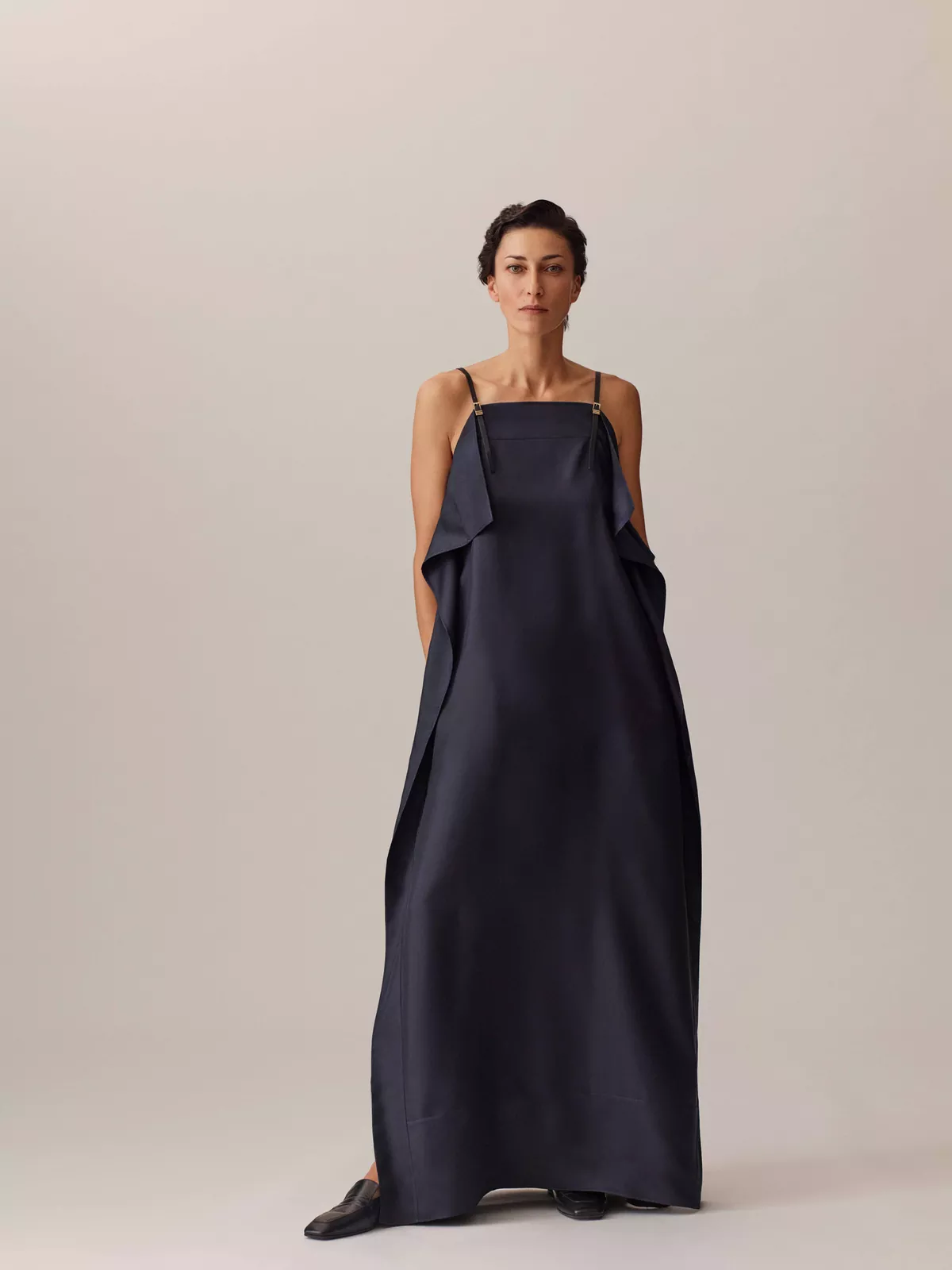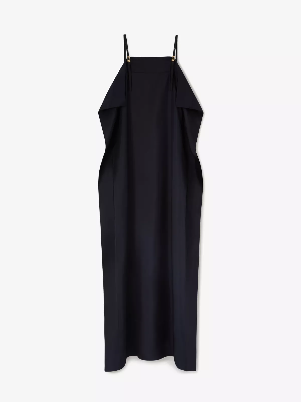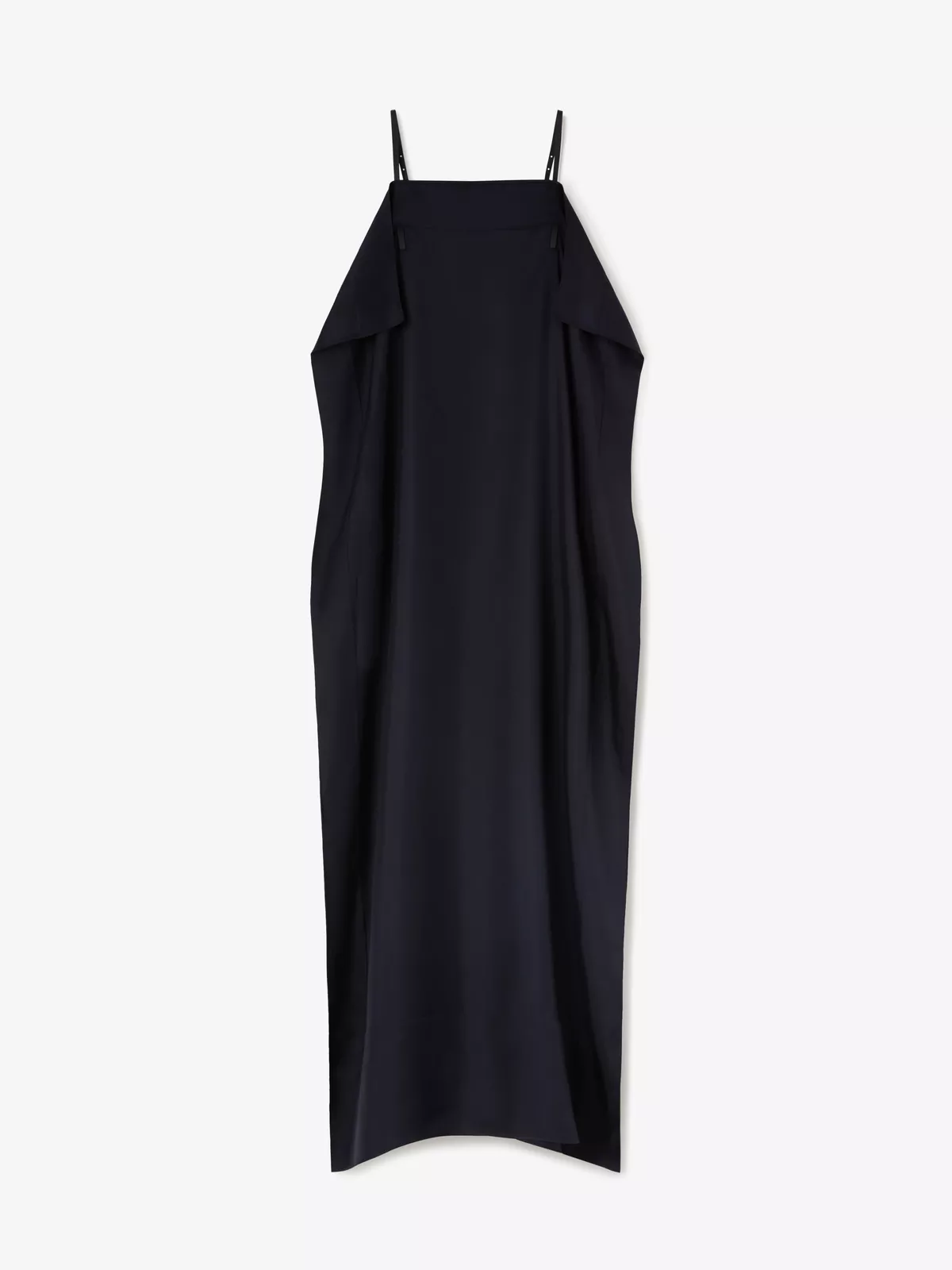 This elegant silk scarf dress has been cut to a long, smooth silhouette with slender calf-leather straps and a zip fastening on the reverse.