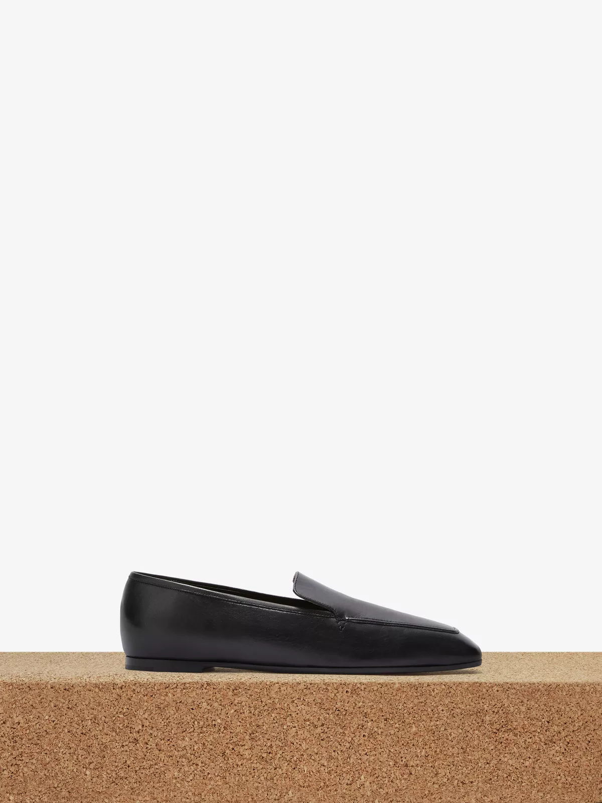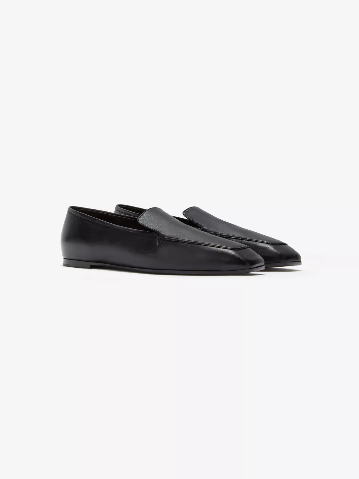 Handmade from a soft kidskin leather, these minimal slip-on shoes have modern topstitching details, a softly pointed toe and a simple shape for everyday wear.