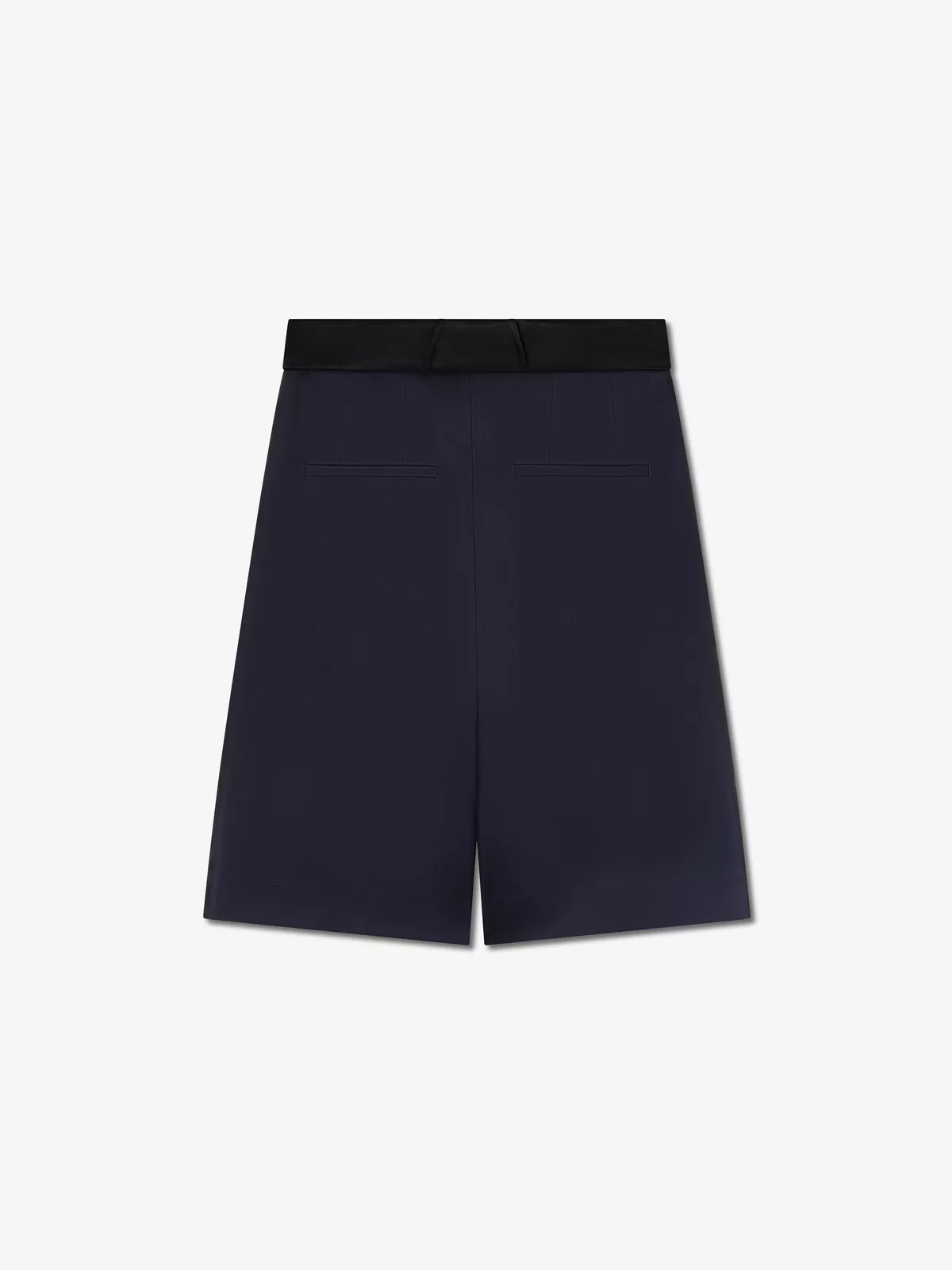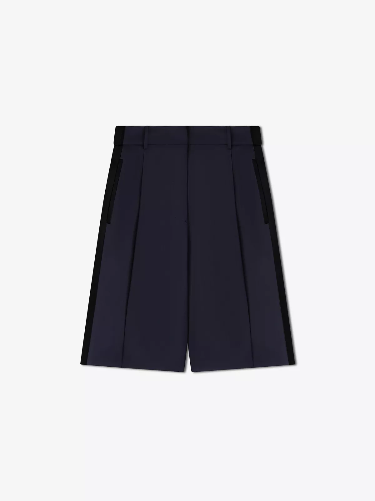 These tailored shorts are cut from fresh cotton gabardine. They have a wide fit, sit high of the waist, have a front soflty pressed pleats, constrast side bands and pockets in tonal cupro silk satin and viscose twill and belt tunnel