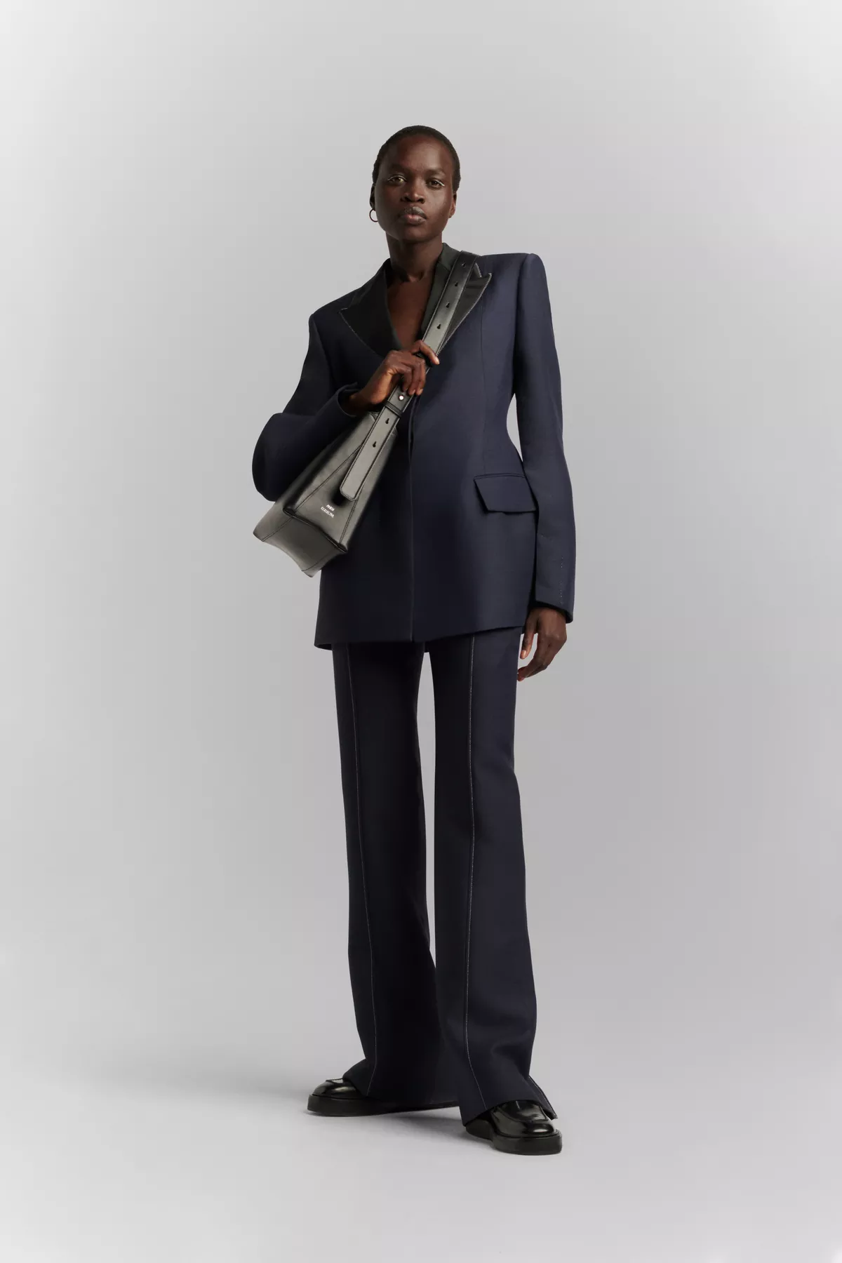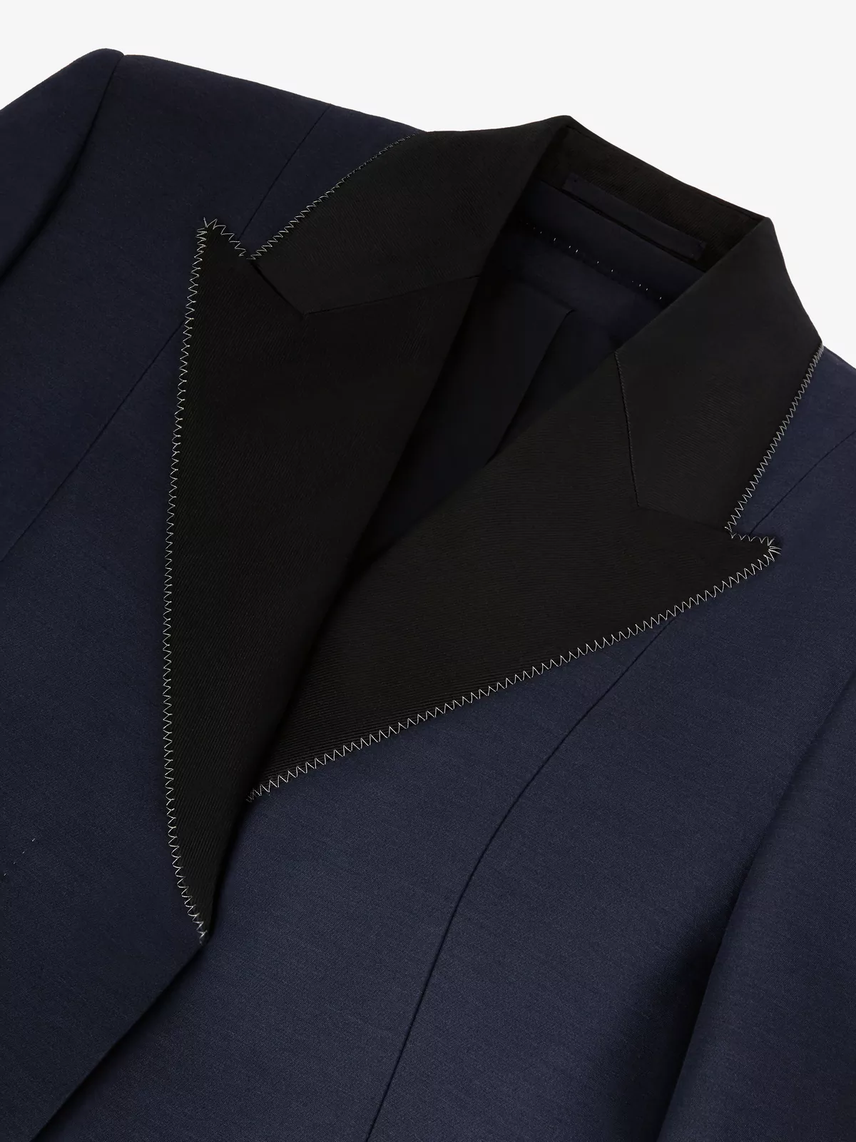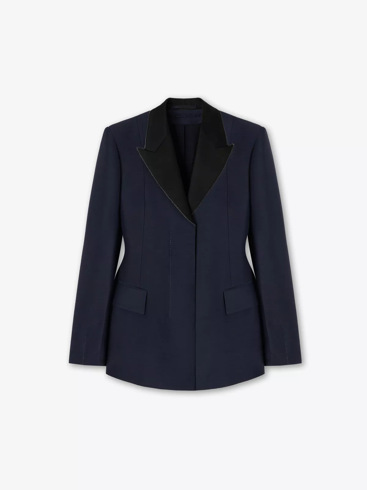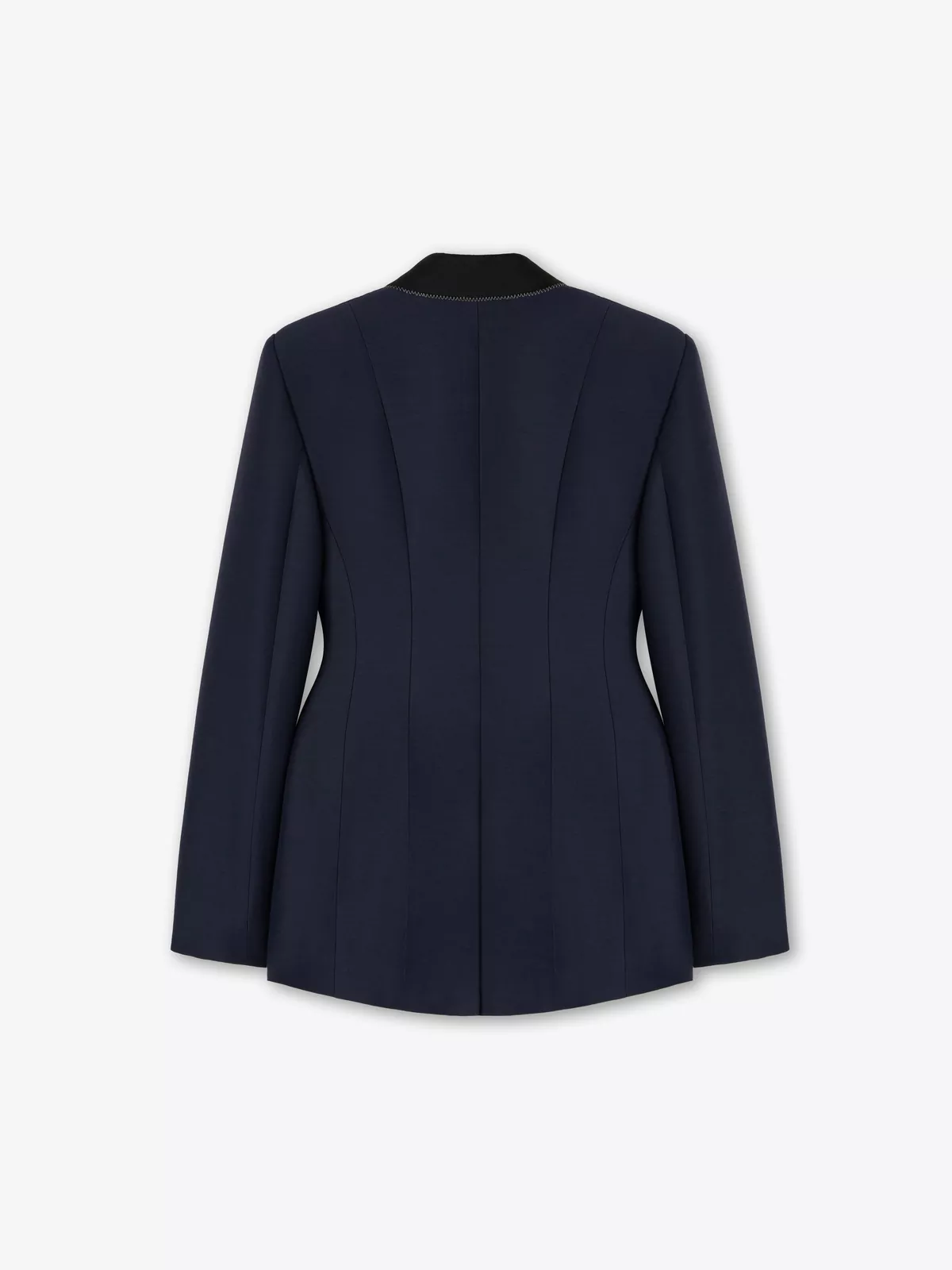 This Tailored Jacket is crafted from a Wool Silk Blend Cadi. It has an elegant and couture look given by open sleeves, constrast cupro and viscose twill details and silver zig zag top stiticthing details.