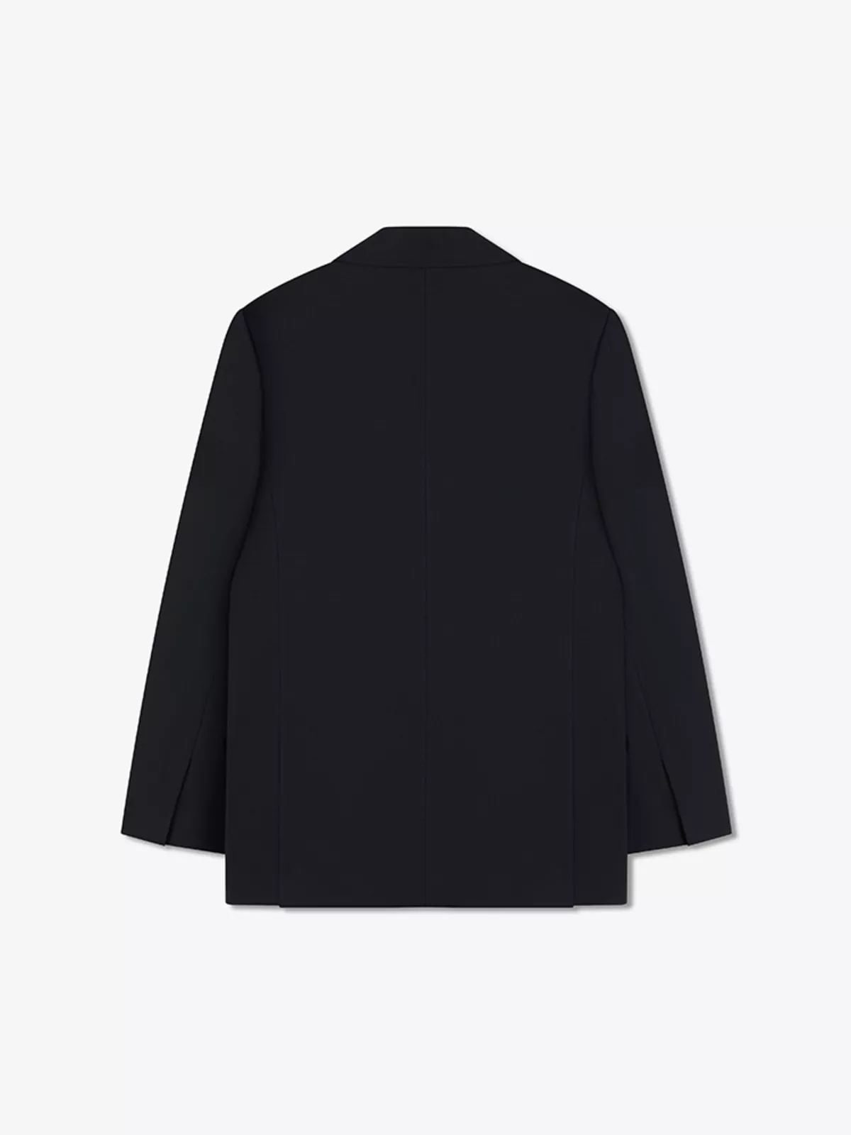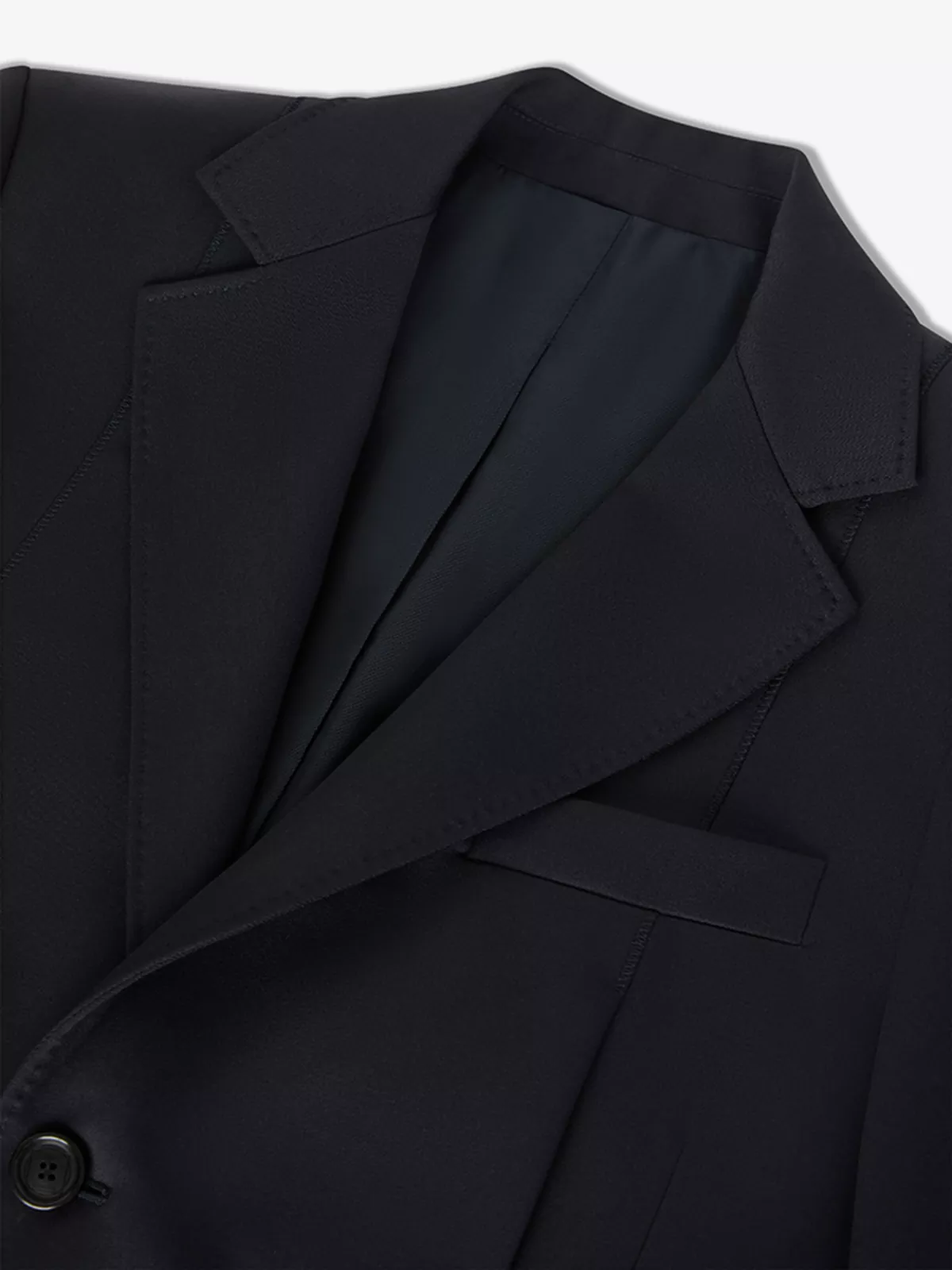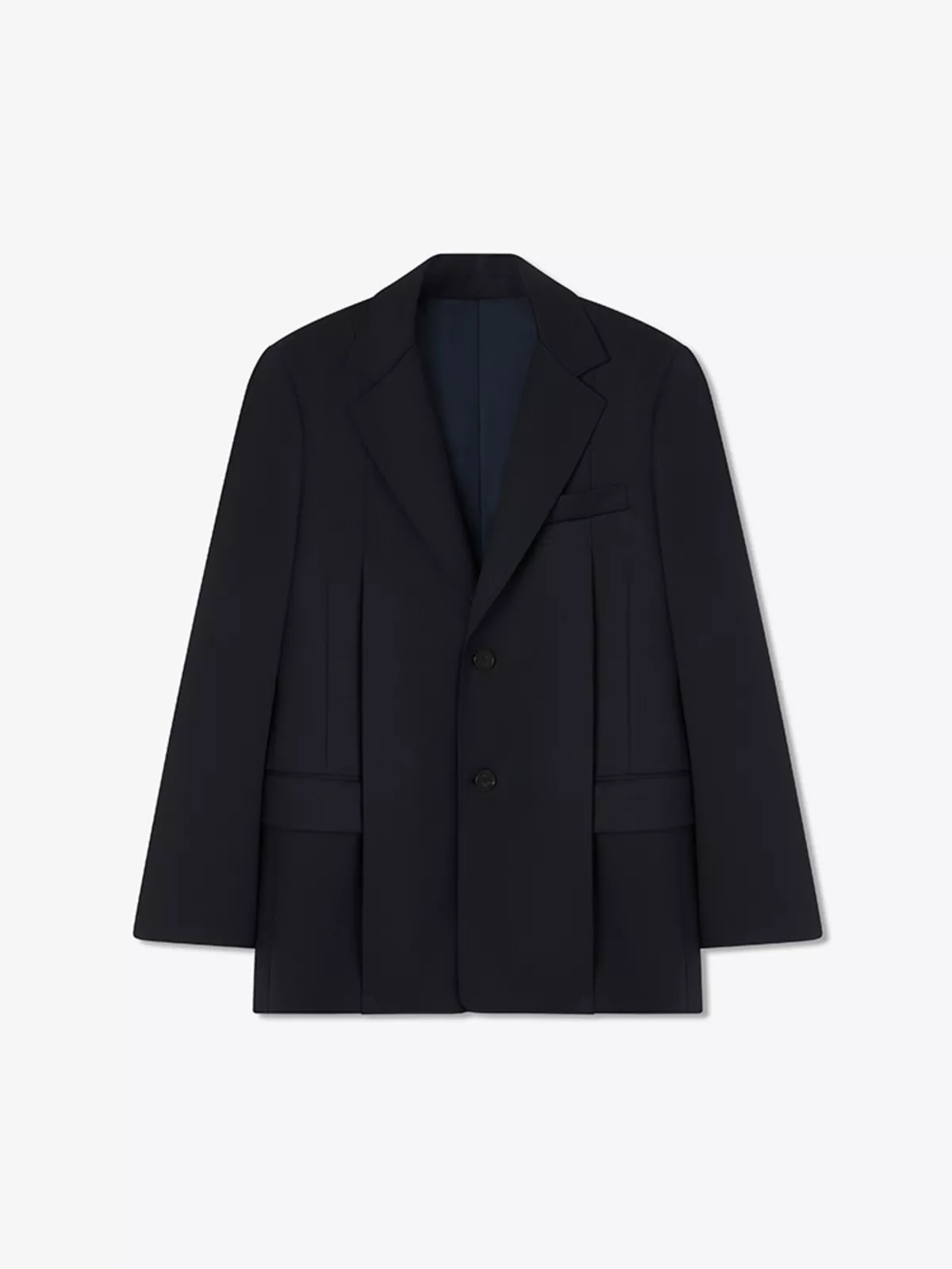 Single-breasted jacket in virgin wool with a pleated front panel with zig-zag top-stitching details. It also has top-stitching on the lapels, back and front hems.