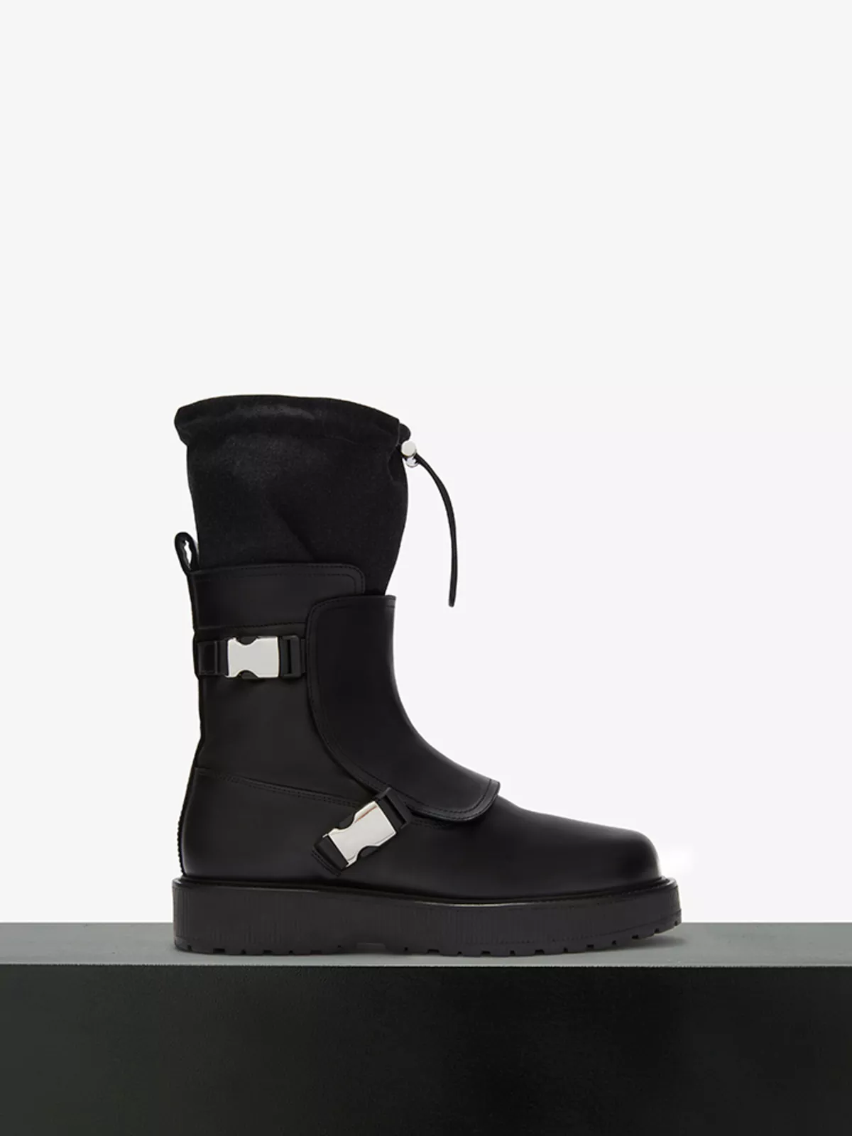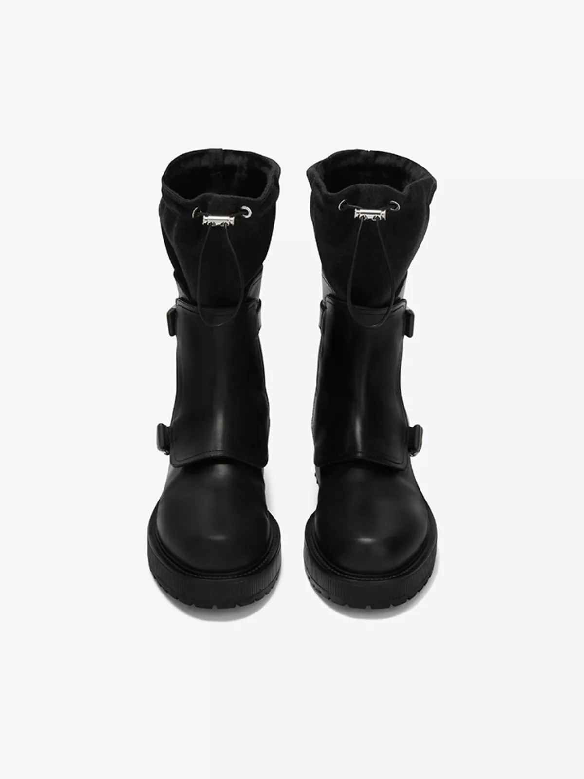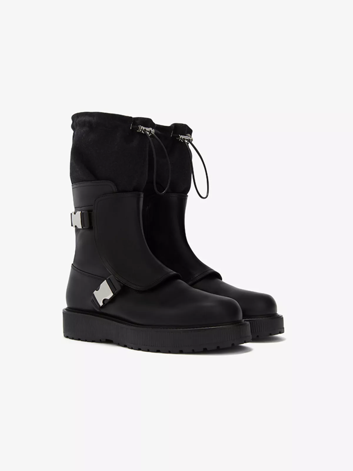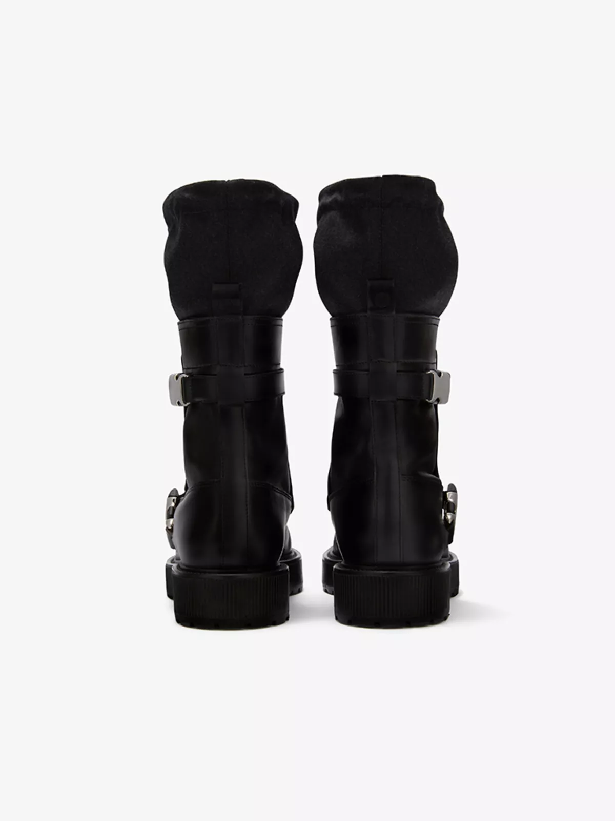 Double-strap boots in calf leather with an internal zip closure, a wool sock with leather pull strings, and a rubber combat sole.