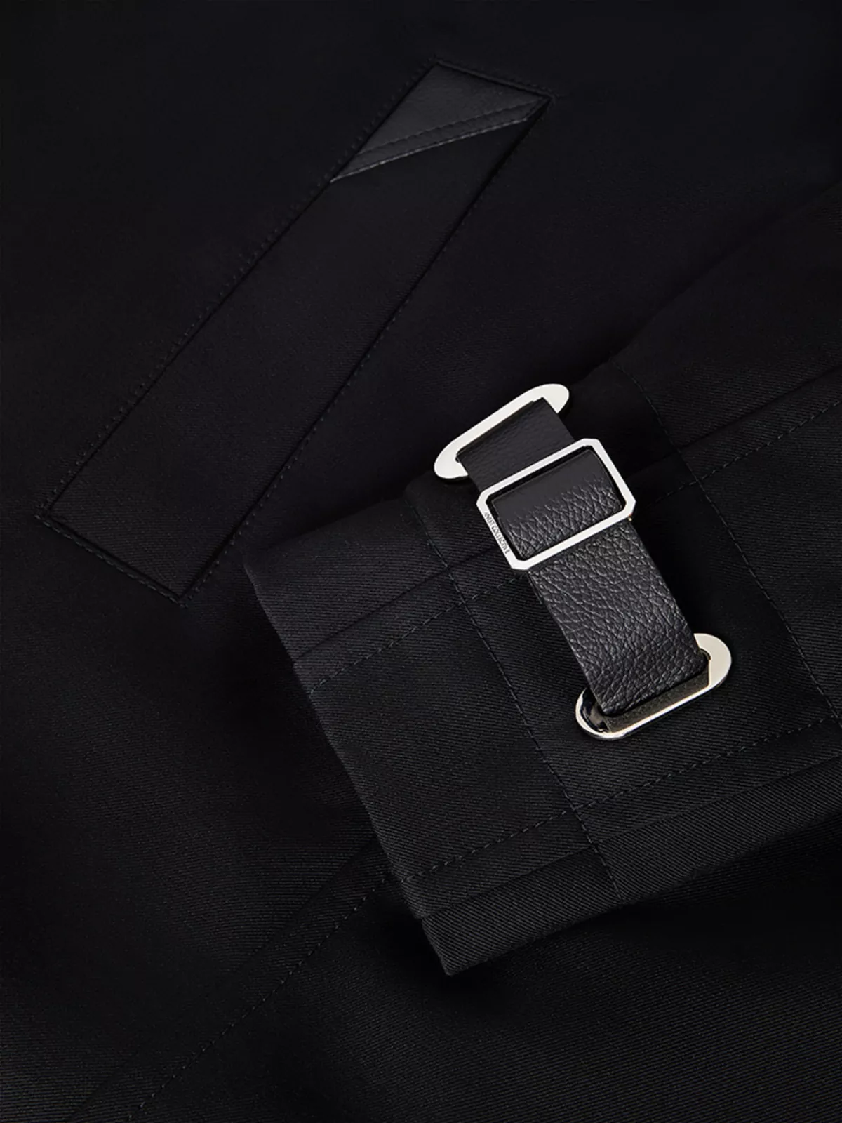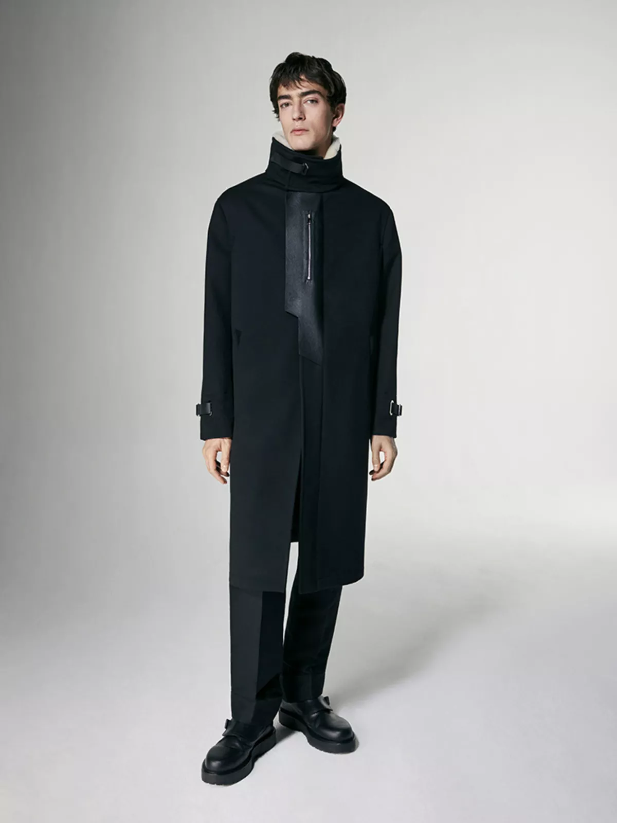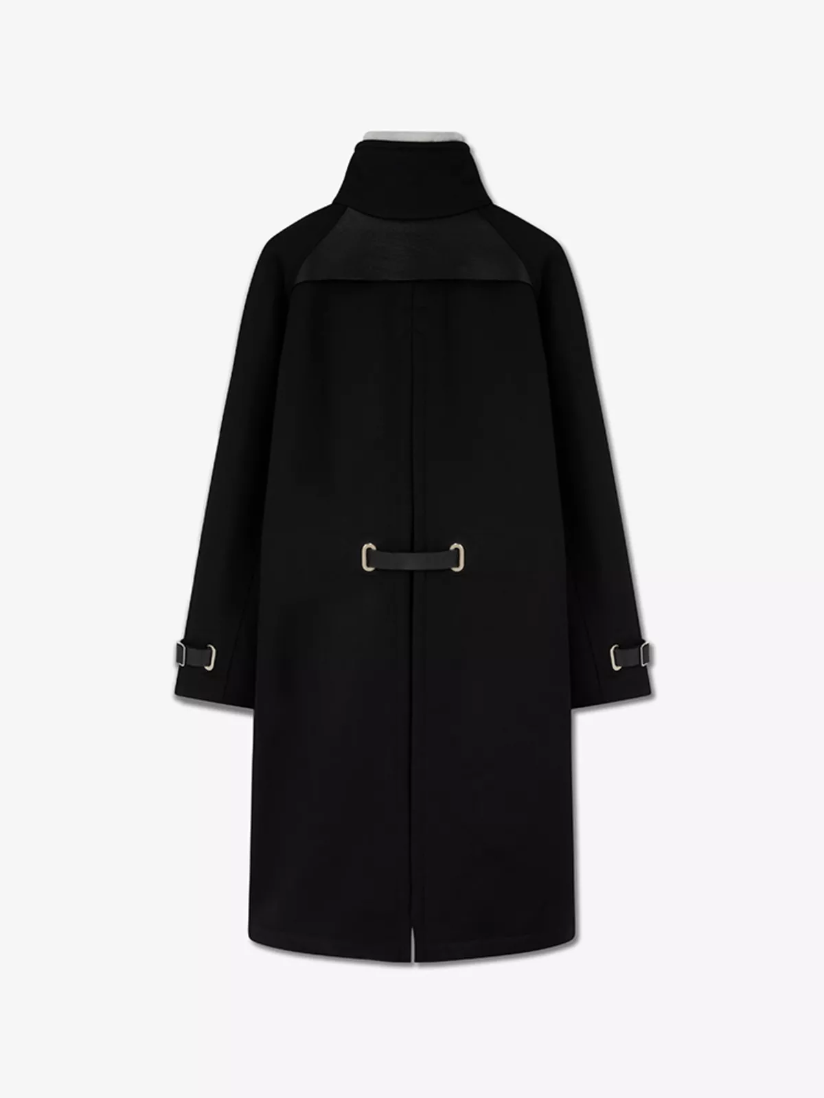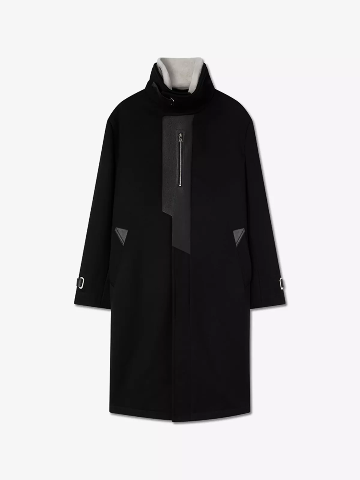 Virgin-wool coat with a contrast leather front panel and cuff straps, and a high shearling-lined detachable collar. It fastens with a concealed front zip and an inner leather belt with metal eyelets.