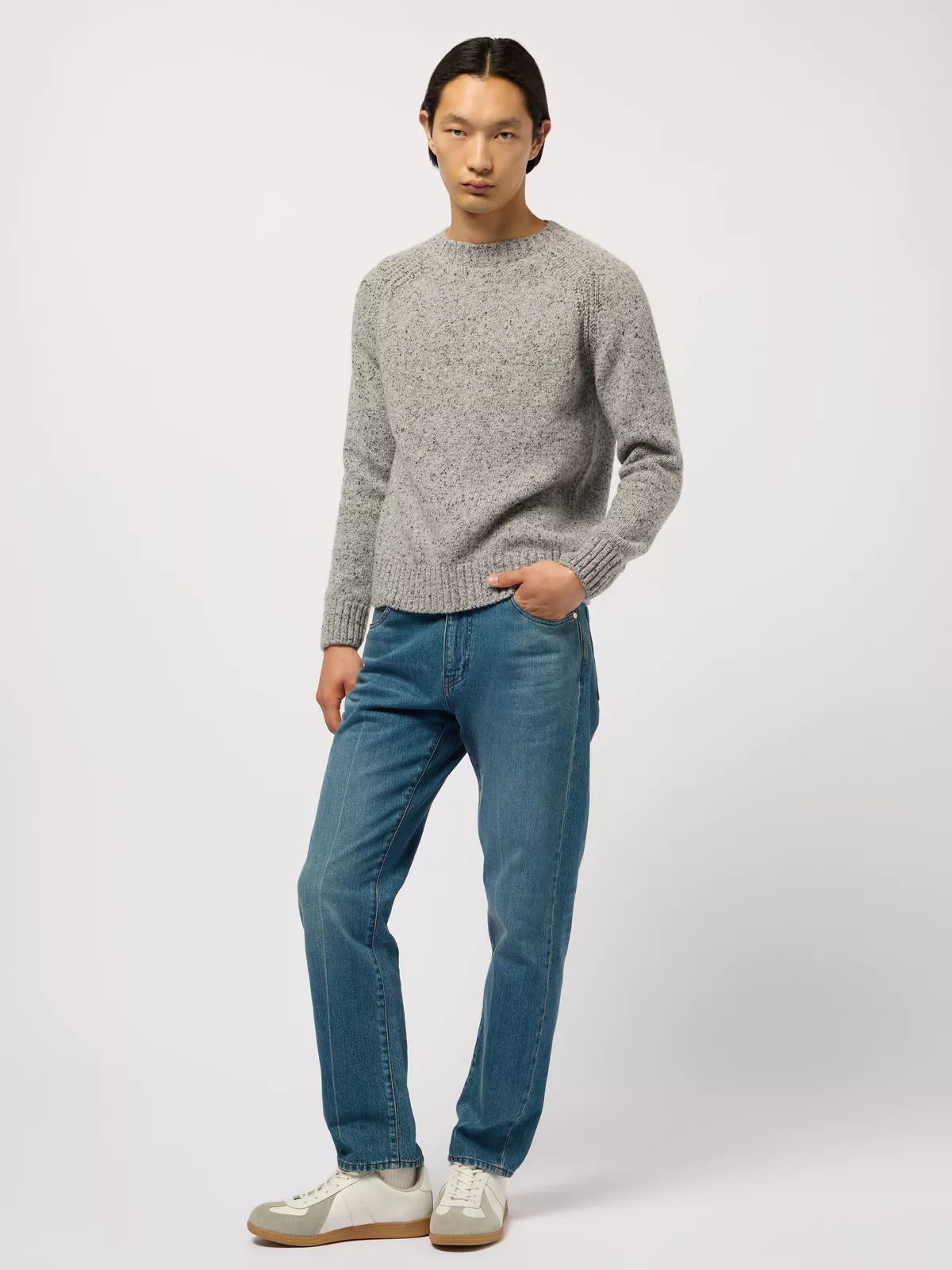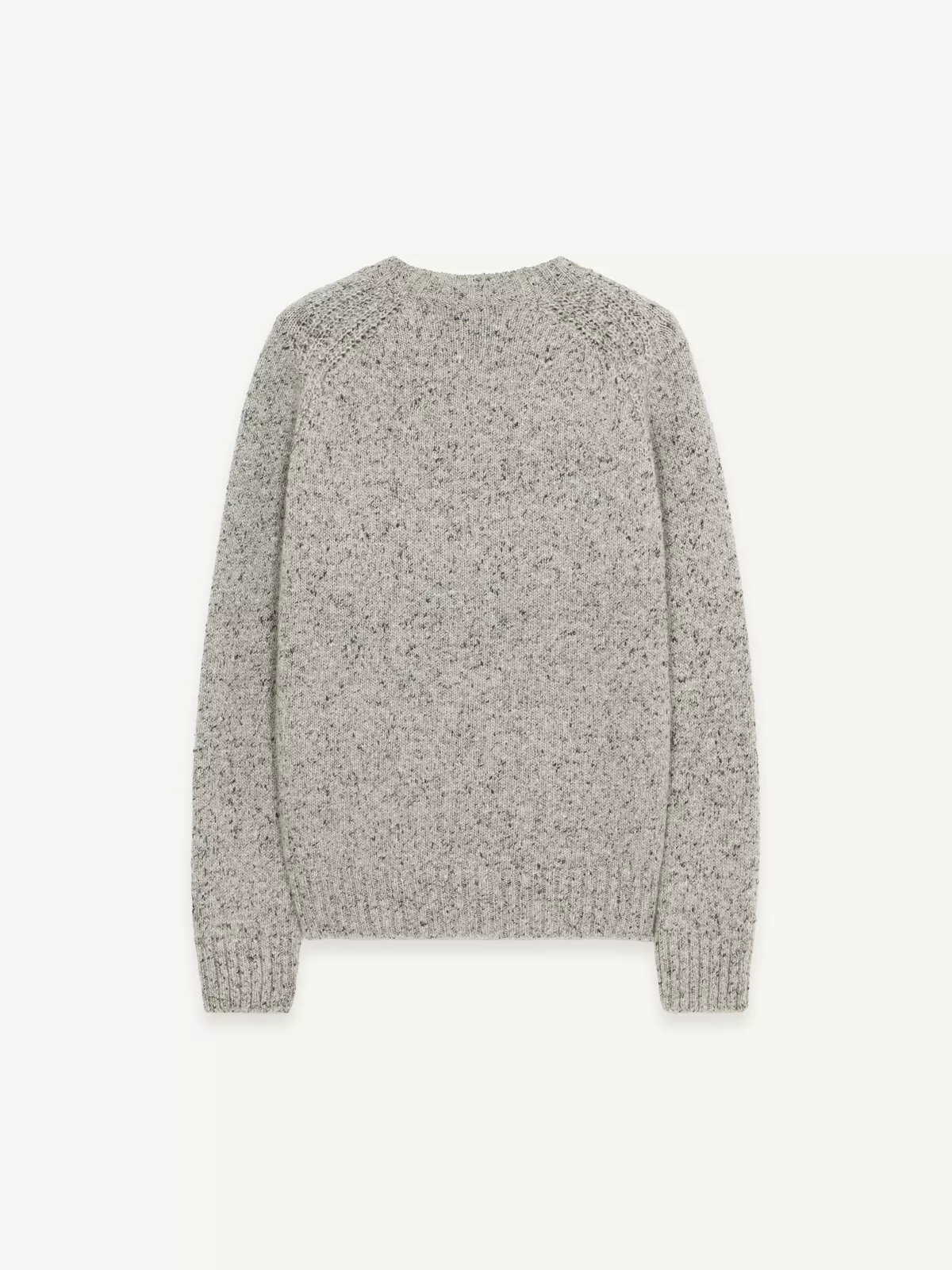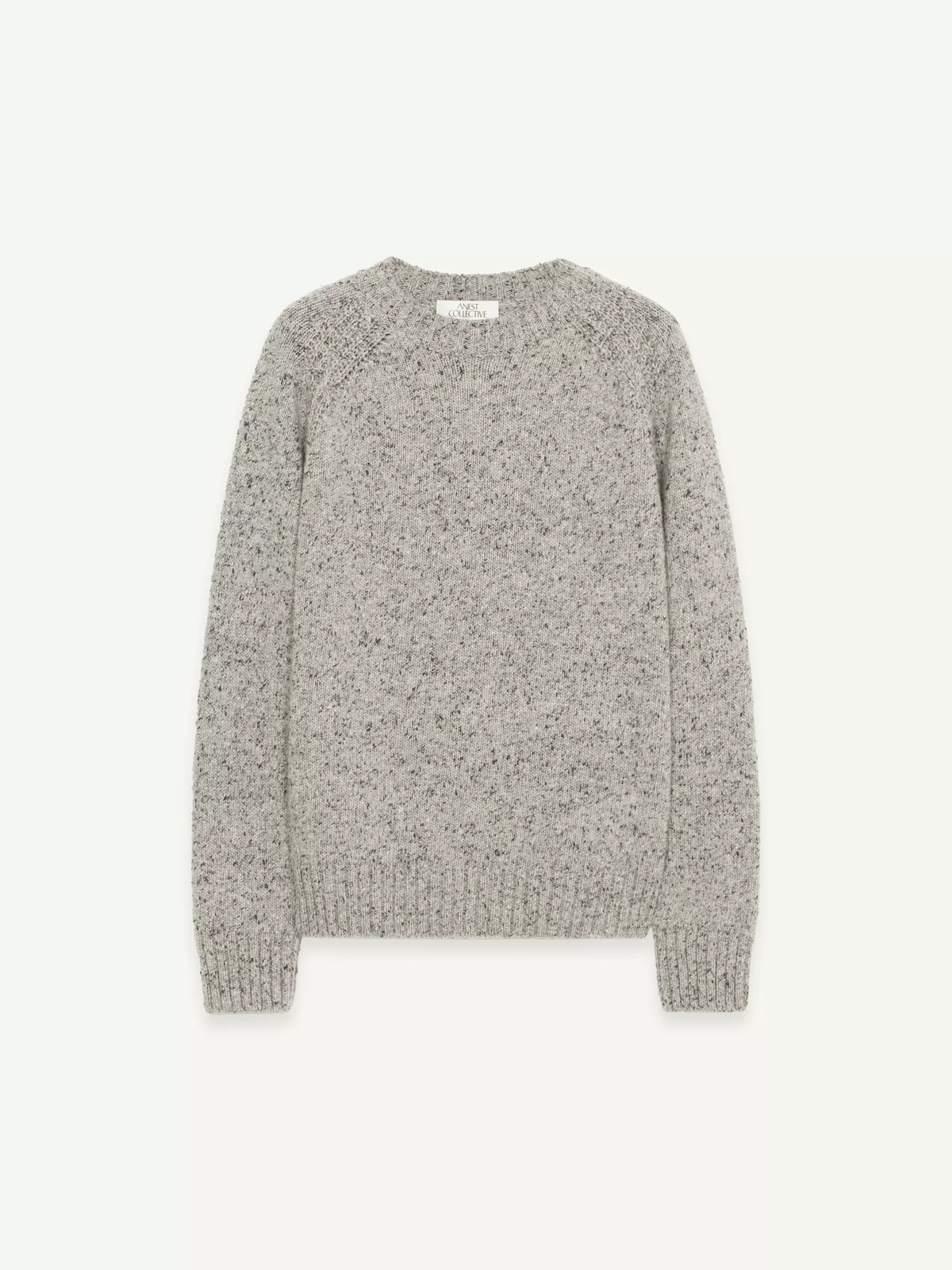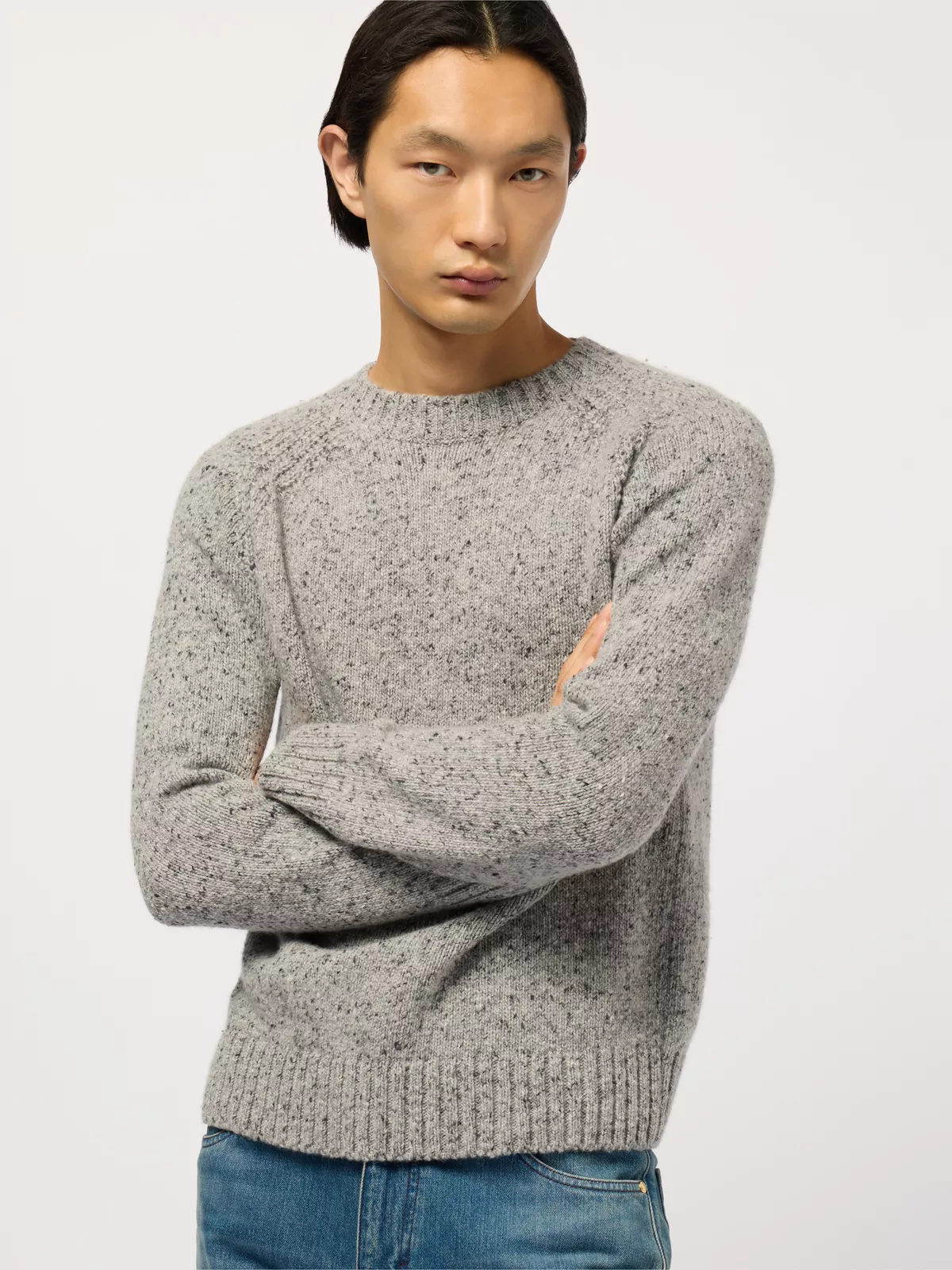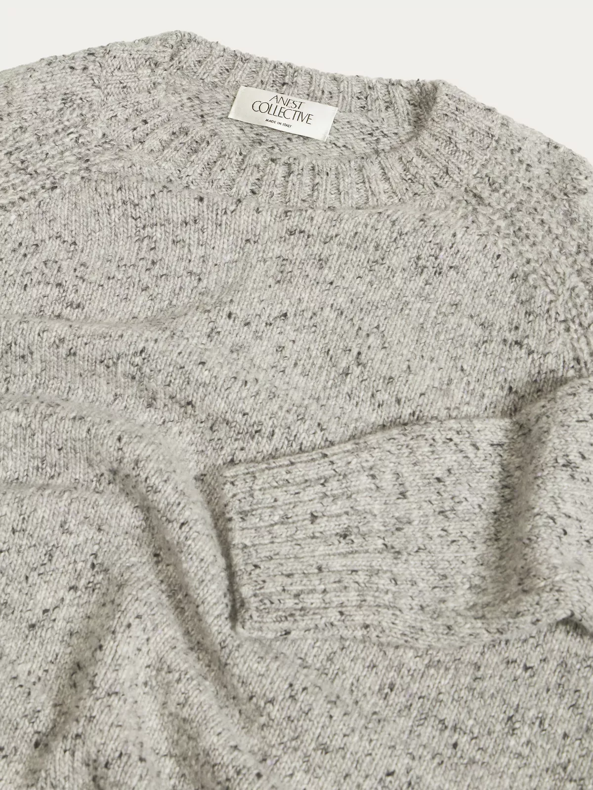 Cashmere twisted yarn gauge 5. Crew neck in stockinette stitch with saddled shoulder detail. Anest monogram patch with black and grey embroidery.