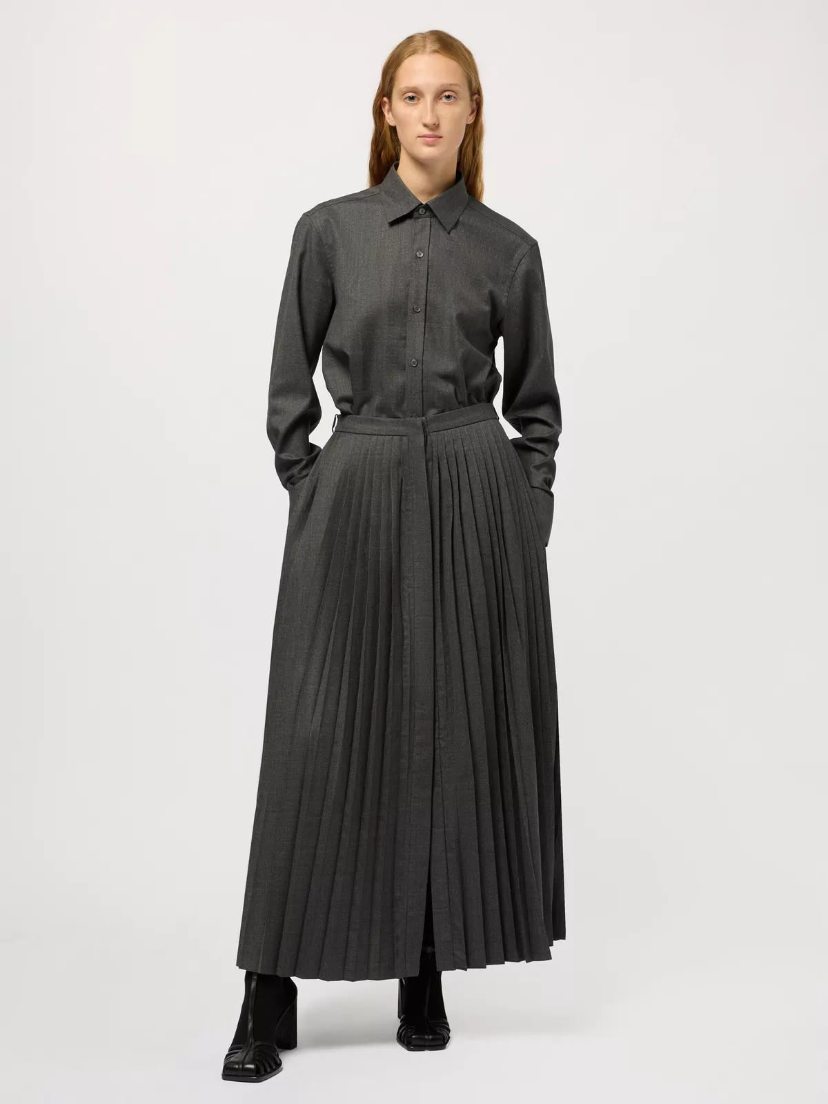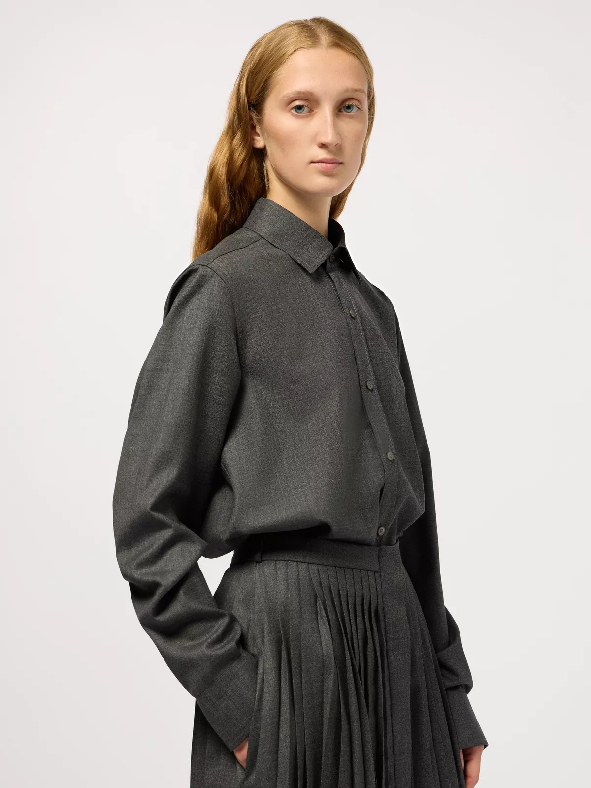 This unisex silhouette is the definitive of the perfect classic tailored shirt. The characteristic of this shirt is the light construction present in the collar, cuff, and front button closer, fabricated in a soft airy light weight grisaille wool, classically used in tailoring which gives the style modern and timeless interpretation.