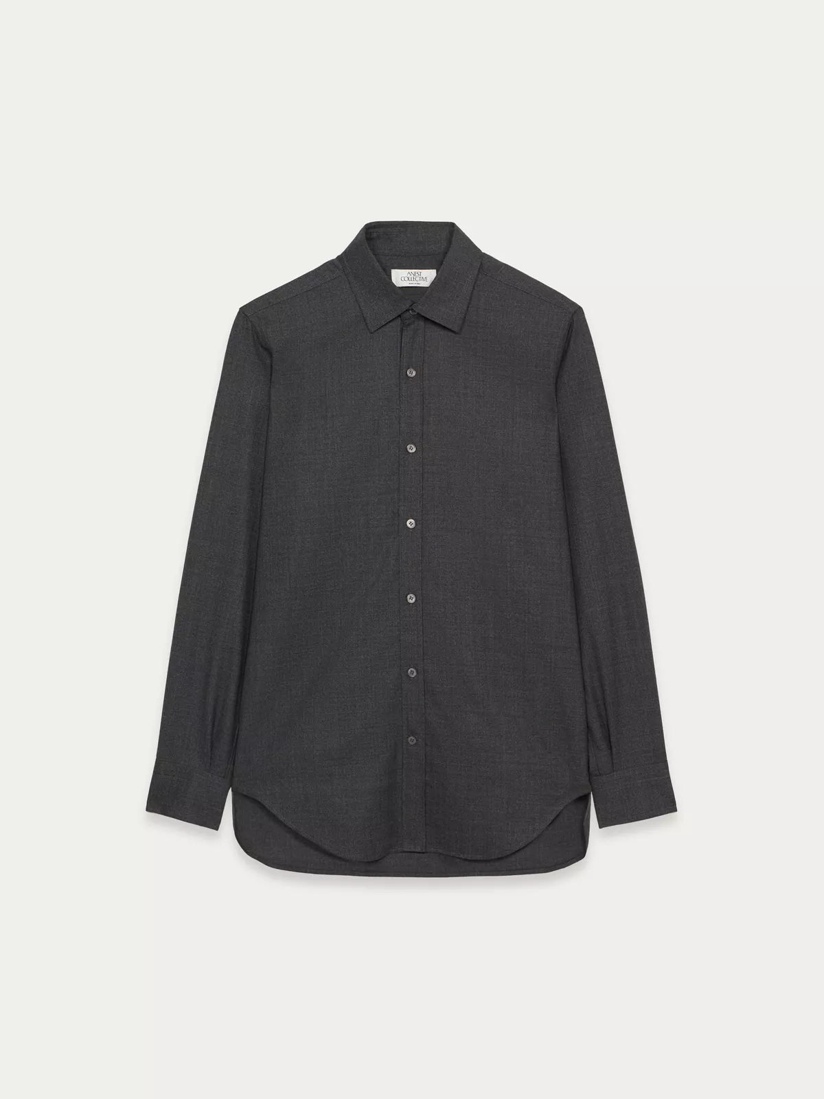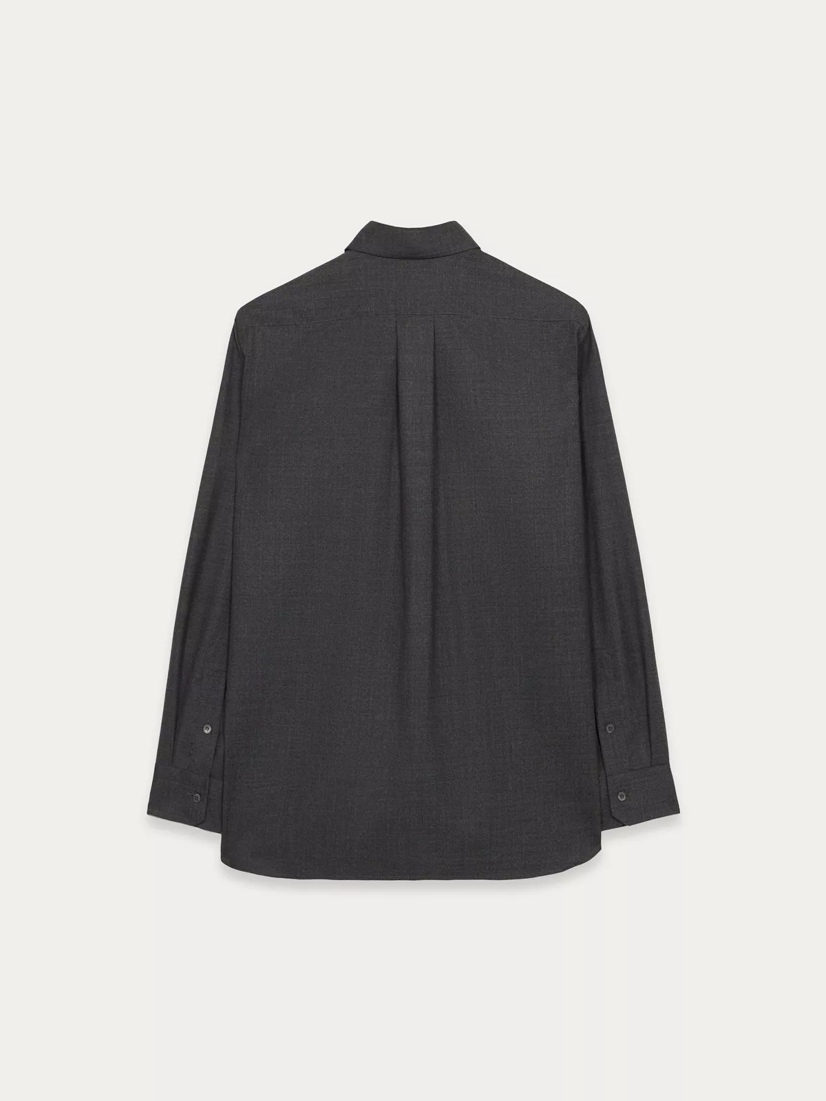 This unisex silhouette is the definitive of the perfect classic tailored shirt. The characteristic of this shirt is the light construction present in the collar, cuff, and front button closer, fabricated in a soft airy light weight grisaille wool, classically used in tailoring which gives the style modern and timeless interpretation.