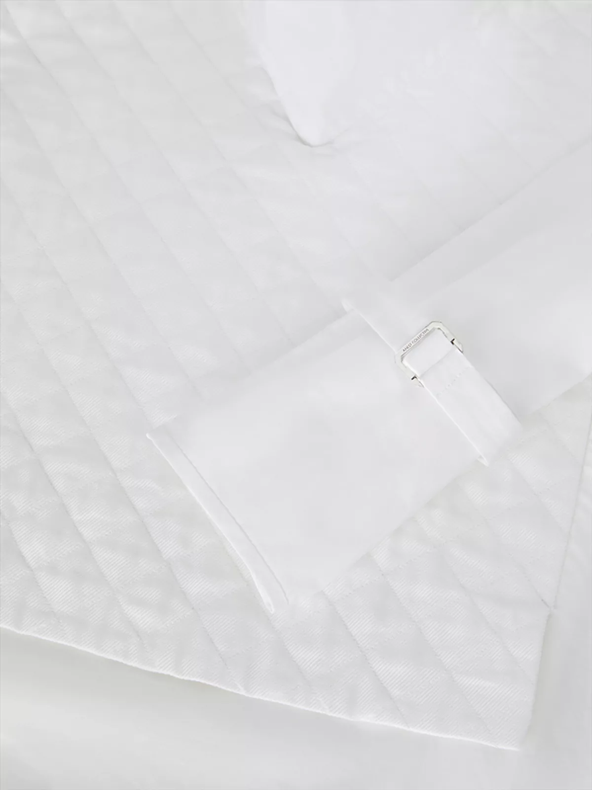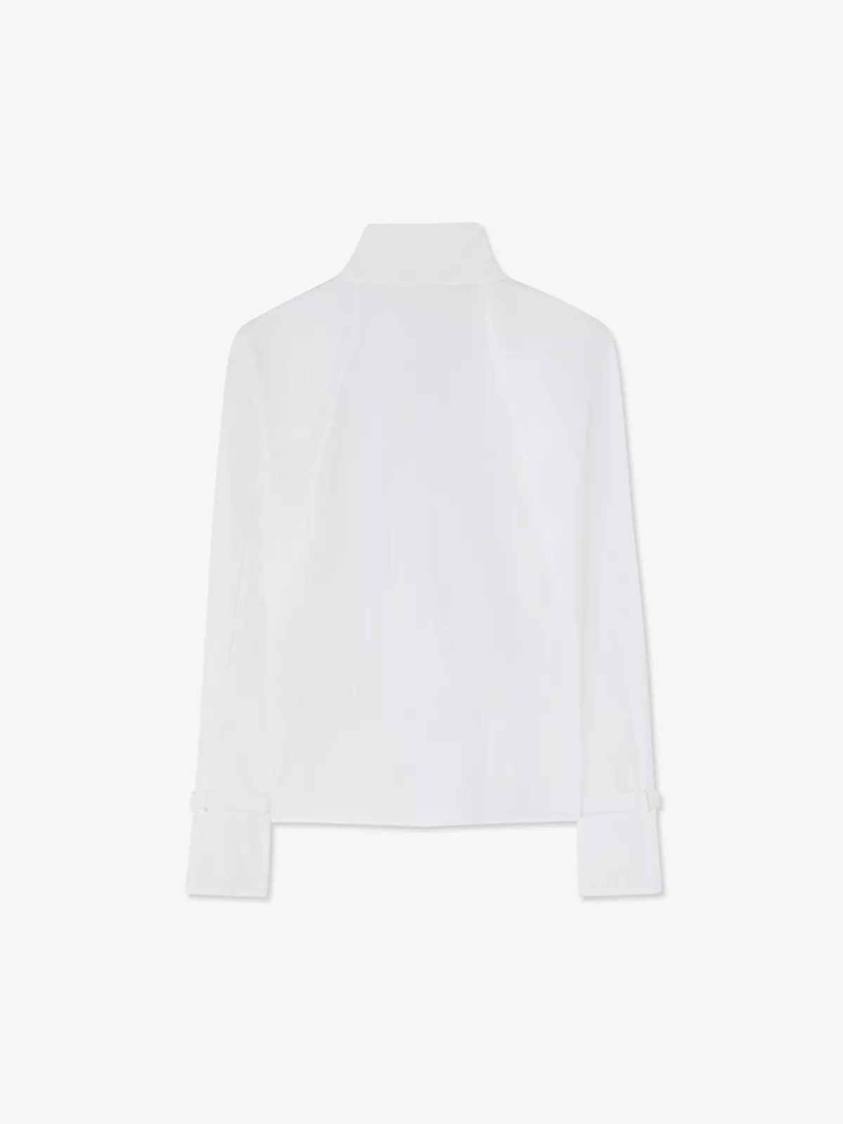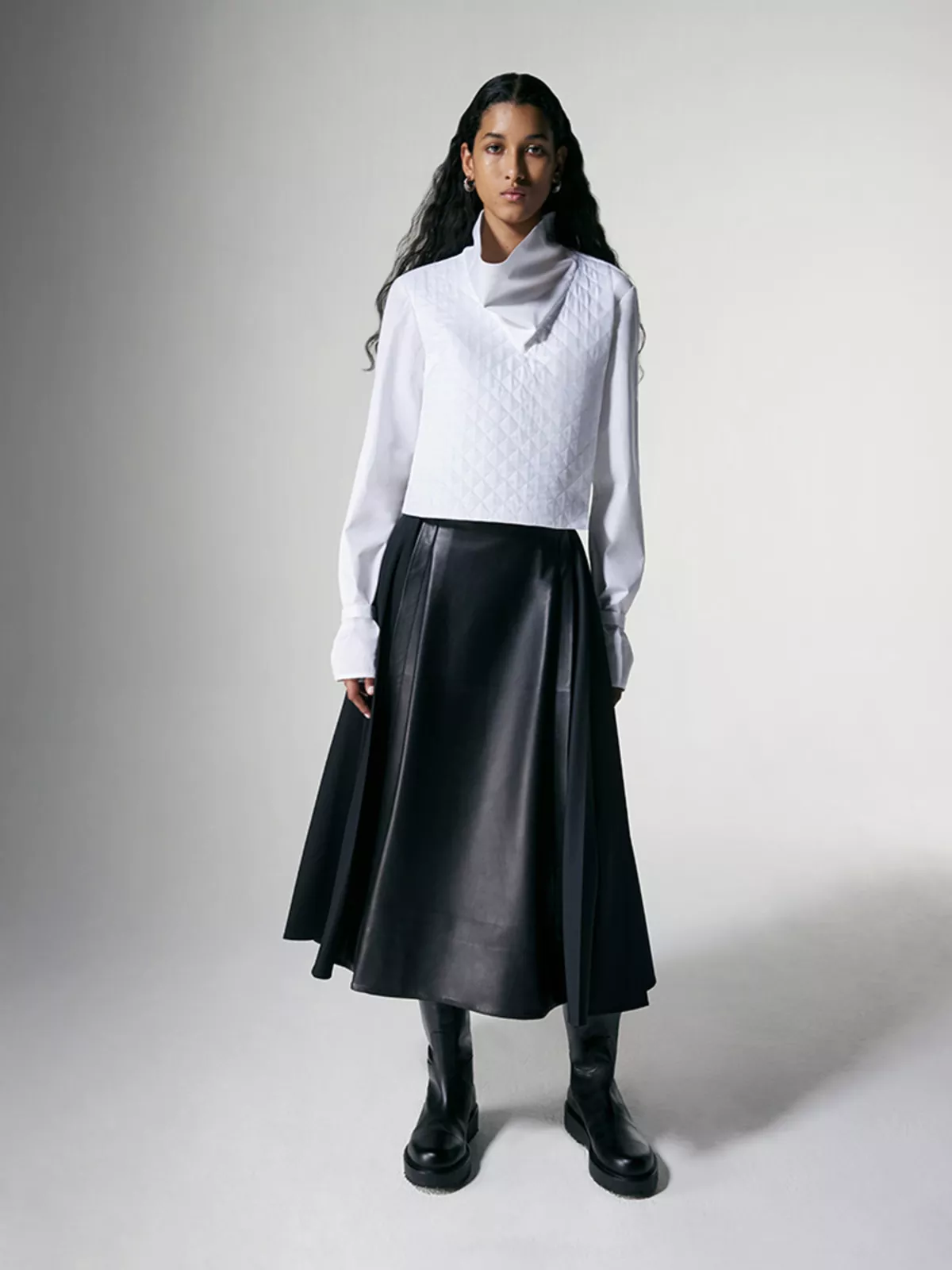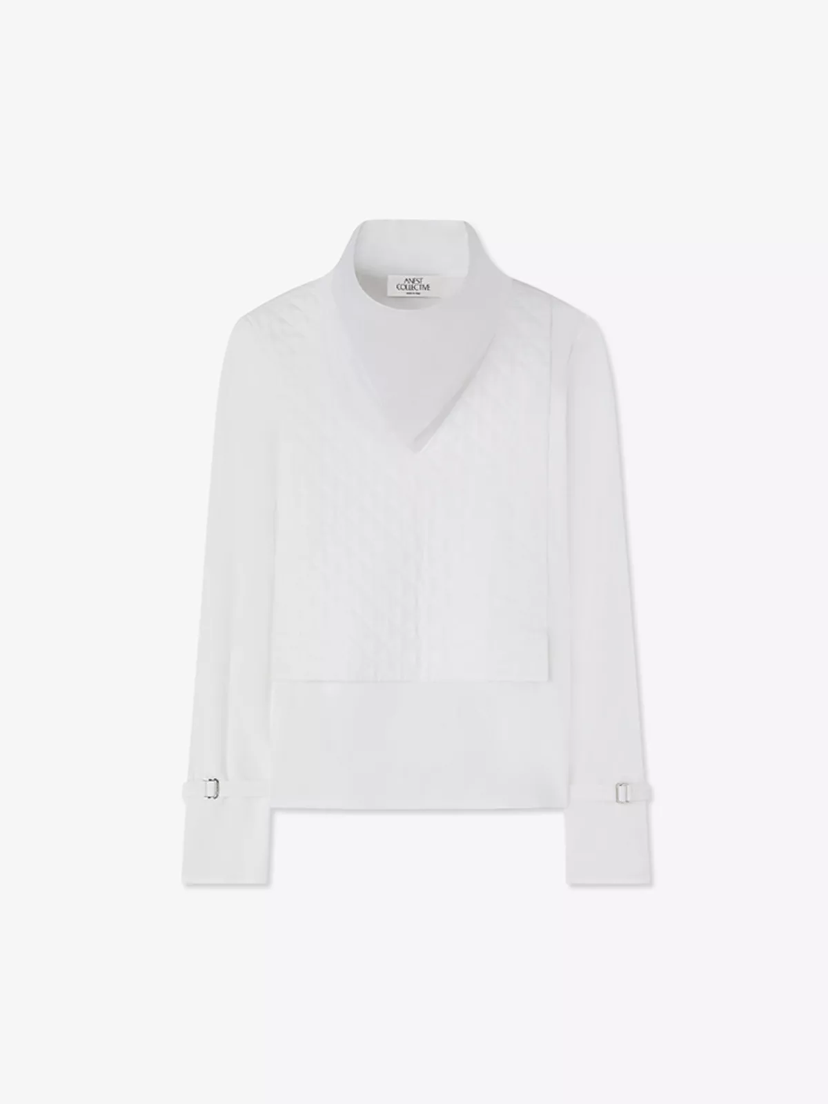 Cotton top with a quilted front panel, cowl neck and cuff straps with metal buckles. It has a shoulder button fastening.