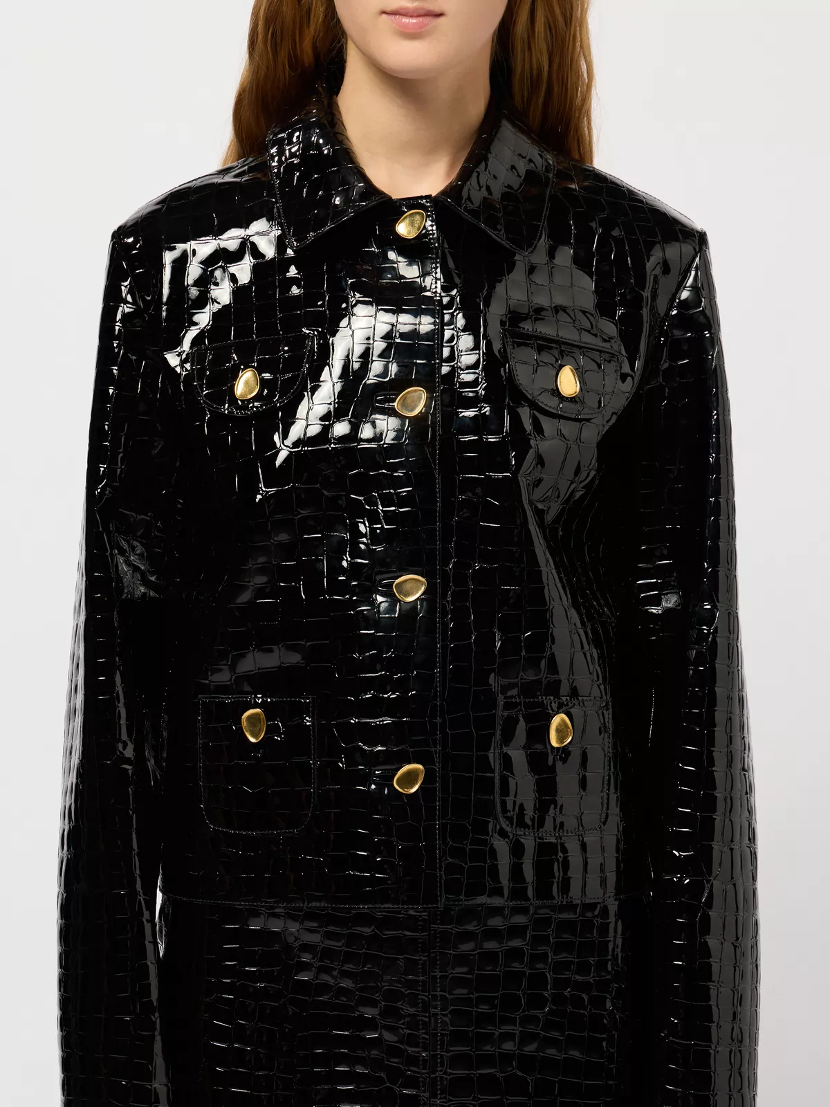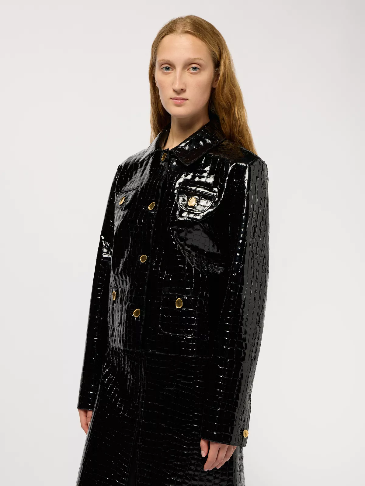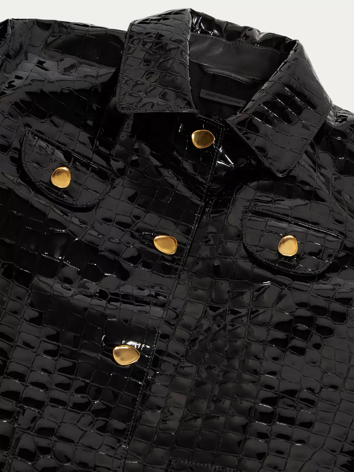 This richly textured Square-shaped leather blouson made in croco-printed calf skin, with painted edges. Patch pockets detail and finished with gold Jewellery buttons. Fully lined. Was inspired by a precious 1960’s Vanity case, used to hold the most loved possessions when travelling.