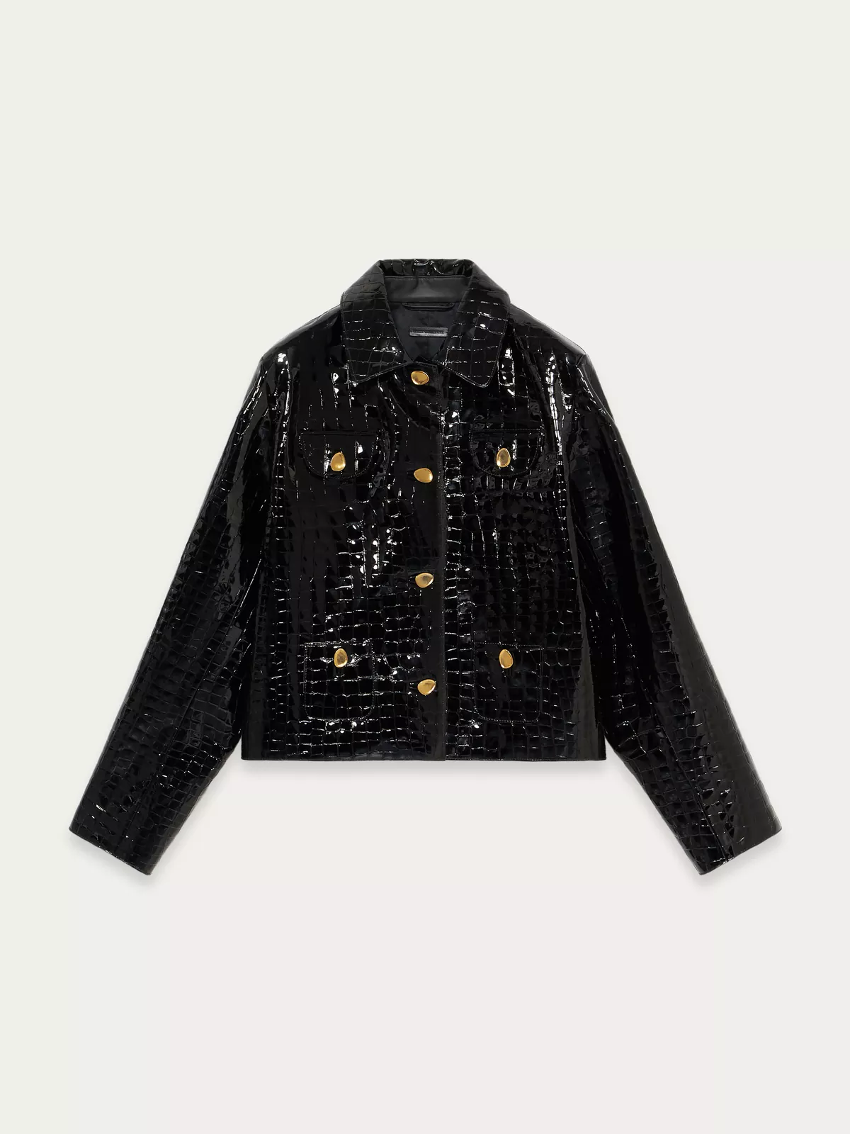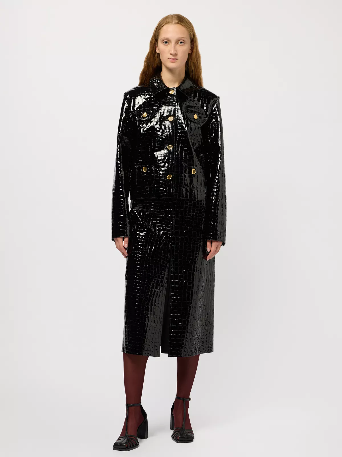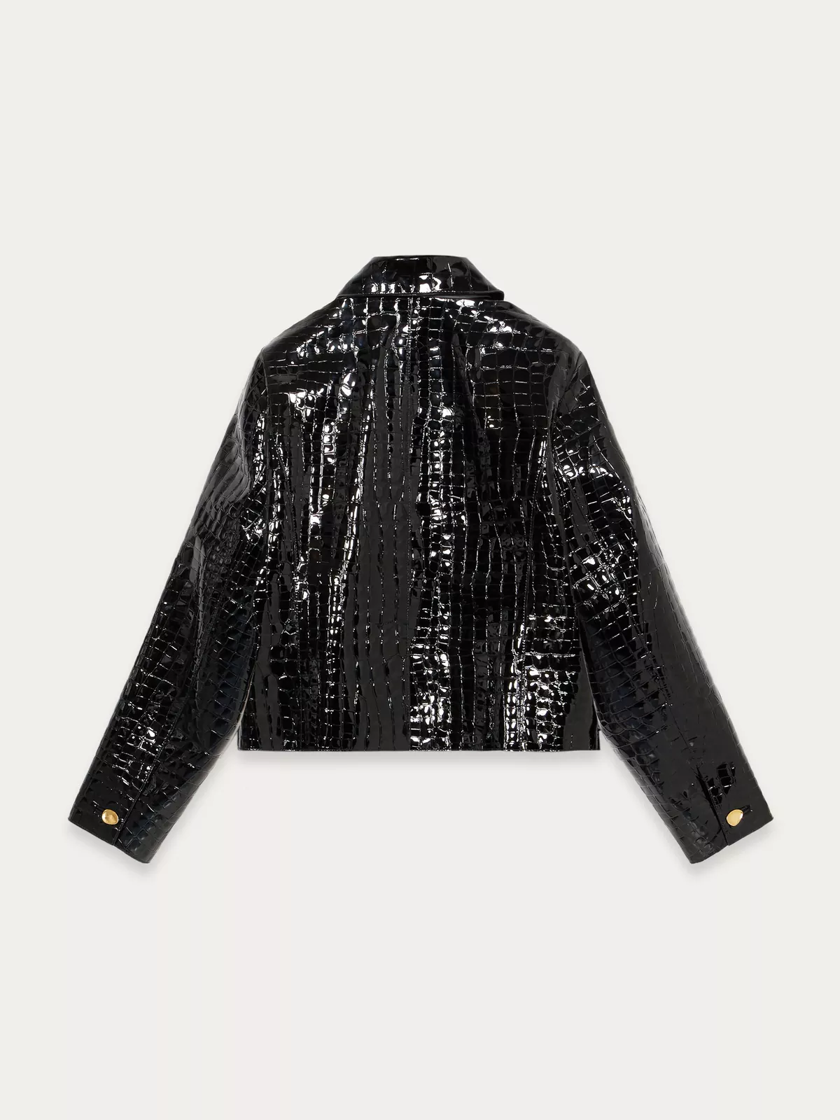 This richly textured Square-shaped leather blouson made in croco-printed calf skin, with painted edges. Patch pockets detail and finished with gold Jewellery buttons. Fully lined. Was inspired by a precious 1960’s Vanity case, used to hold the most loved possessions when travelling.