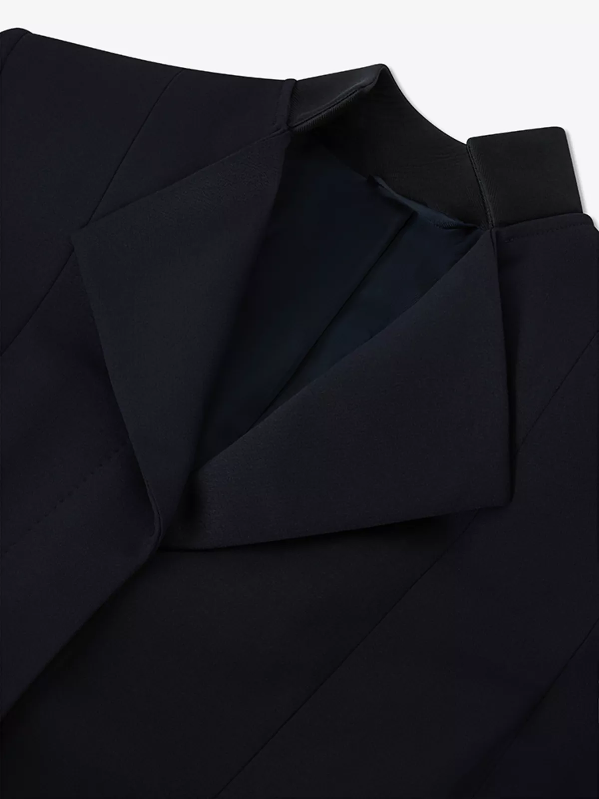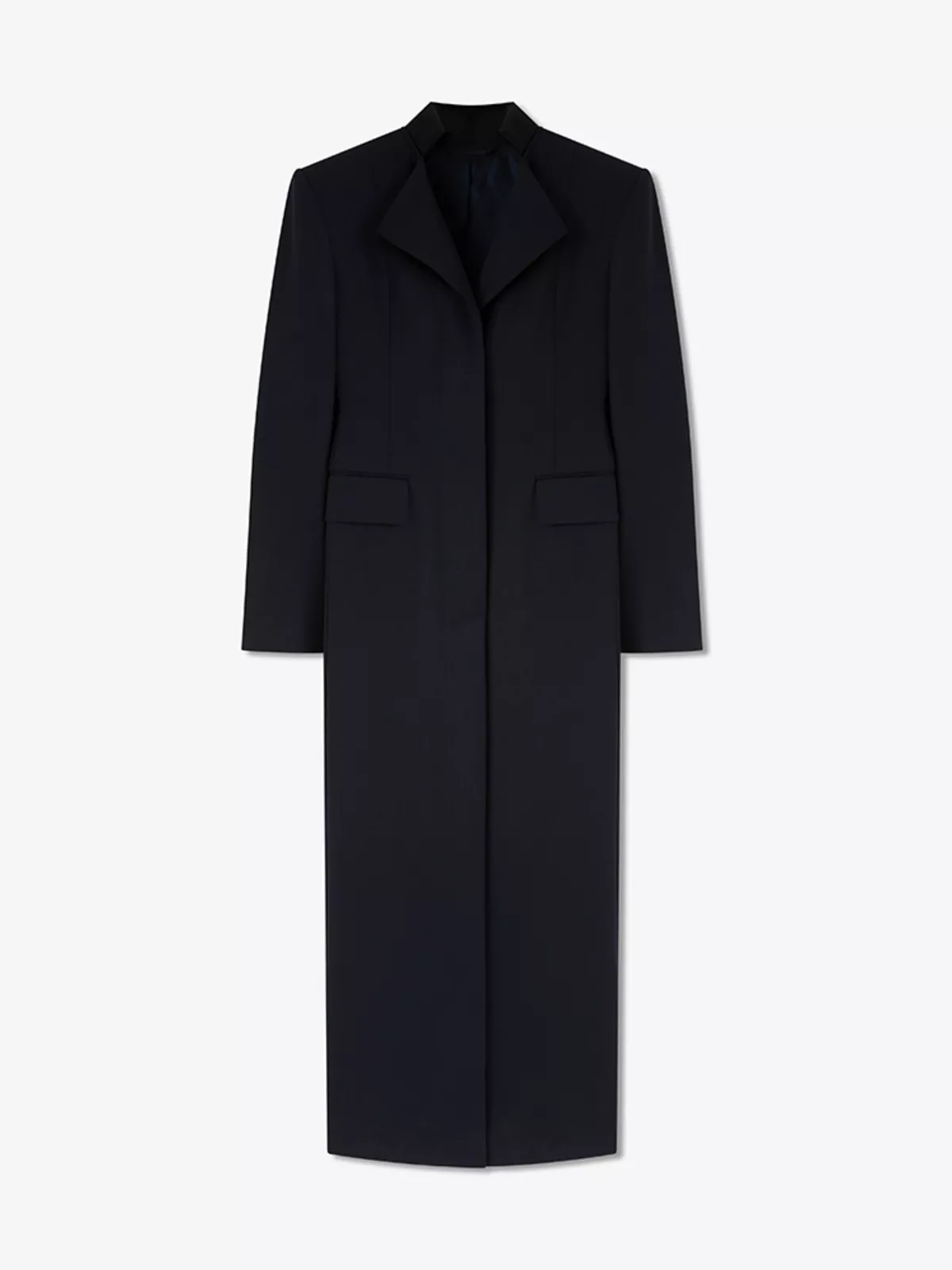 Single-breasted tailored overcoat in virgin wool with a stand-up collar in silk-canneté. It has a concealed front button fastening with top-stitching details and a back slit.