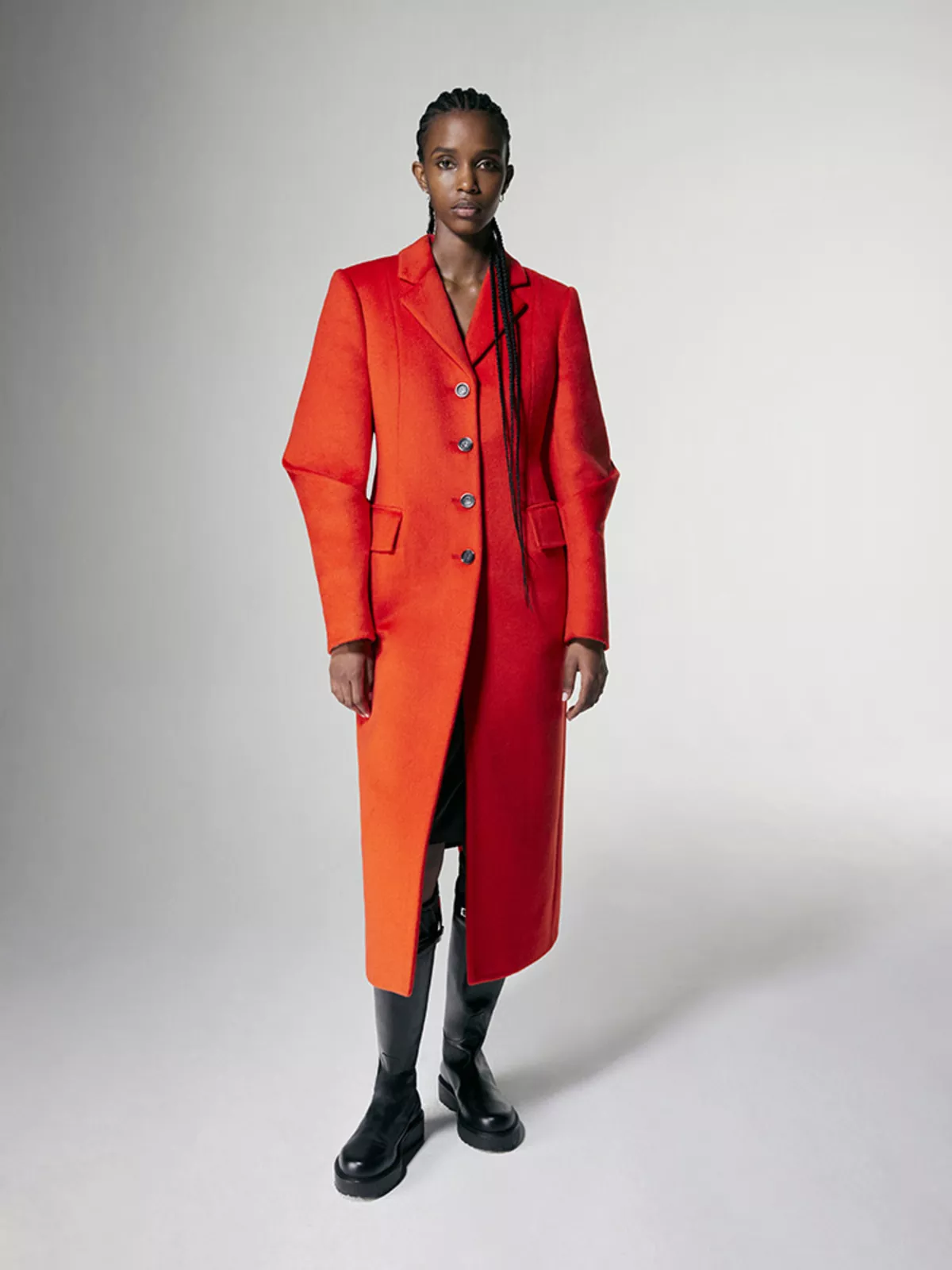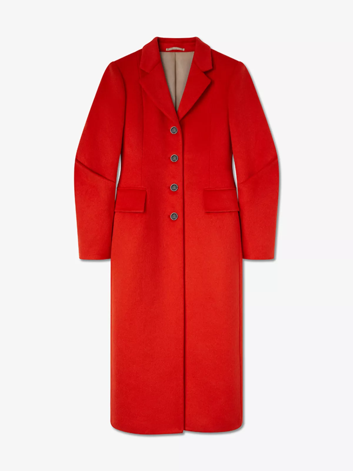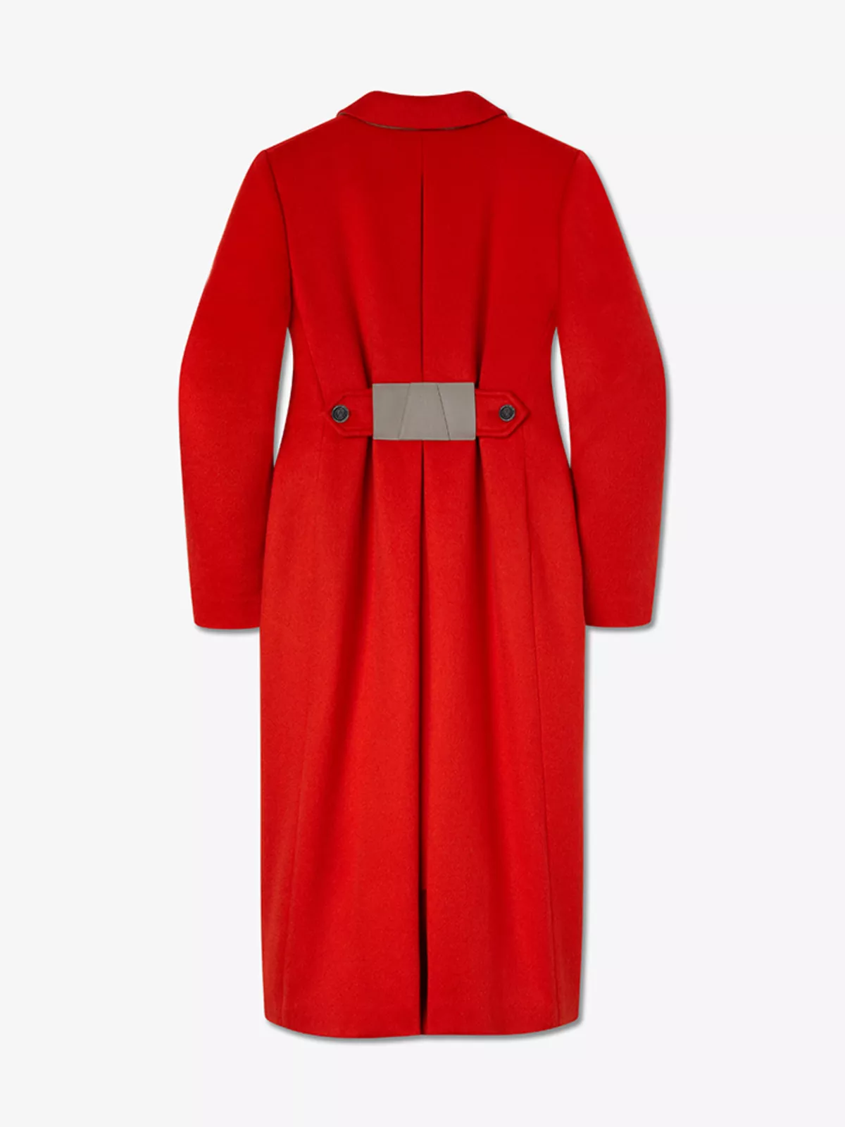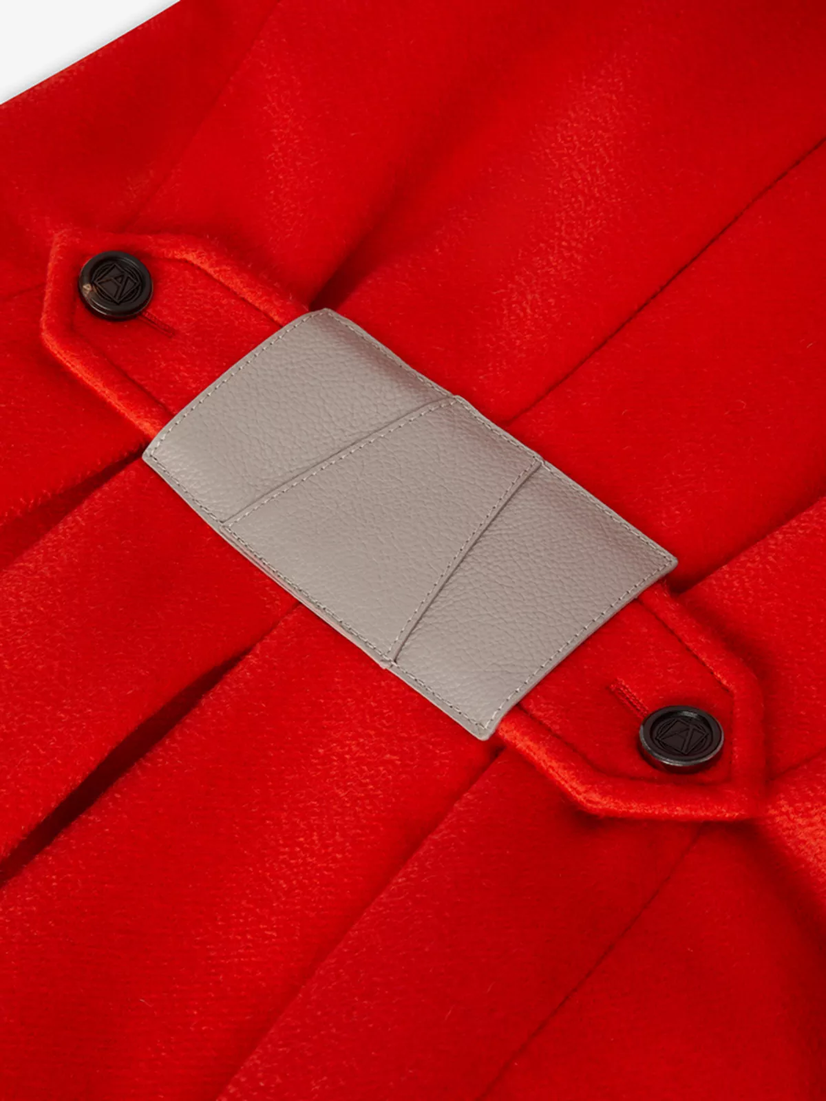 Double-cashmere-blend, bi-colour, single-breasted coat, with oversize elbow sleeves and a martingale on the back with leather belt loops. It fastens with our signature horn and metal ‘A’ buttons.