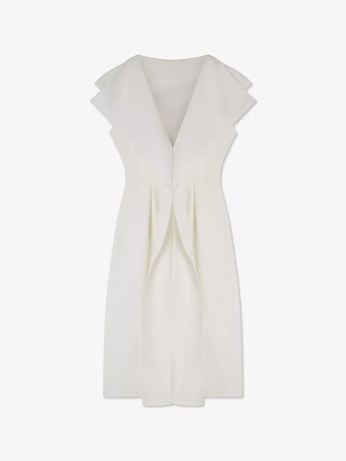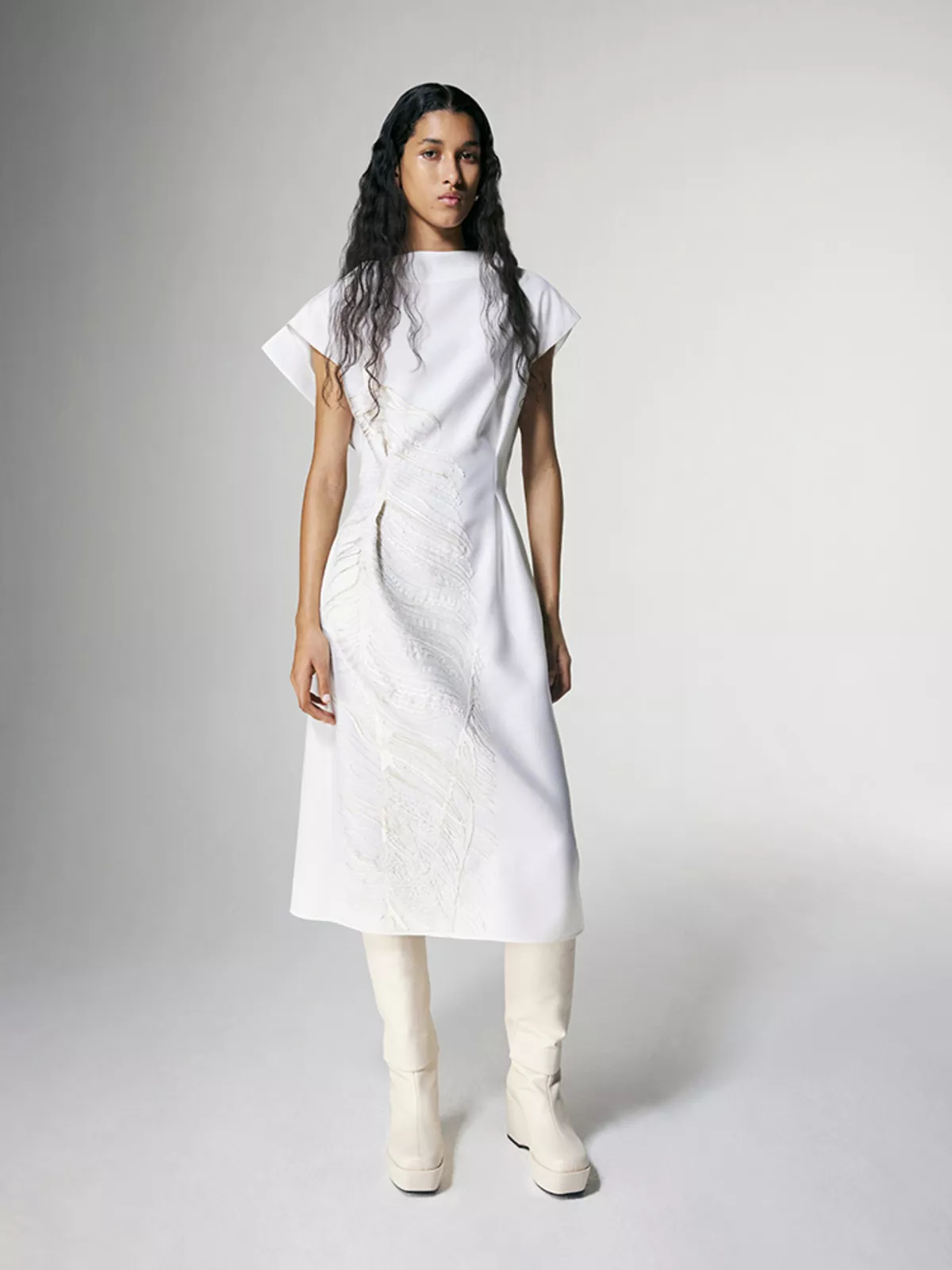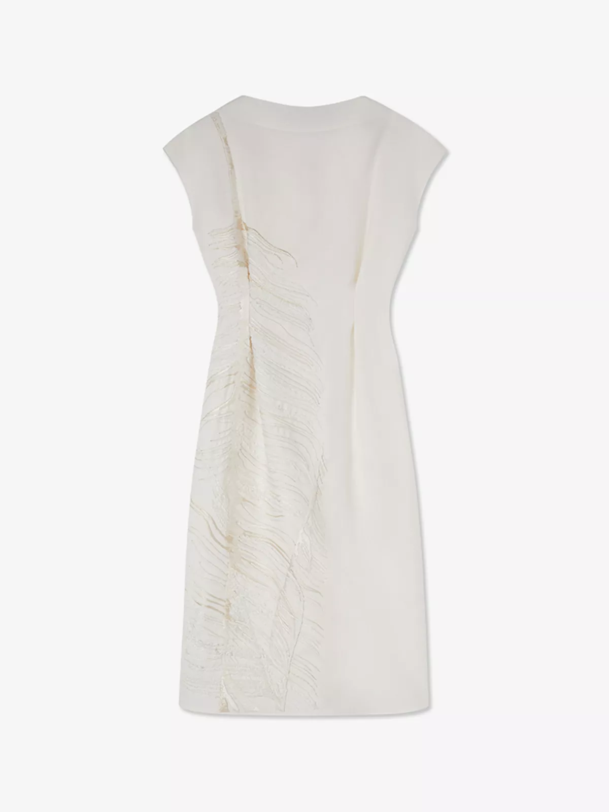 Wool-silk mid-length dress with hand-embroidered feather detailing. It has capped sleeves, a nipped-in waist, and a back zip fastening with our signature ‘A’ puller.