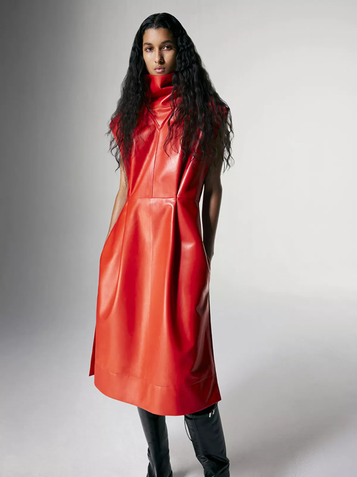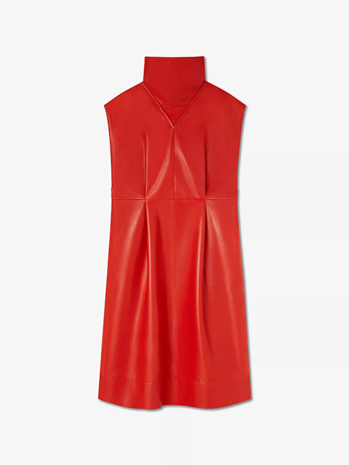 Sleeveless leather dress, with a double-layered neckline, back pleats, two side seam pockets and side slits. It has a back zip fastening with our signature ‘A’ puller.