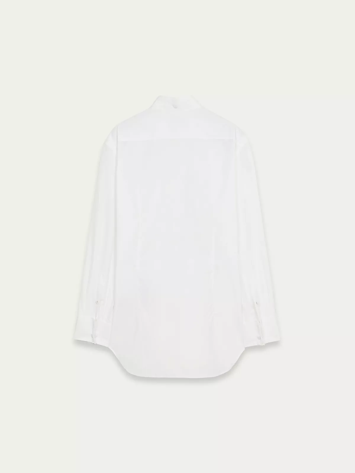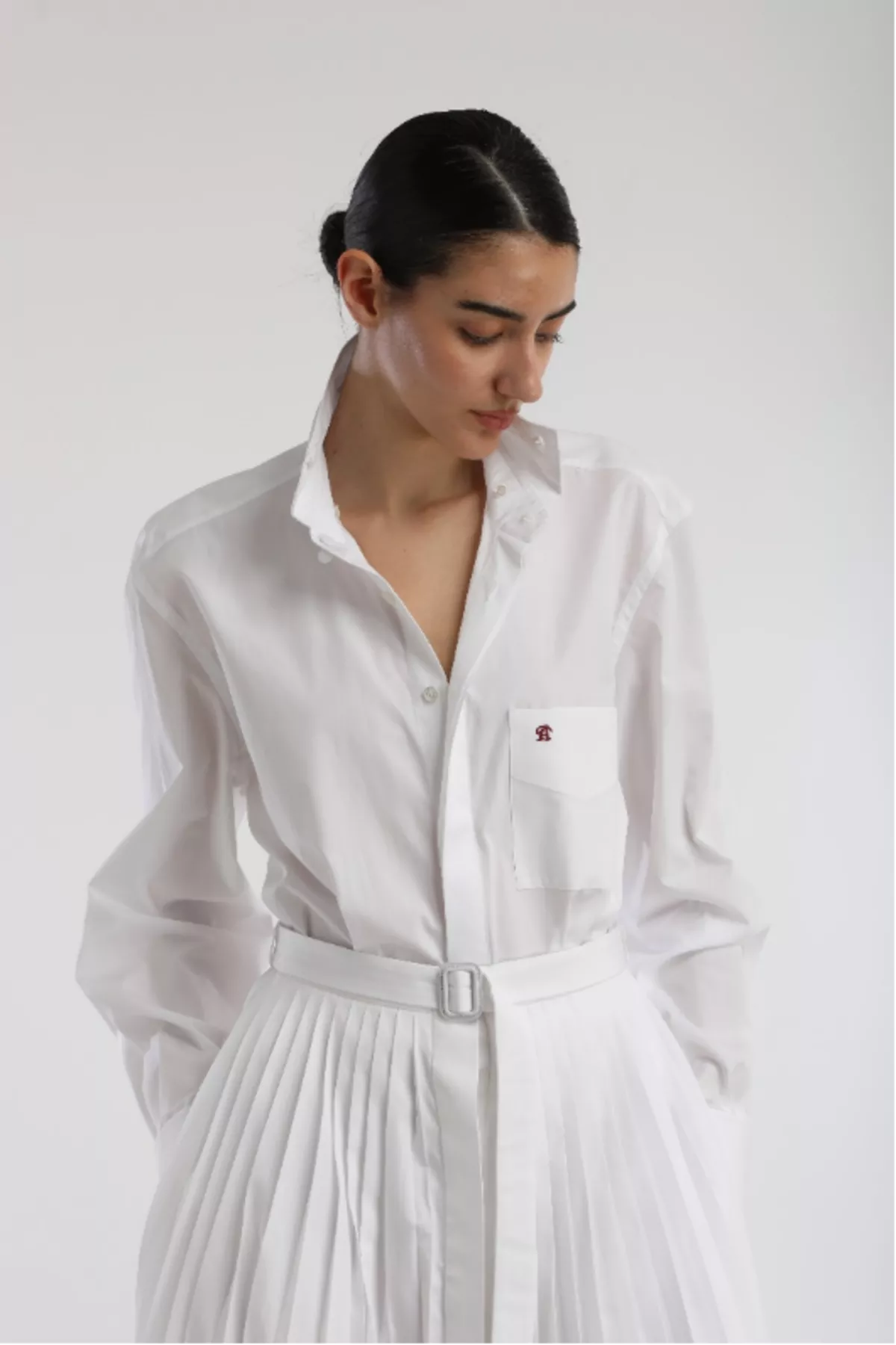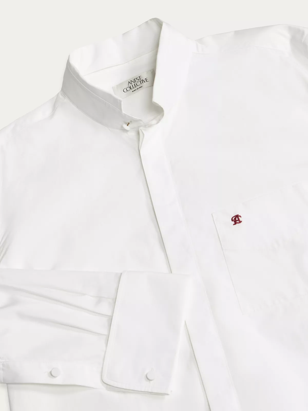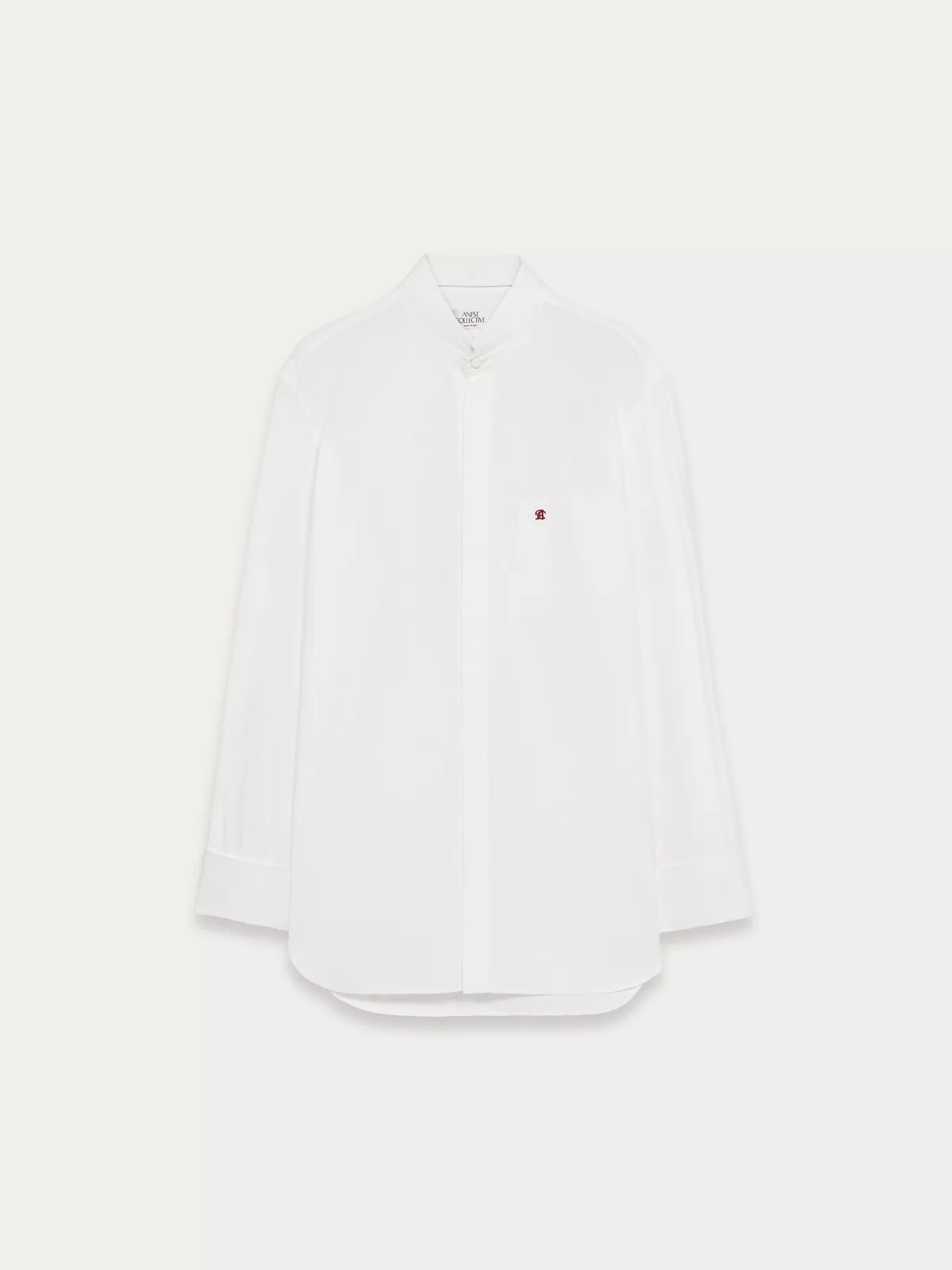 White poplin shirt. Anest embroidered logo with burgundy color thread on the front panel. Relaxed fit. Hidden mother of pearl buttons and poplin covered buttons on collar and cuffs.