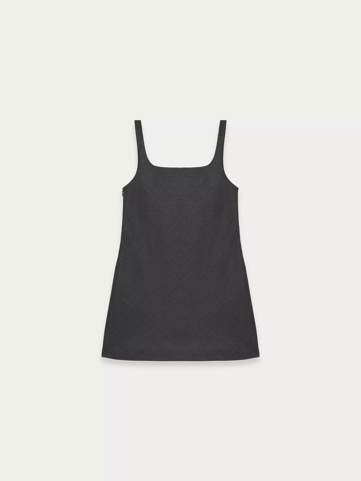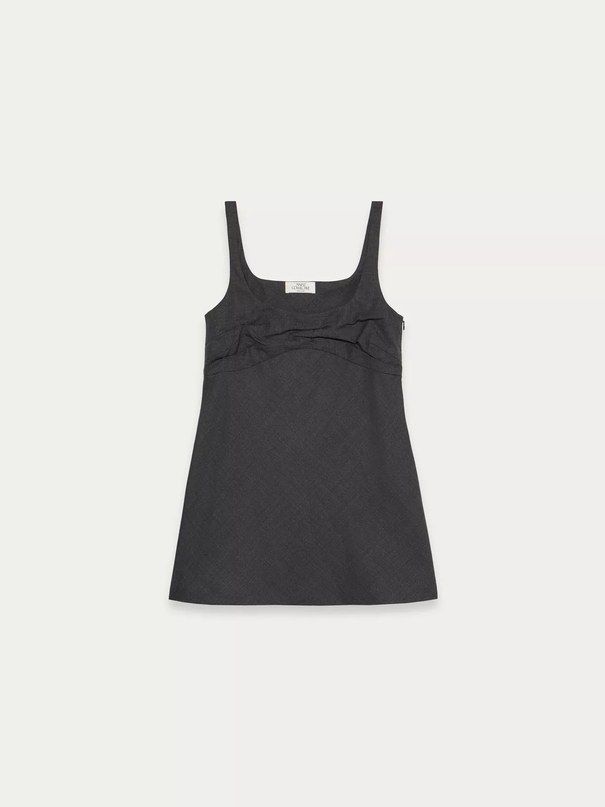 Here this style is fashioned in a lightweight sartorial grisaille wool, with a hand crushed draped bust detail. To help elevate the style so that it can be worn as statement pieces for everyday dressing, as either a top worn over a shirt or simple sweater and paired with a pant or skirt. Or on its own as a mini dress.