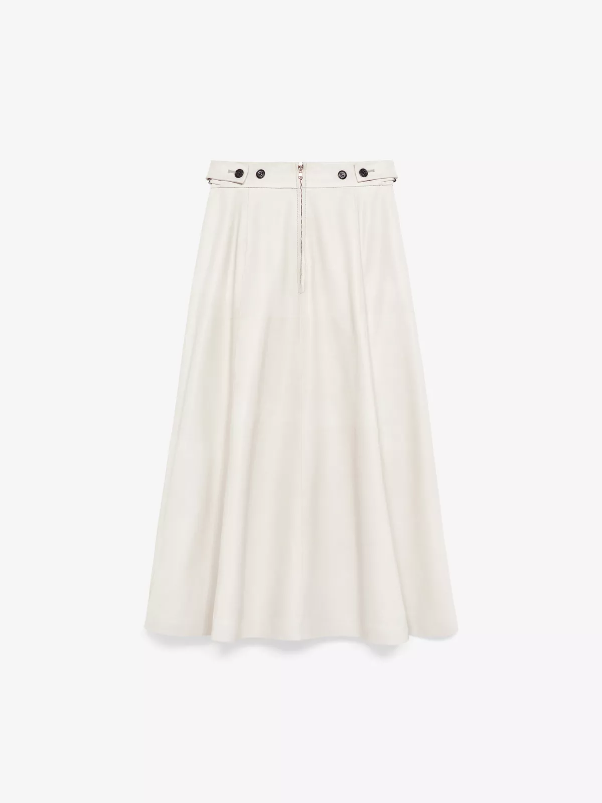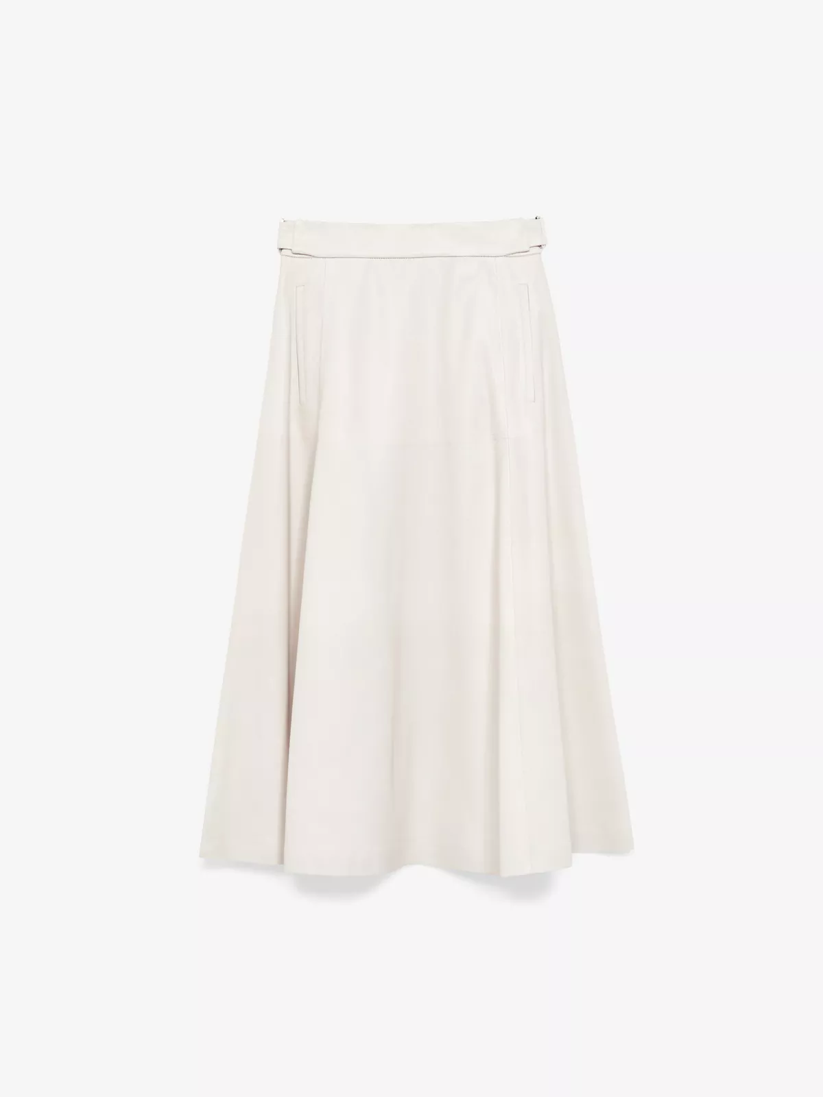 这条意大利产的中长半裙是用柔软的小牛皮革制成的,有着精致的A字轮廓。全里衬的设计让舒适与顺滑加成。高腰设计配以鞍点刺绣工艺,细节十足。