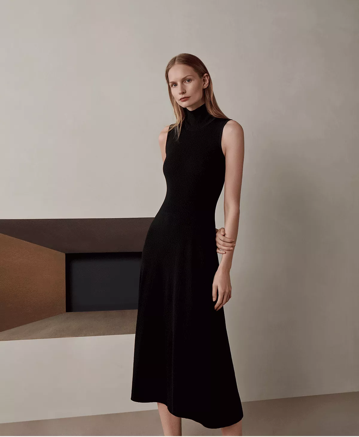 Textured with a ribbed finish it features a sleeveless cut. This simple A-Line silhouette is made from softy ultra-fine viscose in a ribbed knit that cascades on the body and can be worn through the warmer months.