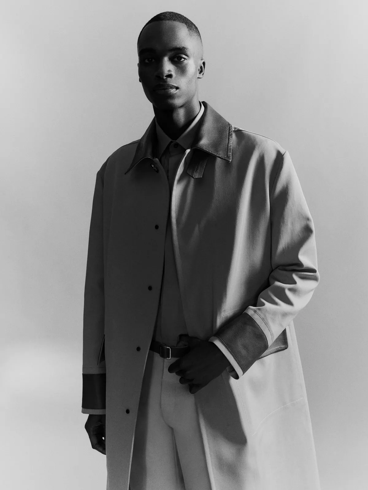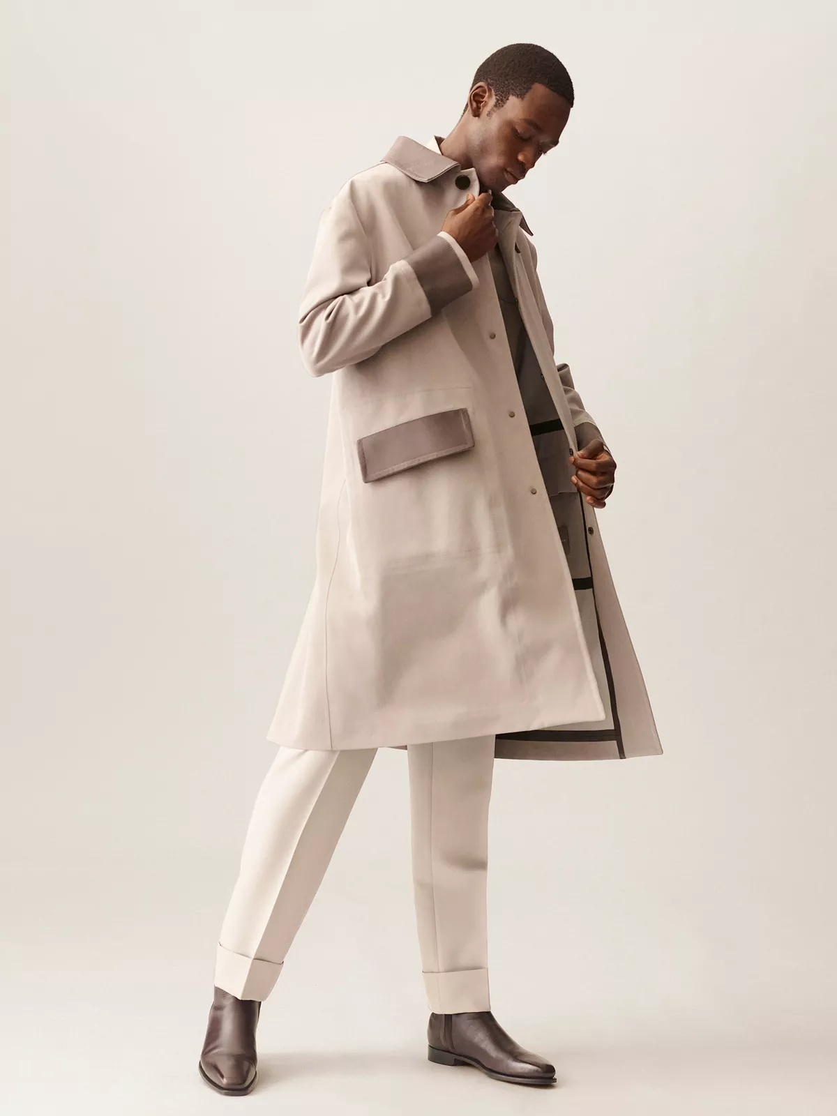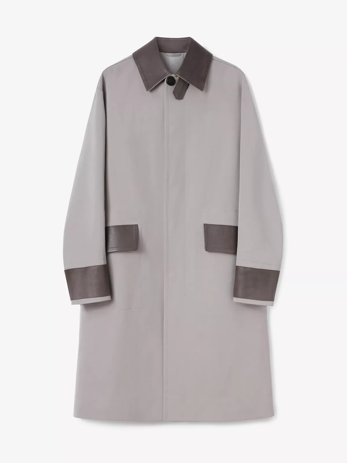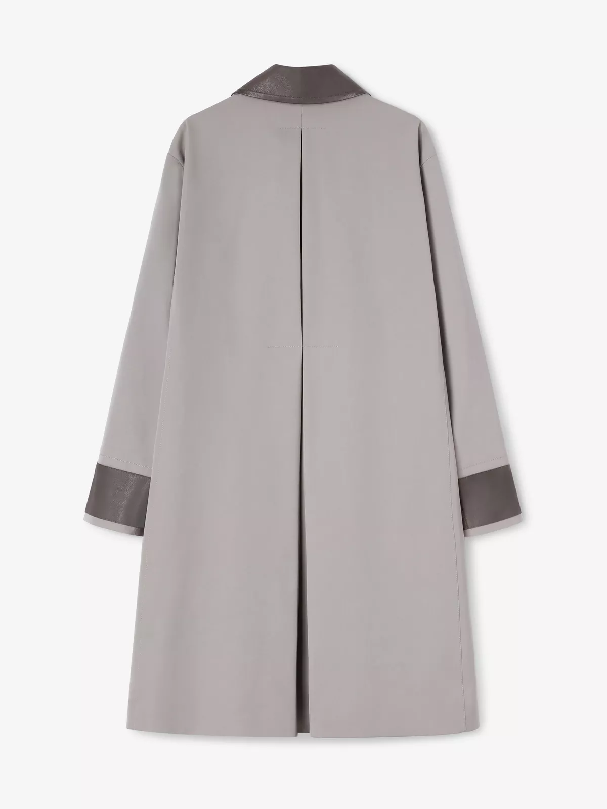 This elegantly oversized trench coat is made from a wool and cotton blend with contrasting calfskin detailing on the collar, flap pockets and cuffs and a concealed placket.