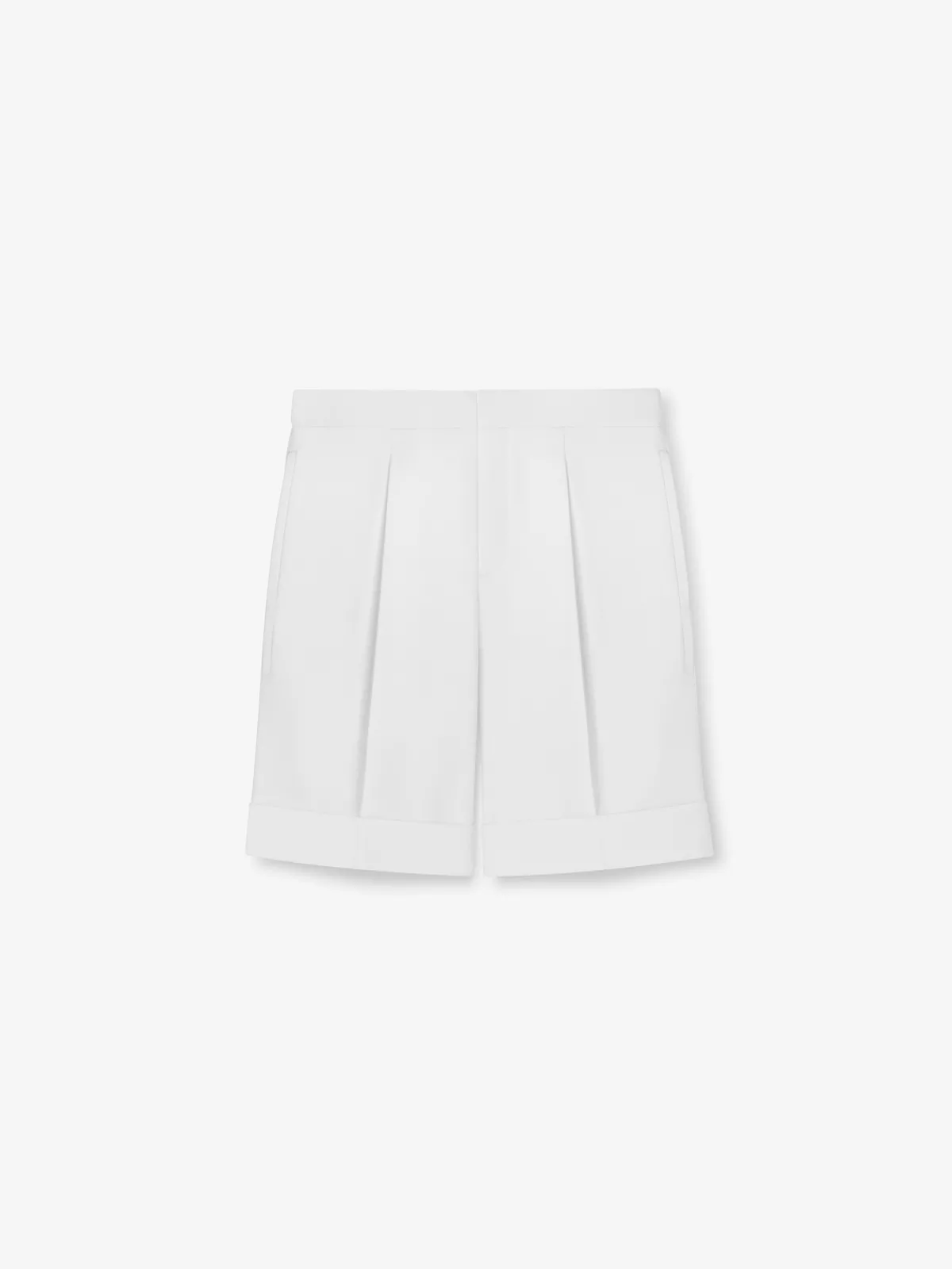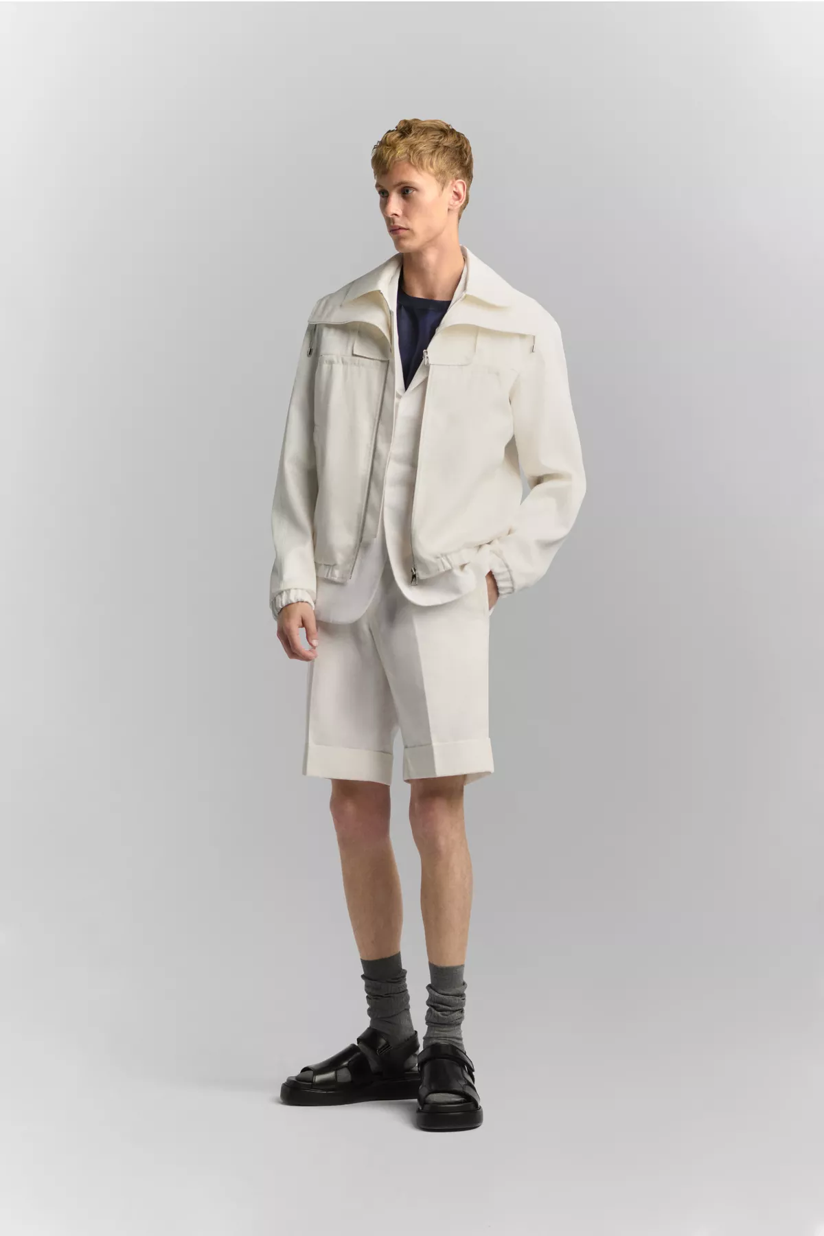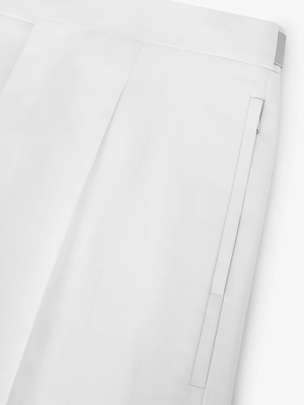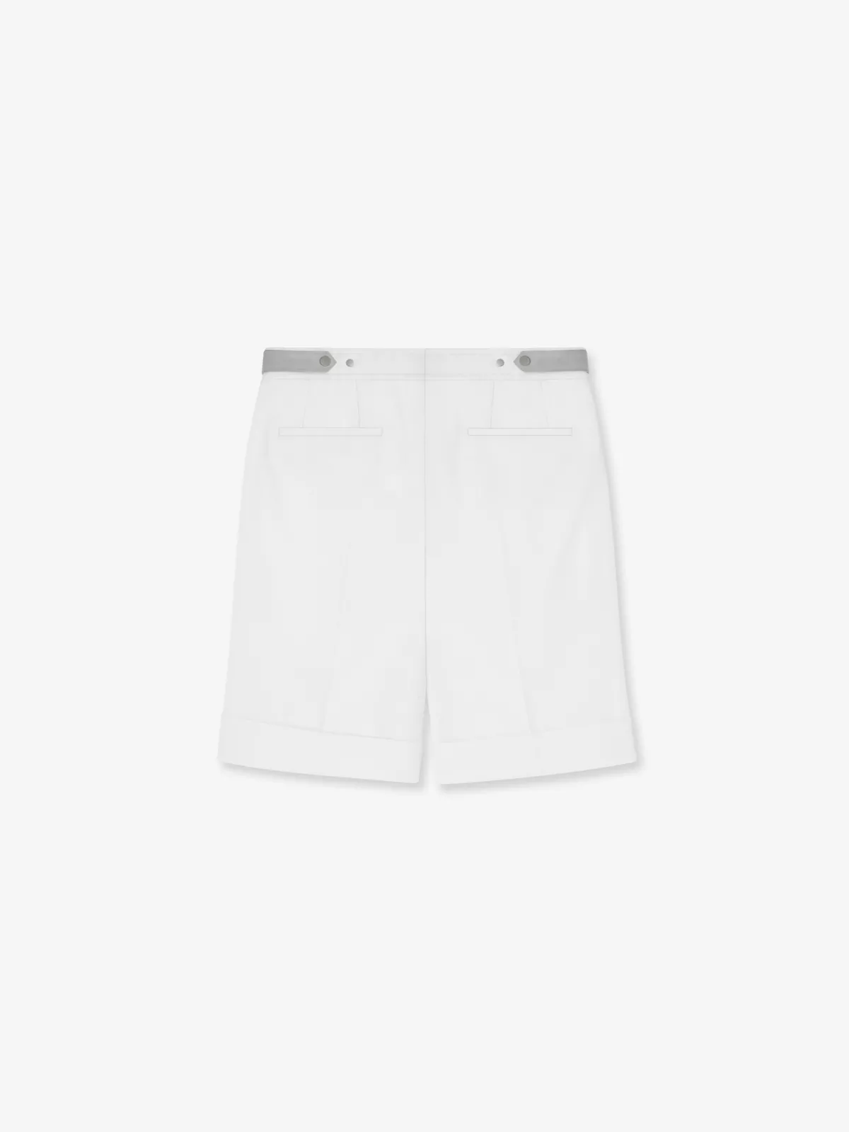 Cotton Linen Shorts with leather details in Ivory/Soft Grey This regular fit shorts are cut in cotton linen twill fabric; they feature side leather adjusters and special zipped pockets.