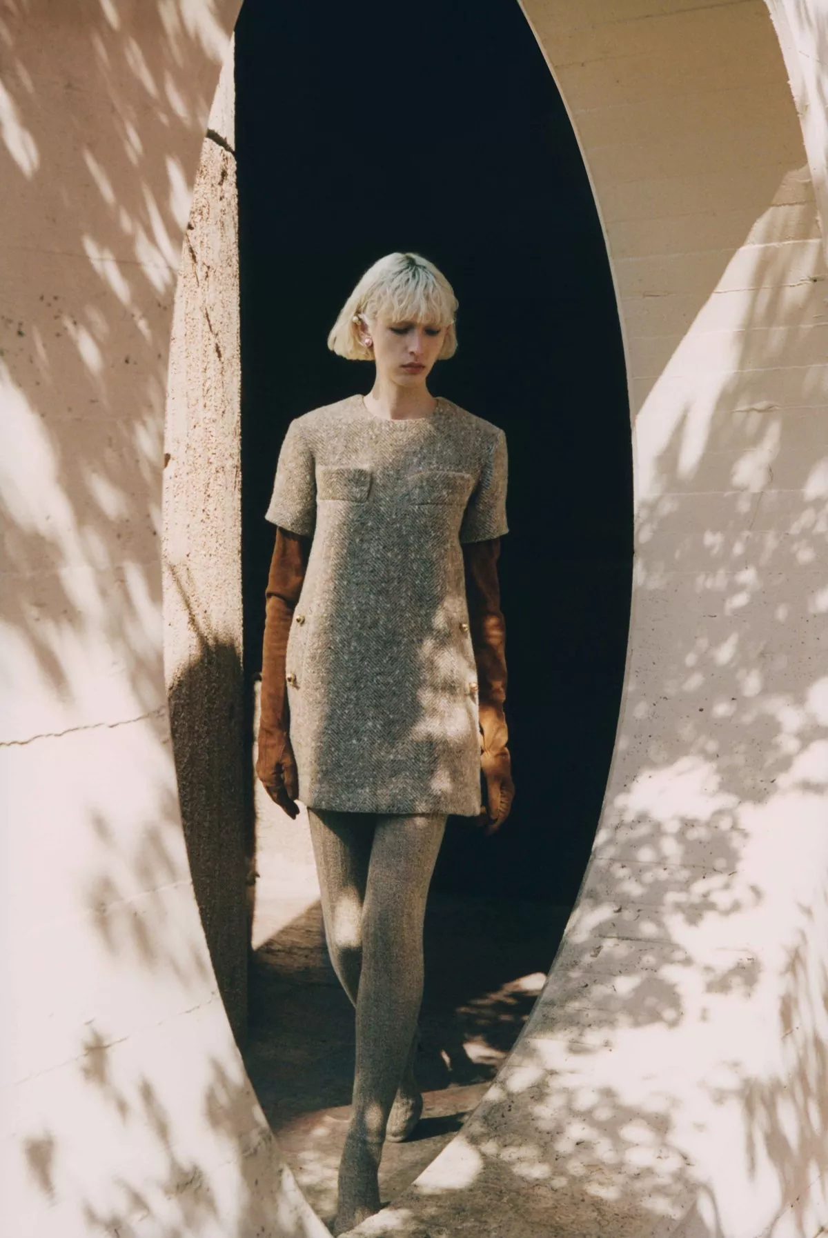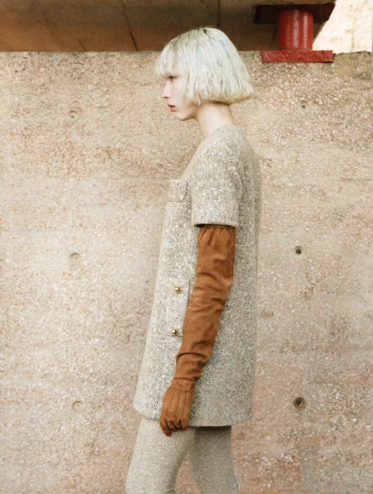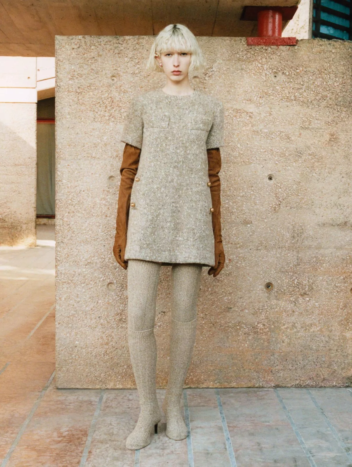 这款连衣裙兼具羊毛的温暖精致与轻盈质感,适合室内或过渡季穿着。短款设计显年轻现代,人字纹编织则奠定经典正装基调。